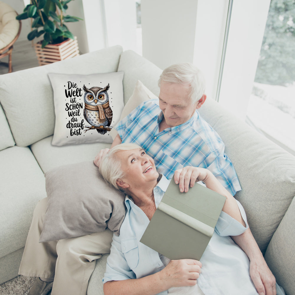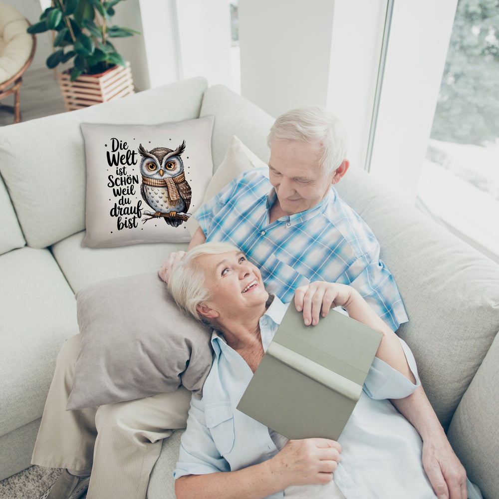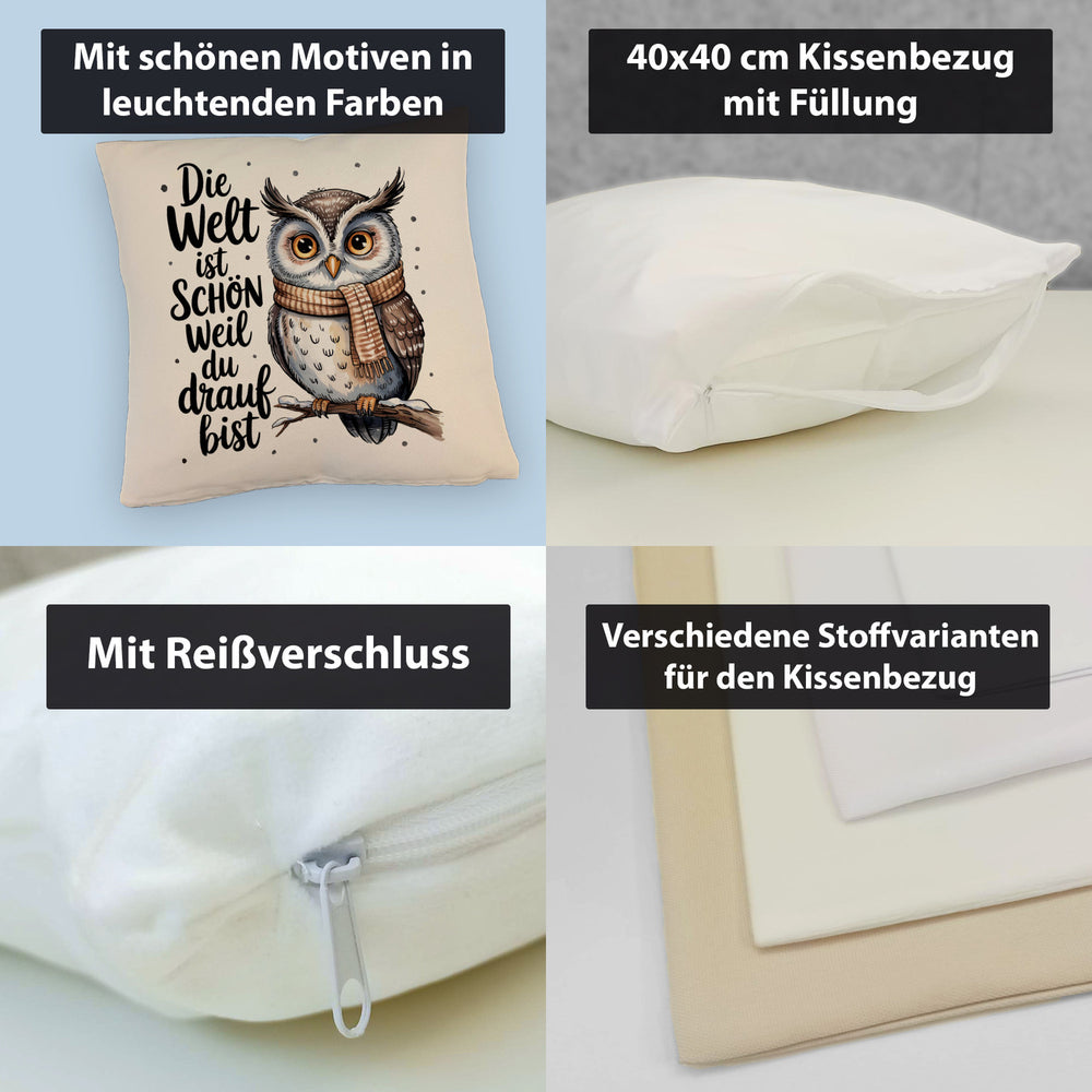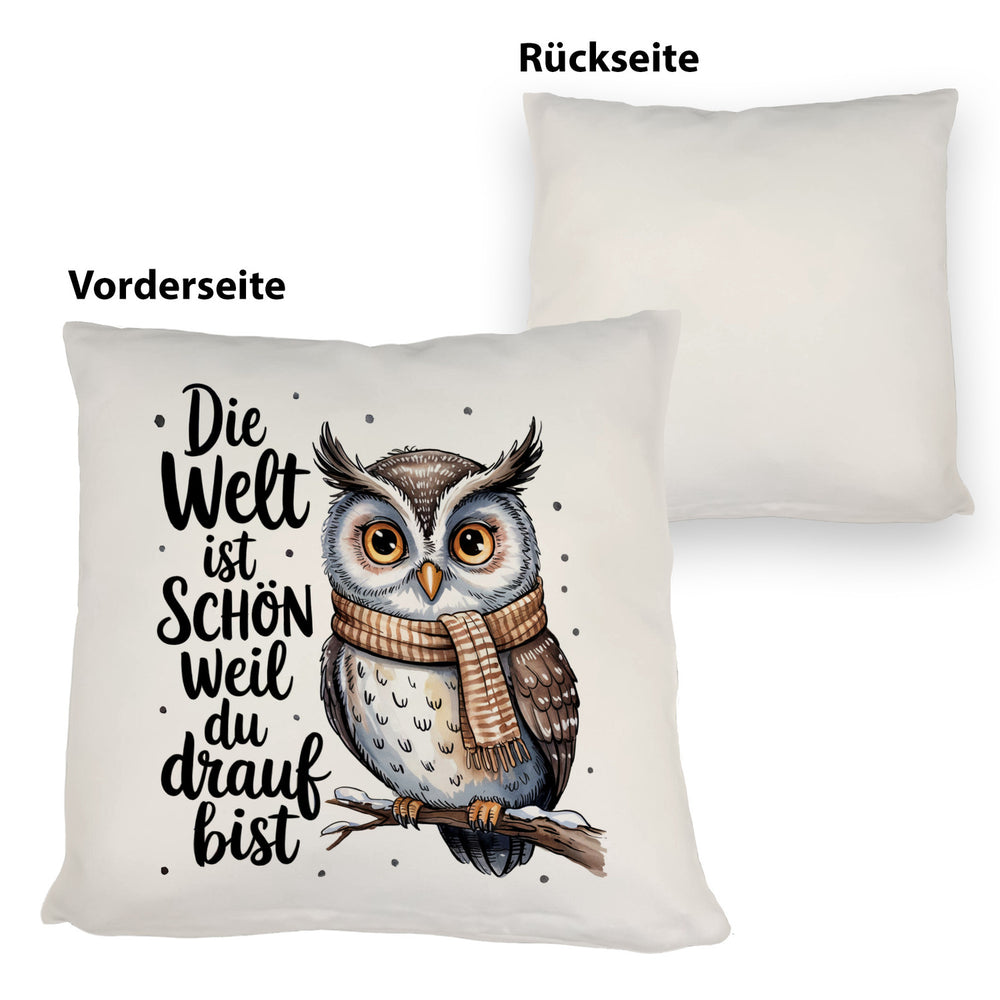 - Dieses bezaubernde Kissen zeigt eine niedliche Eule in Aquarellillustration, die einen beige gestreiften Schal trägt und mit großen, bernsteinfarbenen Augen auf einem schneebedeckten Ast sitzt. Der Text "DIE WELT IST SCHÖN WEIL DU drauf BIST" verleiht dem Motiv eine persönliche Note. Perfekt für jede Winterdeko und mit Handlettering versehen.