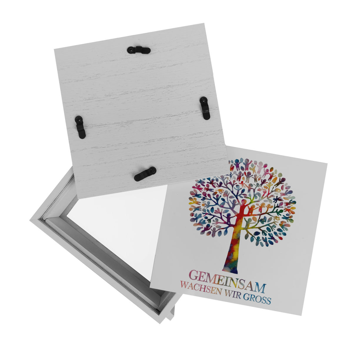 - Die Gemeinsam wachsen Spardose zeigt ein farbenfrohes Aquarell mit einem majestätischen Baum, dessen Äste aus fröhlich Hand haltenden Kindern bestehen. Der Hintergrund ist weiß, während pastellfarbene Blätter jede Silhouette verzieren. Am Rand steht in großen Buchstaben: "GEMEINSAM WACHSEN WIR GROSS".