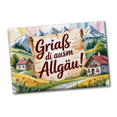 - Der eckige Magnet zeigt ein Aquarellmotiv der Allgäu-Landschaft mit dem Spruch "Griaß di ausm Allgäu!". Die rustikale Szene vereint bayerische Bauernhäuser, blumengeschmückte Fensterkästen und schneebedeckte Alpengipfel auf gealtertem Pergamentpapier. Perfekt, um den malerischen Charme des Allgäus auf Ihrem Kühlschrank zu verbreiten.