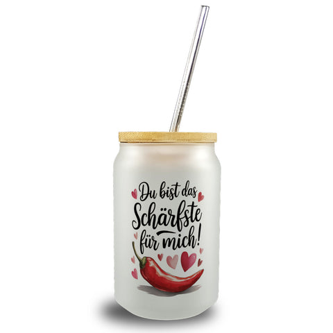 Du bist das Schärfste für mich Rote Chili mit Herzen Trinkglas mit Bambusdeckel