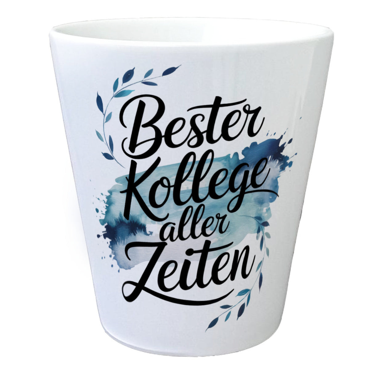• Der Blumentopf ist ein echter Hingucker! Auf weißem Grund prangt der Schriftzug "Bester Kollege aller Zeiten" in pastellfarbenem Aquarell-Design. Zarte Blattmuster und ein Pokal betonen die Botschaft. Das harmonische, dynamische Design in Blau- und Türkistönen bringt frischen Wind auf jeden Schreibtisch.