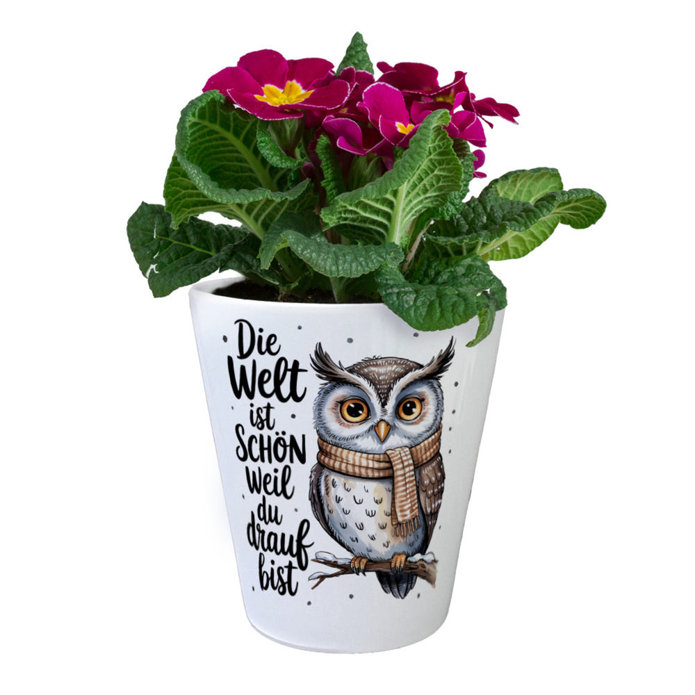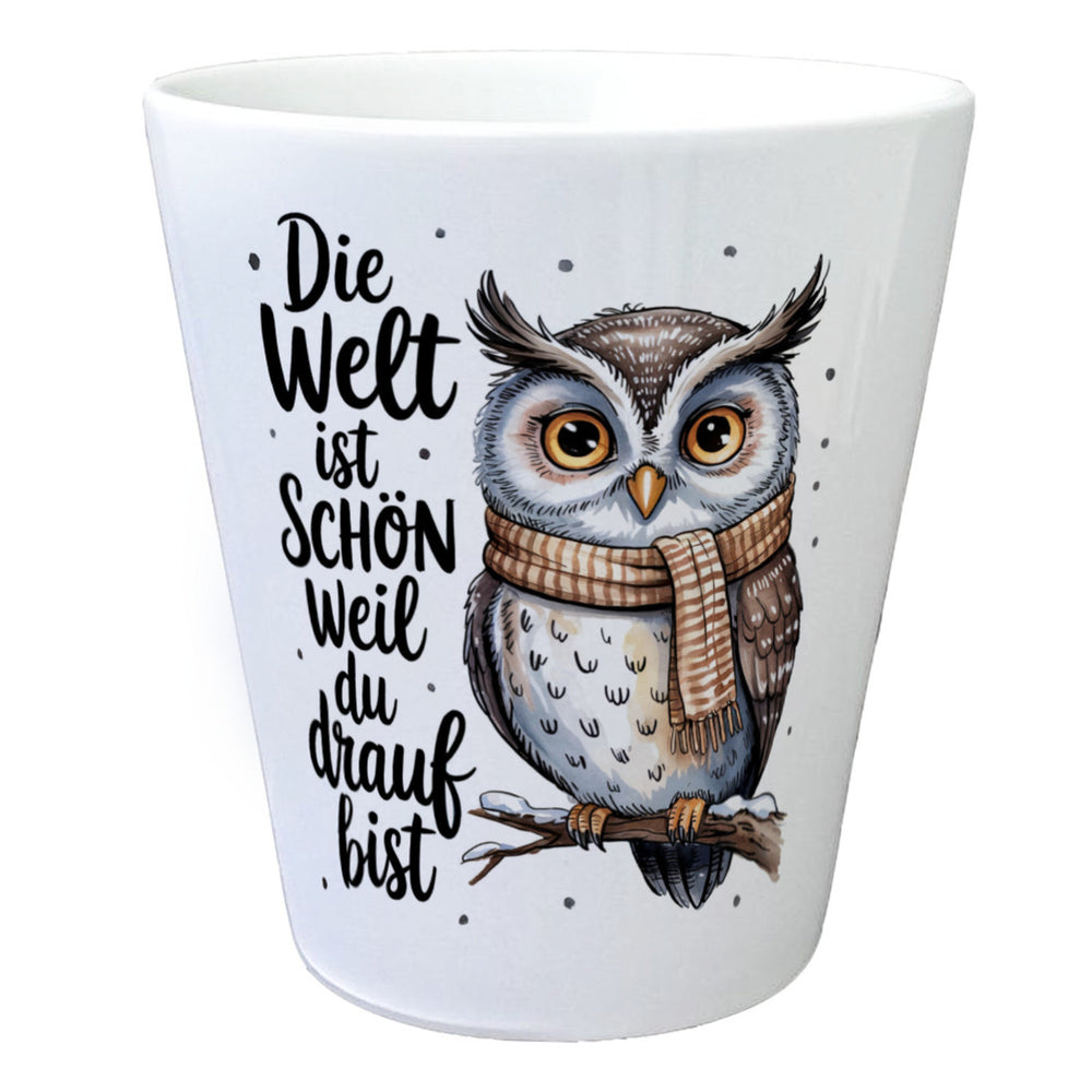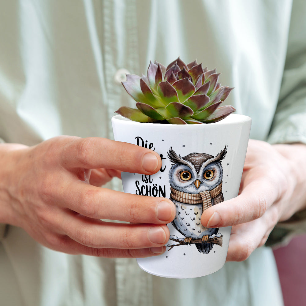 - Unser wundervoller Eule mit Schal Blumentopf zeigt eine bezaubernde Aquarell-Eule auf einem schneebedeckten Ast, mit großem bernsteinfarbenen Augen und einem weichen, verspielten Stil. Die Eule trägt einen schicken, beige gestreiften Schal und der handgeschriebene Spruch "Die Welt ist schön weil du drauf BIST" ziert den weißen Hintergrund.