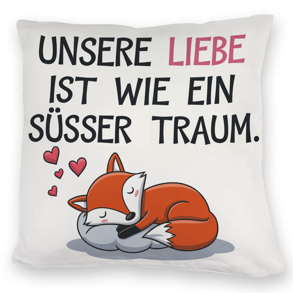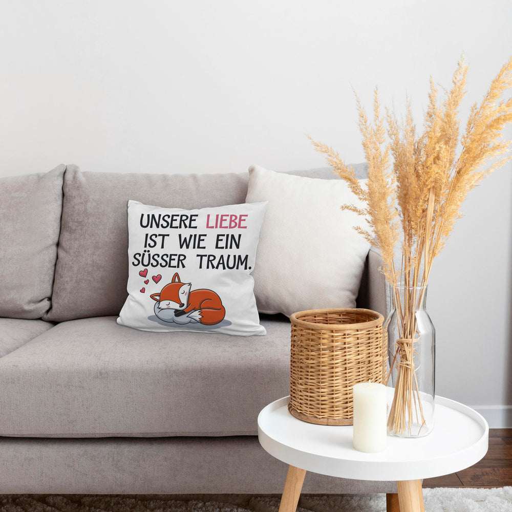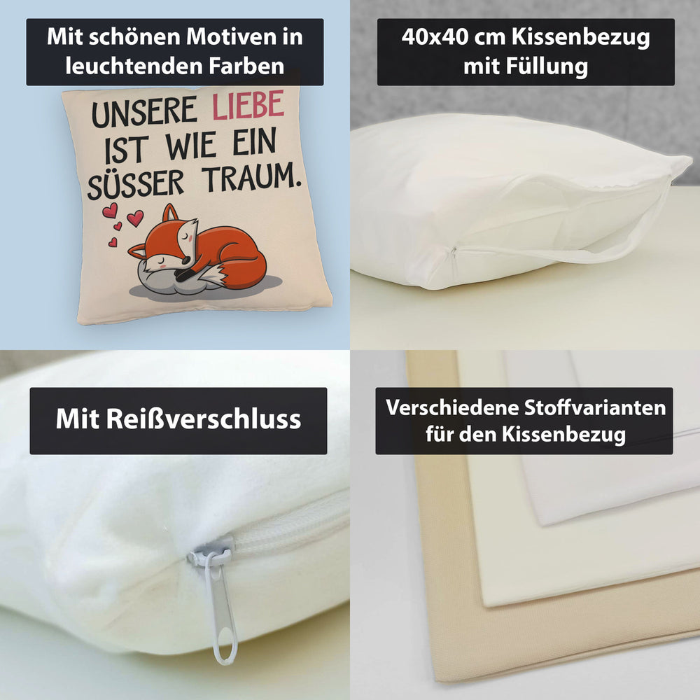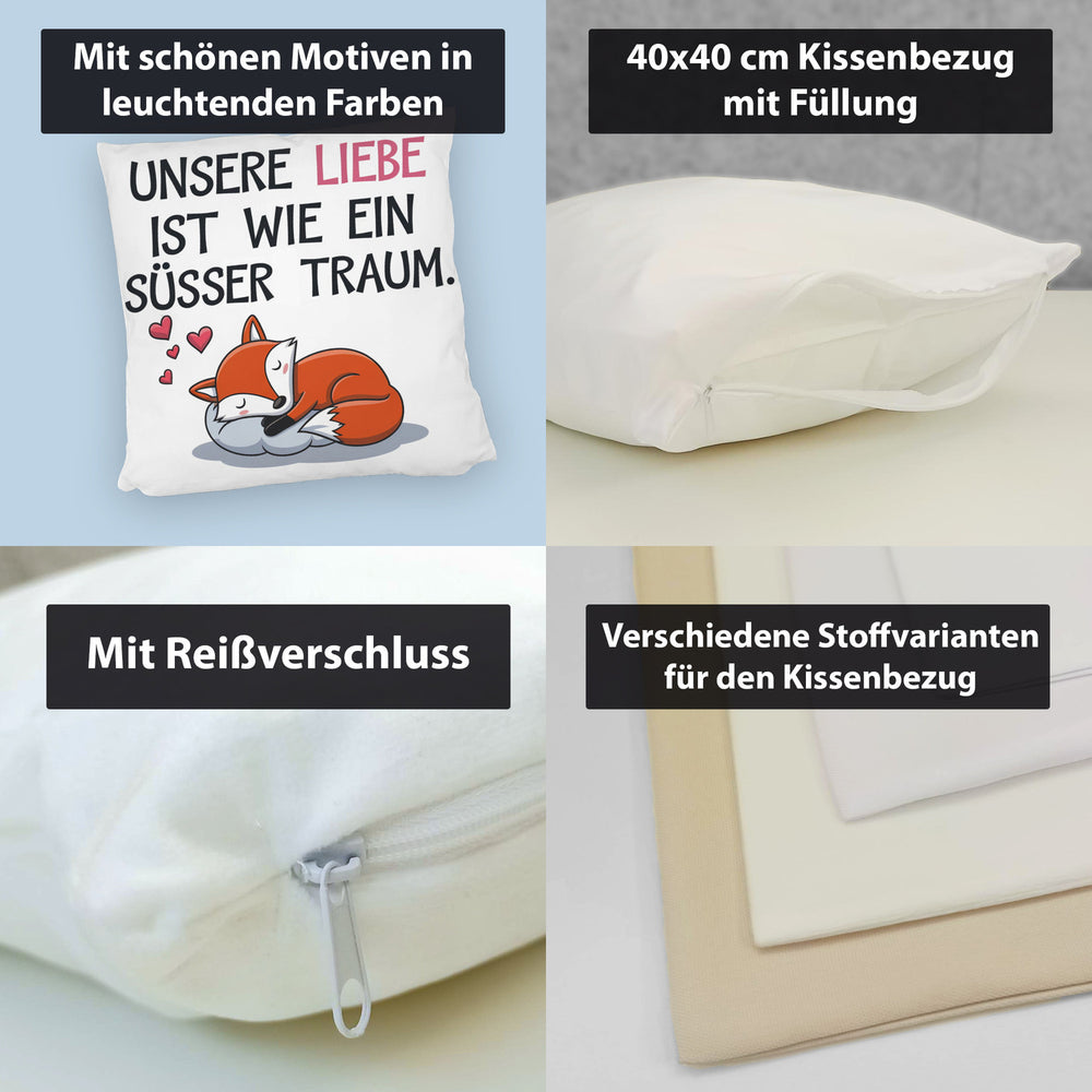 - Stell dir vor: Eine süße Füchsin schlummert friedlich auf einer Wolke, umgeben von Herzen. Der Hintergrund ist weiß, damit der liebevolle Spruch "Unsere Liebe ist wie ein süßer Traum" in leuchtenden Farben strahlt. Dieses Kissen im Cartoon-Stil ist der ultimative Hingucker in jedem Raum!