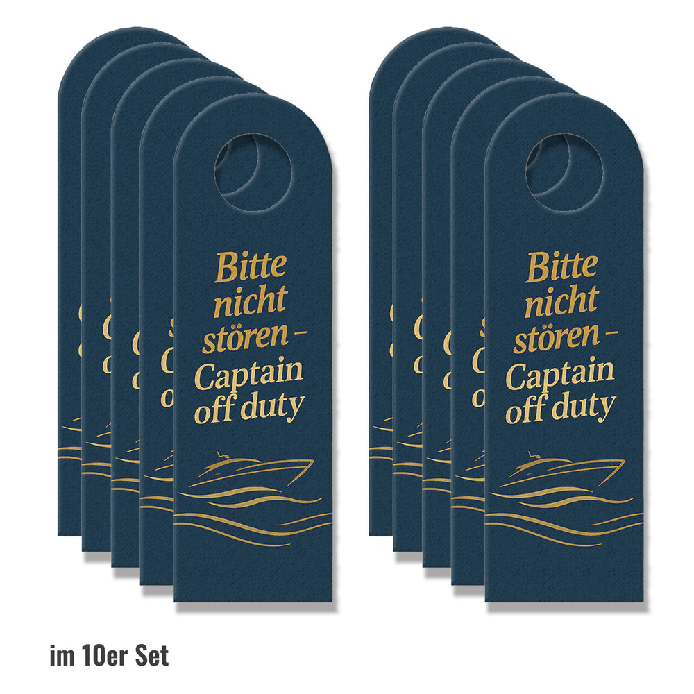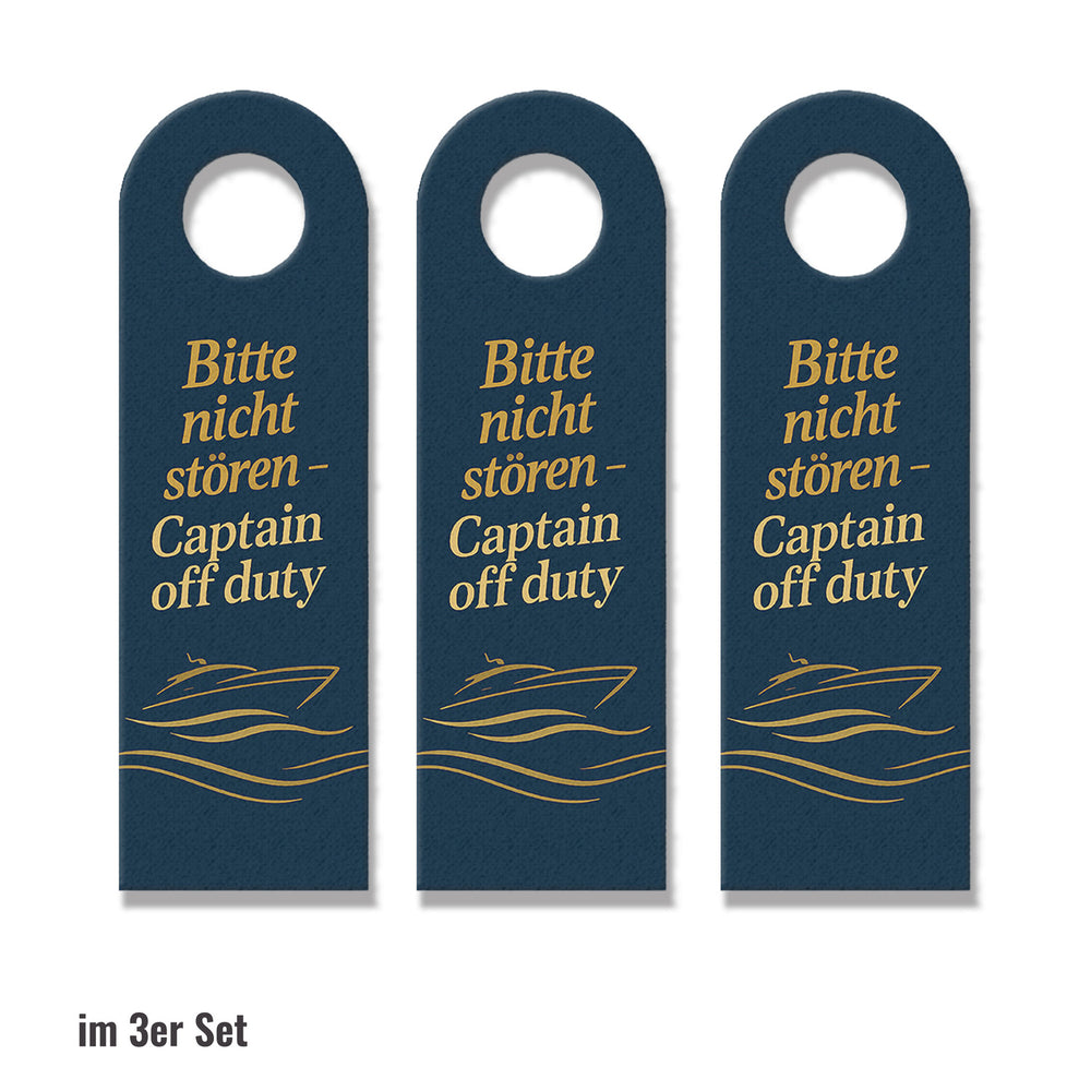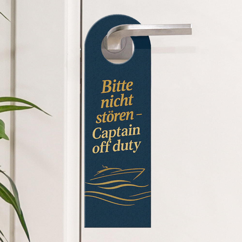- Entdecken Sie den lustigen Türhänger "Bitte nicht stören - Captain off duty" mit Schiffsmotiv! Dieses schicke Dekostück zeigt auf beiden Seiten identische Türschilder, einmal in Deutsch und einmal in Englisch. Die goldene Schiffillustration auf marineblauem und tiefblauem Hintergrund verleiht Ihrem Raum eine luxuriöse, maritime Note.