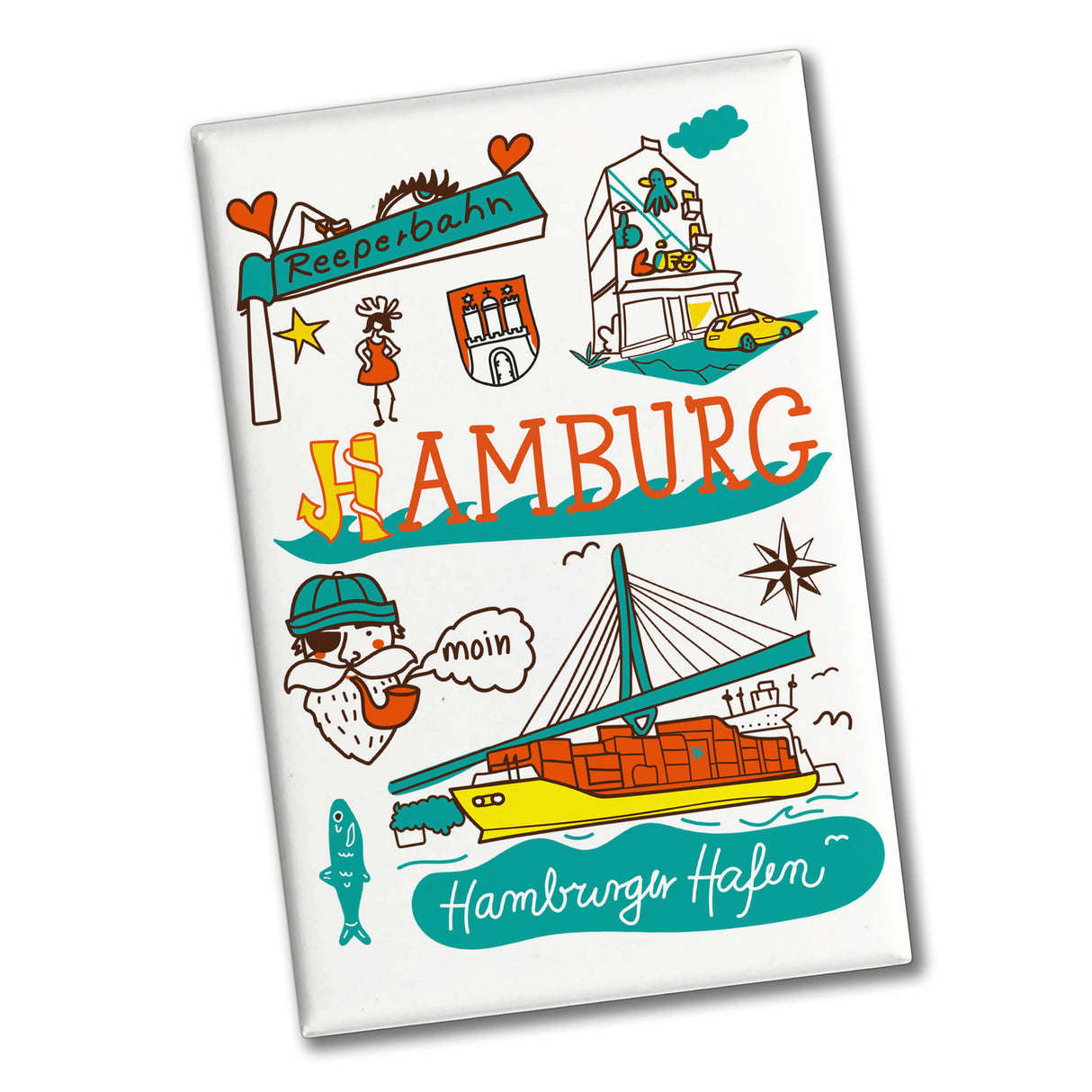 - Der Hamburg Wimmelbild Souvenir Magnet ist ein eckiges Meisterwerk voller Leben und Farbe. Mit dem auffälligen 'HAMBURG'-Schriftzug und dem ikonischen Hafen wird die Verbindung zur Stadt sofort klar. Details wie das 'Reeperbahn'-Schild, ein bärtiger Helmträger, ein Schiff und ein Fisch verleihen dem Magneten seine einzigartige Note.