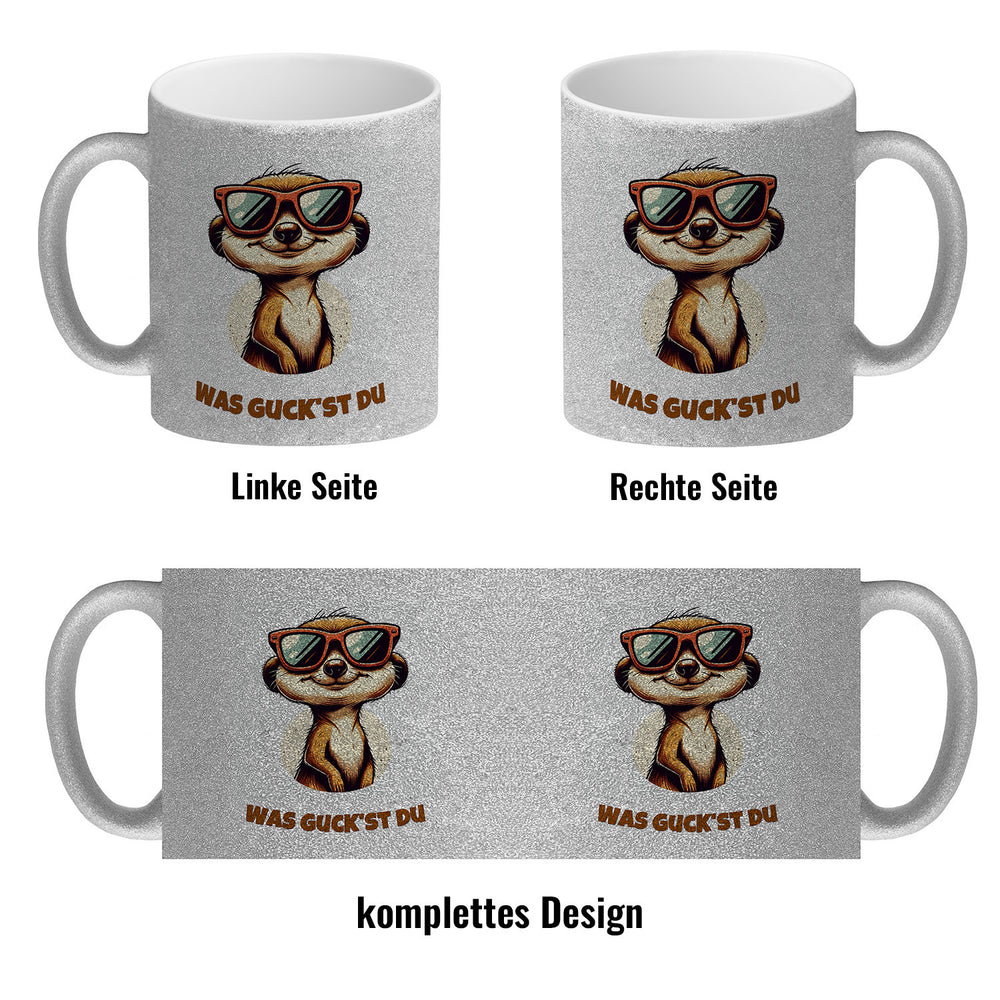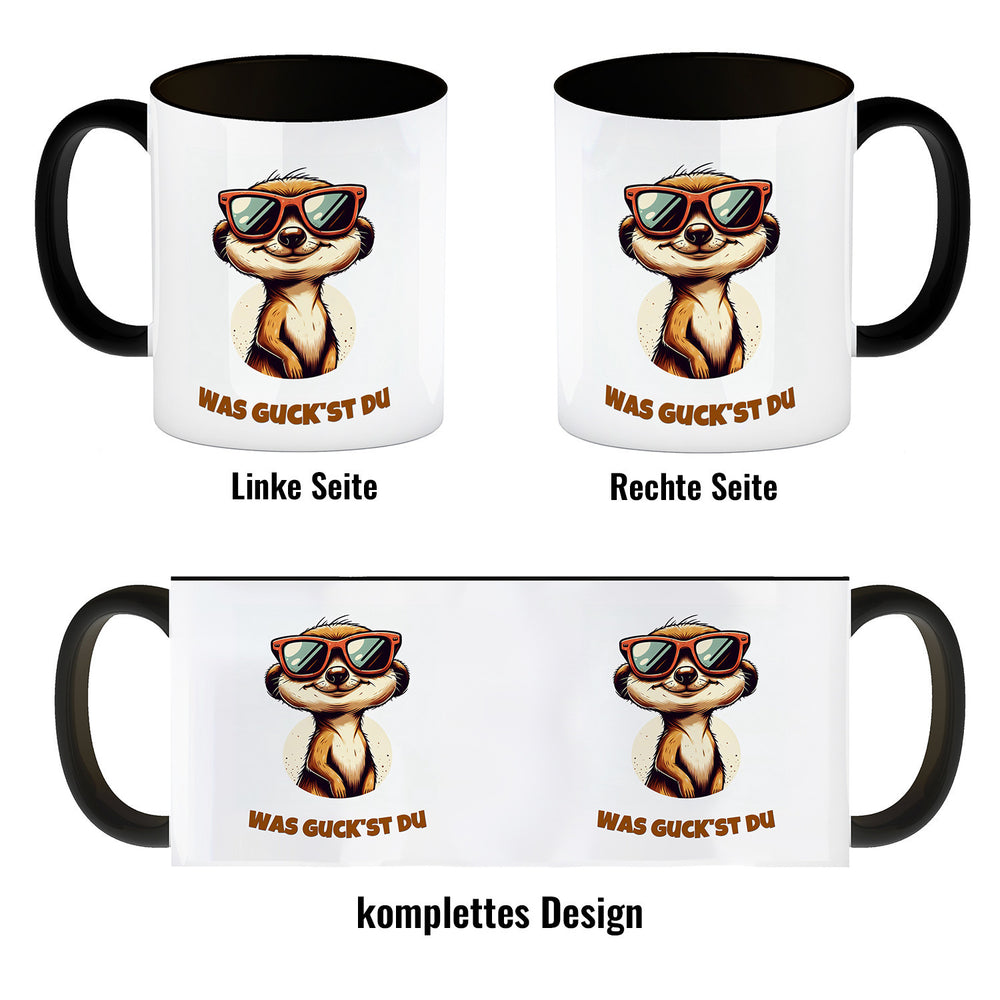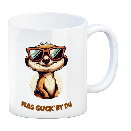 - 1x Erdmännchen Geschenke Kaffeebecher mit Spruch Was guckst du in der gewählten Ausführung