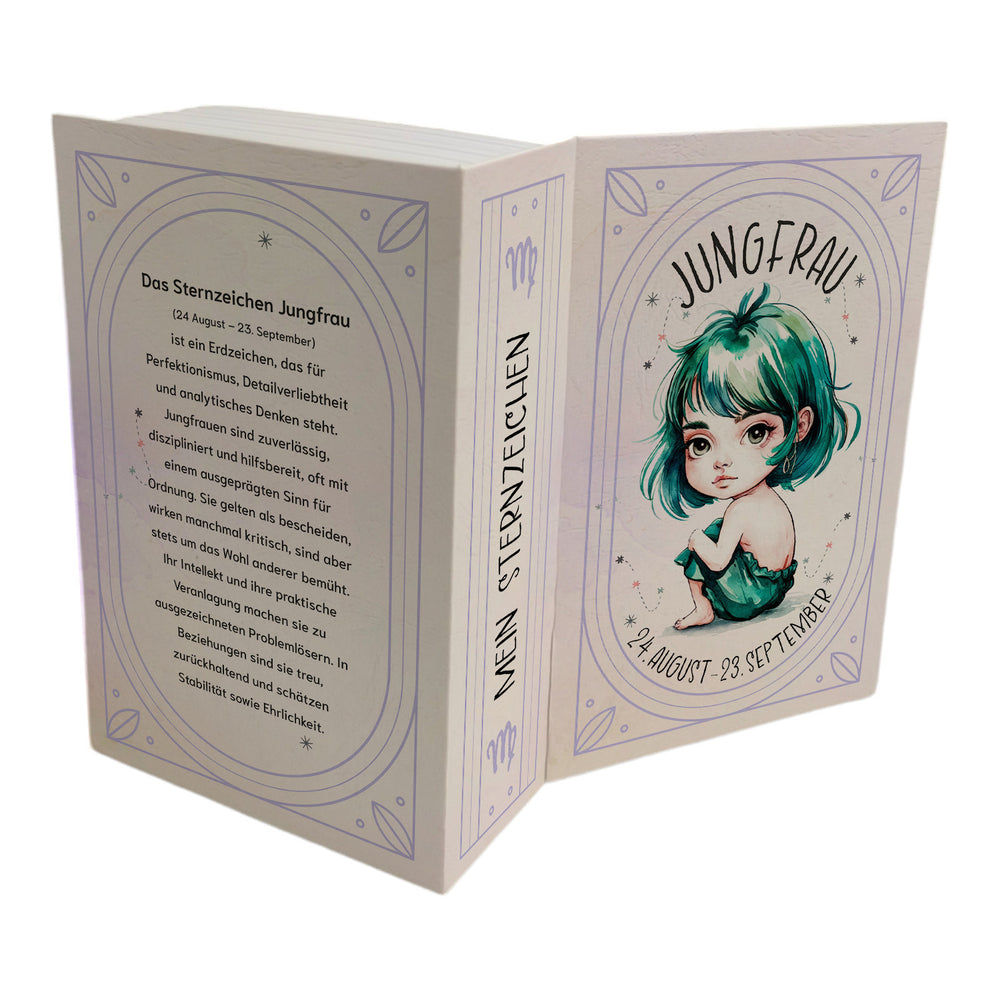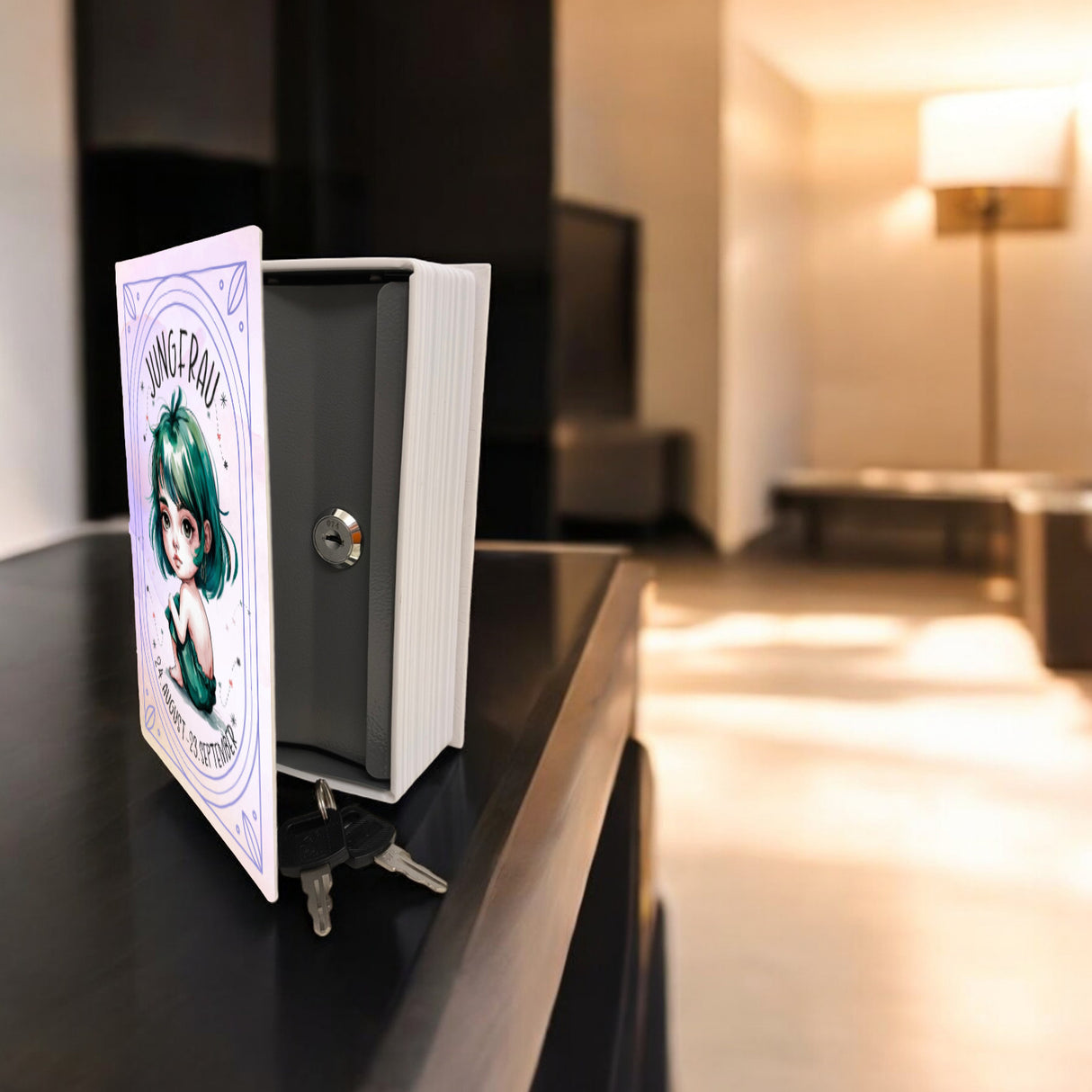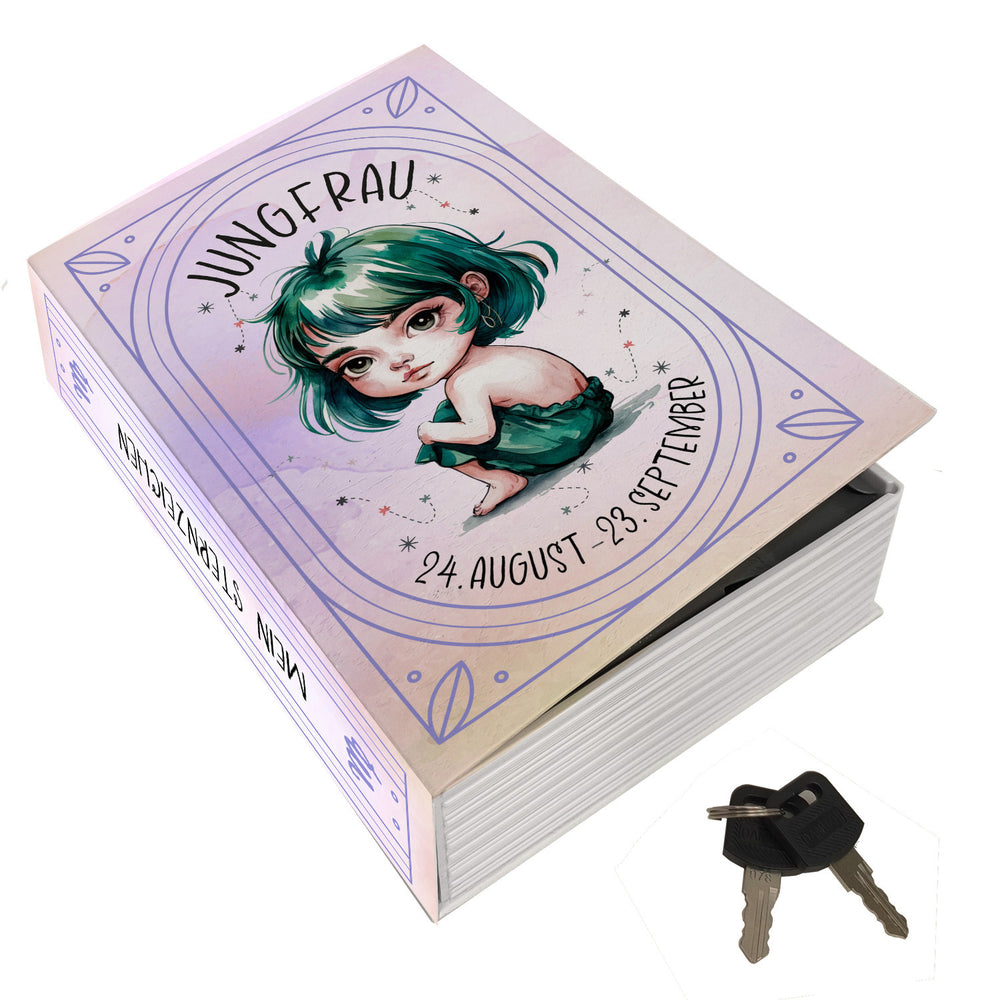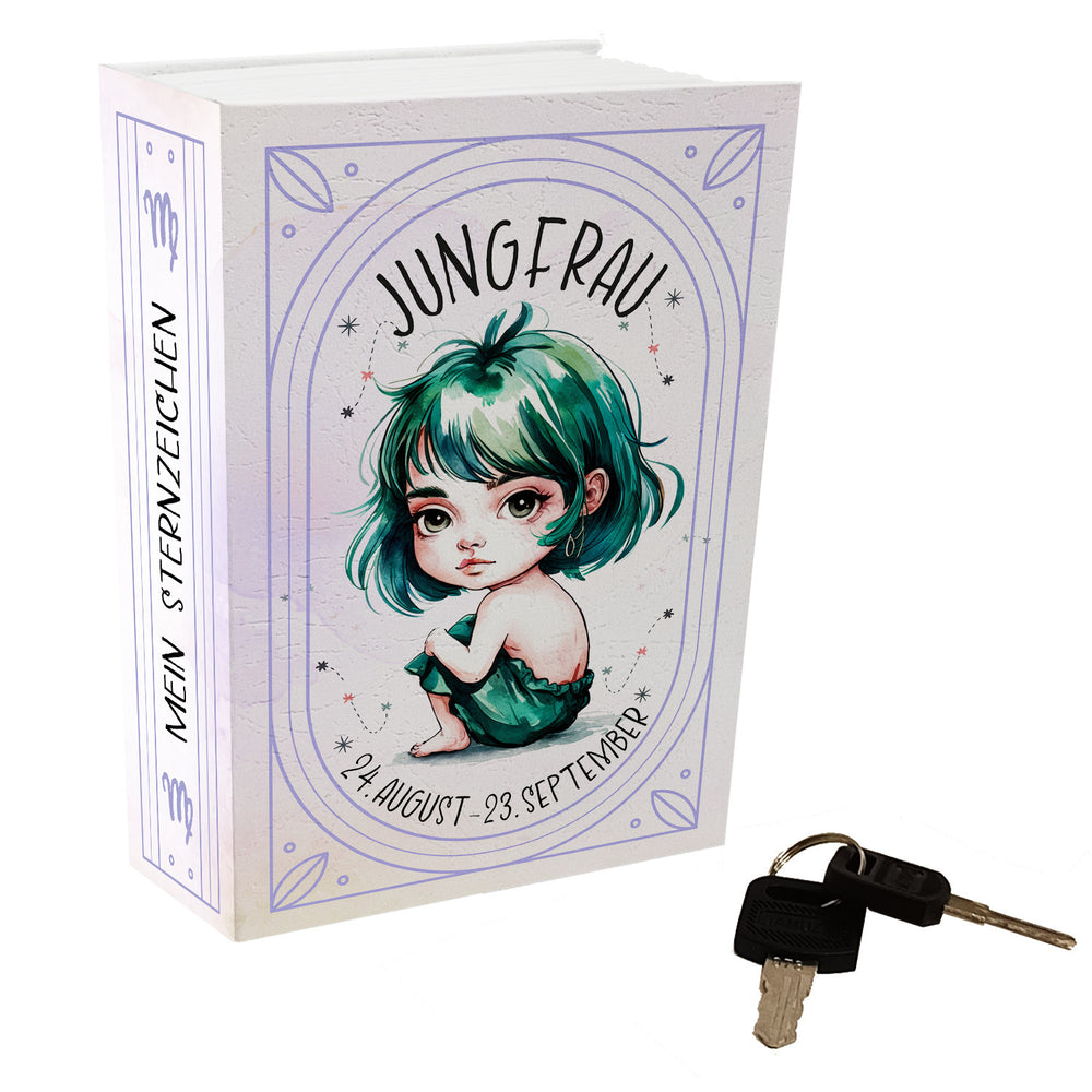 - Entdecken Sie den einzigartigen 'Mein Sternzeichen Booksafe - Jungfrau'. Das Cover zeigt ein bezauberndes Motiv mit einem nachdenklich sitzenden Mädchen mit grünen Haaren, umrahmt von Sternen und einem inspirierenden Gedicht über die Jungfrau. Ein traumhaftes Design für alle, die ihr Sternzeichen lieben!