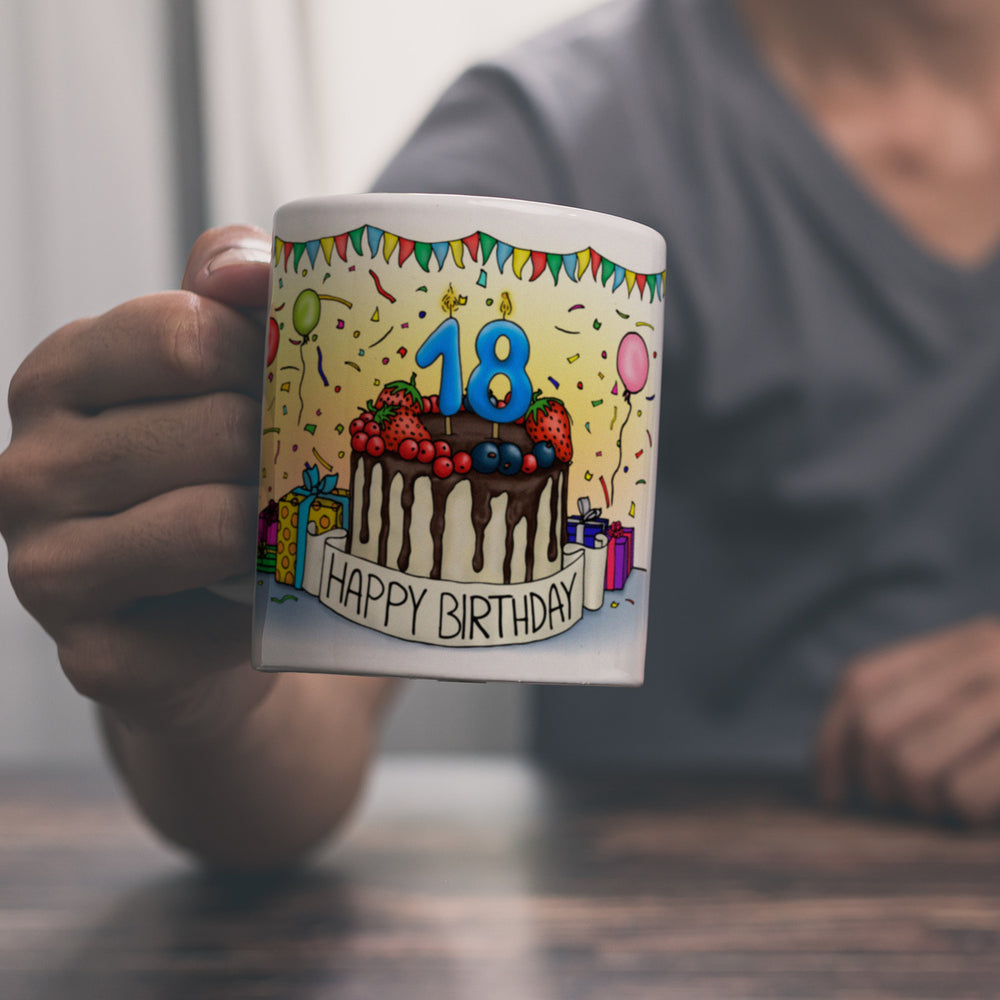 18. Geburtstag Tasse mit Kuchen und Geschenk und Anhänger: zum 6576. Tag