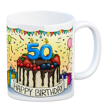 50. Geburtstag Tasse mit Kuchen und Geschenk und Anhänger: zum 18263. Tag