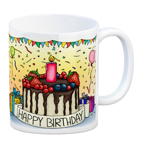 Kaffeebecher mit Geburtstagstorte Motiv und Spruch: Happy Birthday