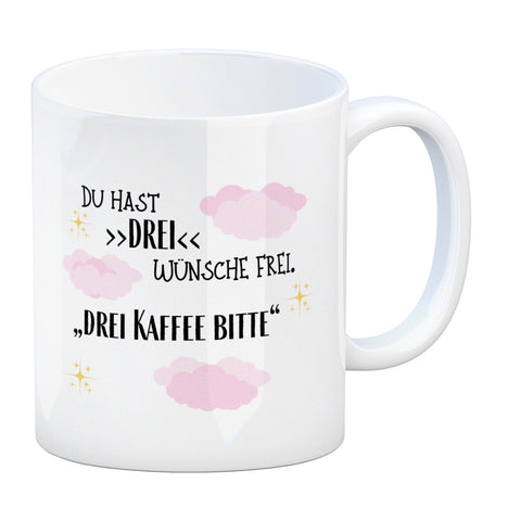 Drei Wünsche Frei Kaffeebecher mit Spruch Drei Kaffee bitte