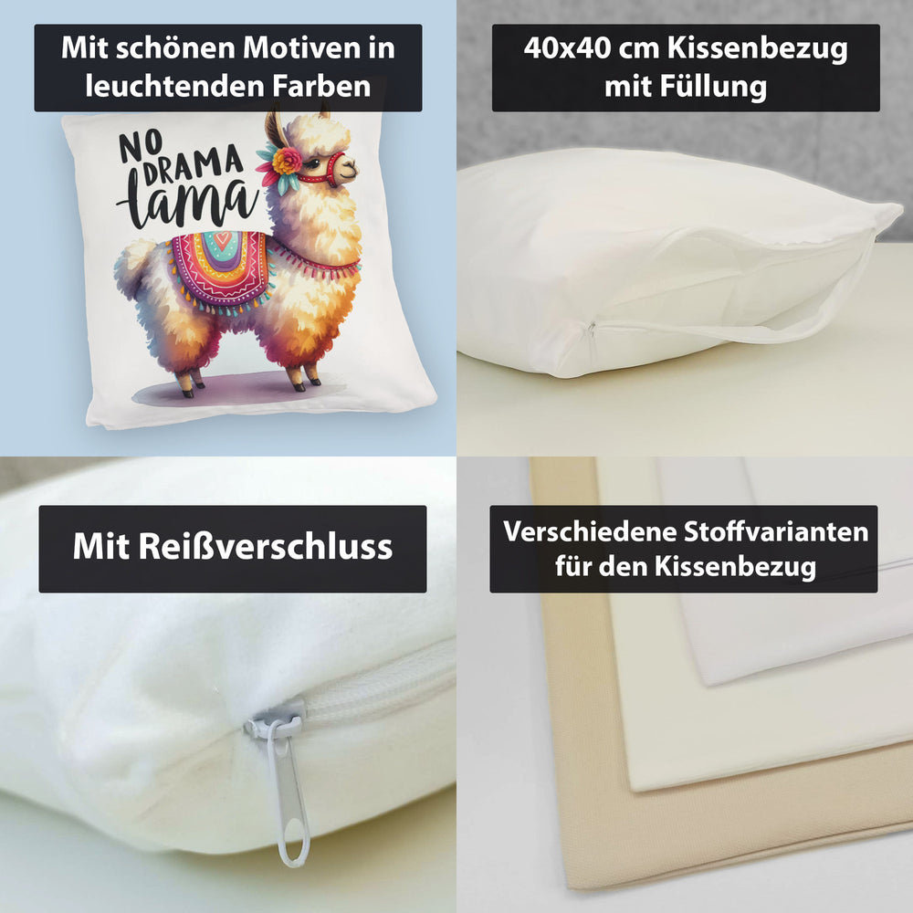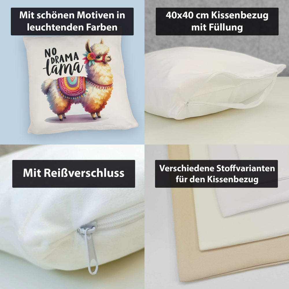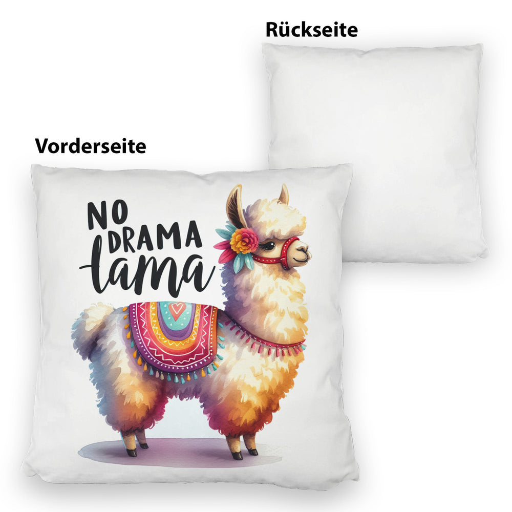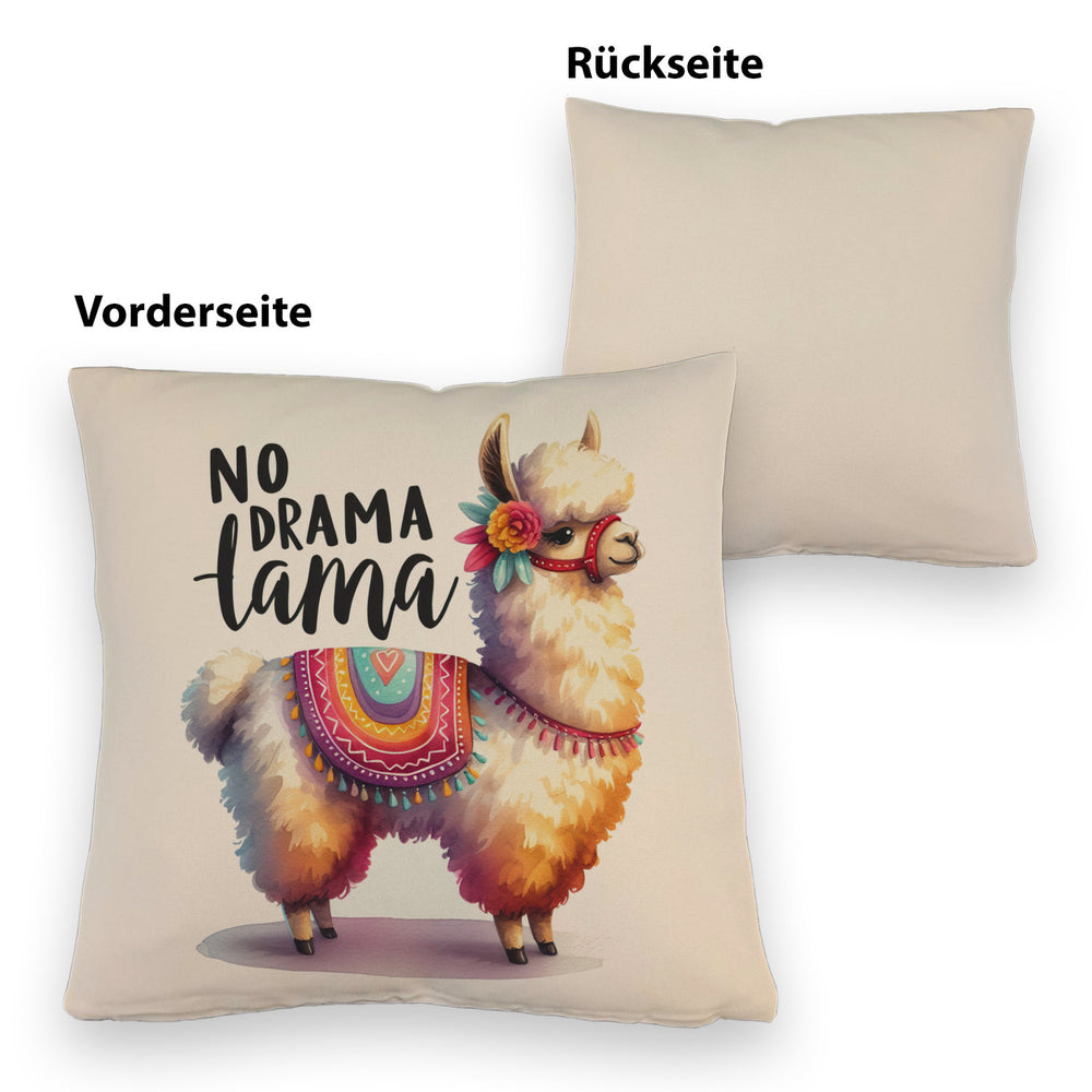 - 1x Alpaka mit bunter Satteldecke Kissen mit Spruch No Drama Lama in der gewählten Ausführung