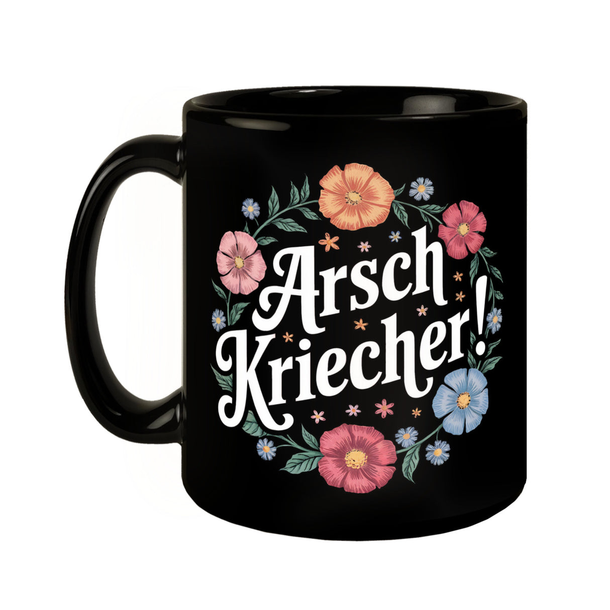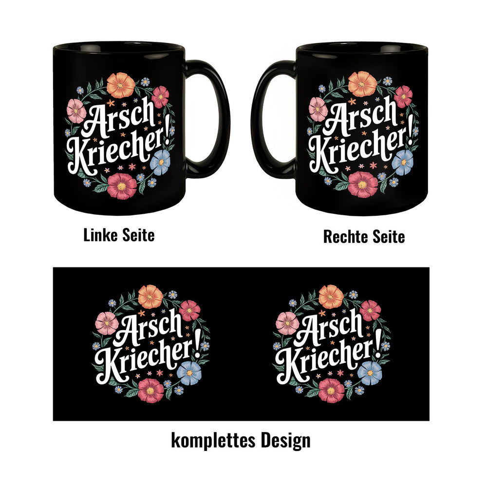 - Bist du ein stolzer Kriecher-Liebhaber oder kennst du jemanden, der einer ist? Unser schwarzer Kaffeebecher wartet nur darauf, die nächste Dosis Humor in die Morgenroutine zu bringen. Mit einer fetten, kursiven "Arsch Kriecher!"-Illustration und einem charmanten Blumenkranz umrahmt – der absolute Hingucker auf jedem Tisch!