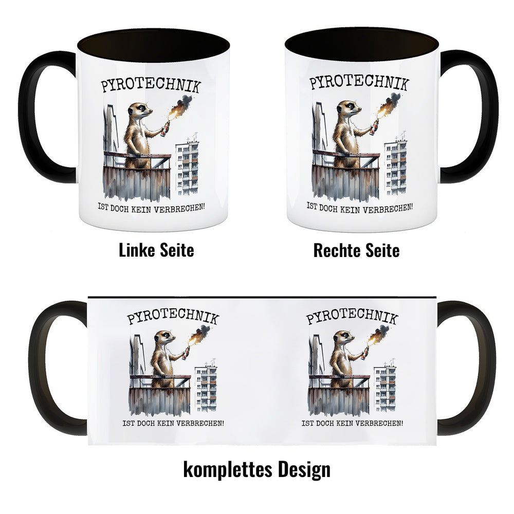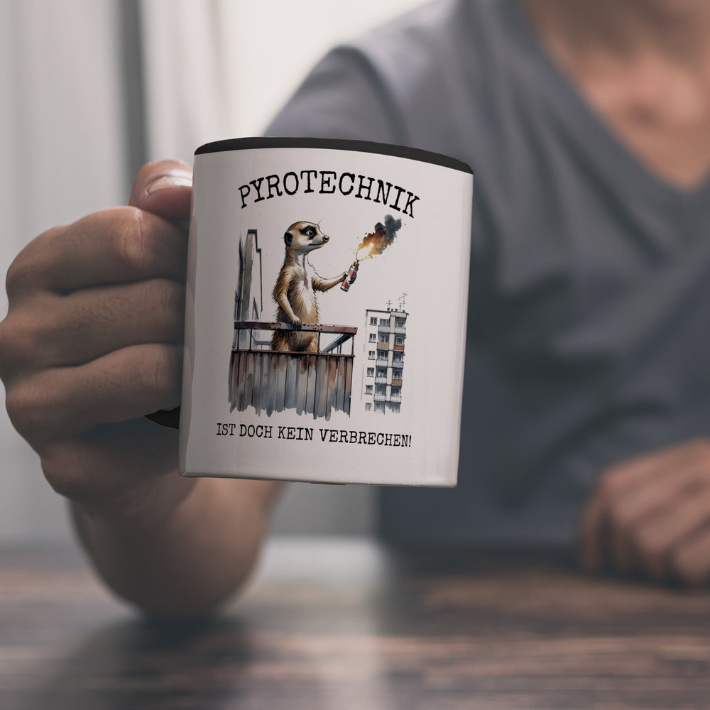 Balkon-Ultra Erdmännchen mit Pyrofackel Tasse in Schwarz mit Spruch Pyrotechnik ist doch kein Verbrechen