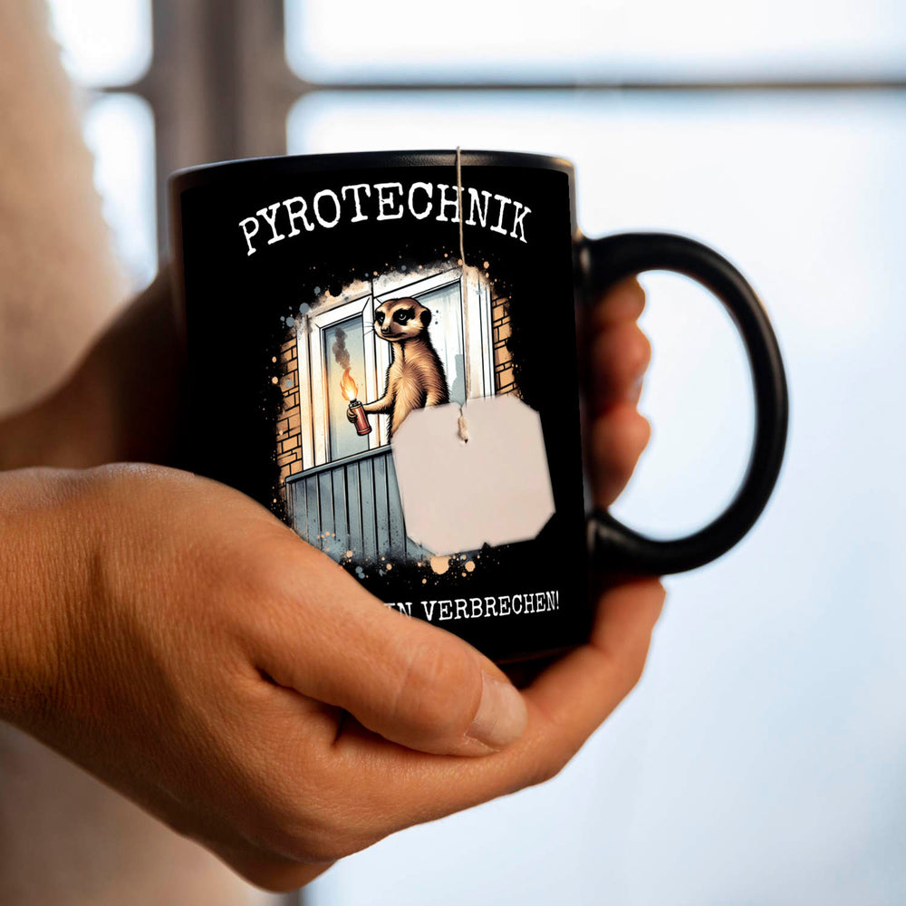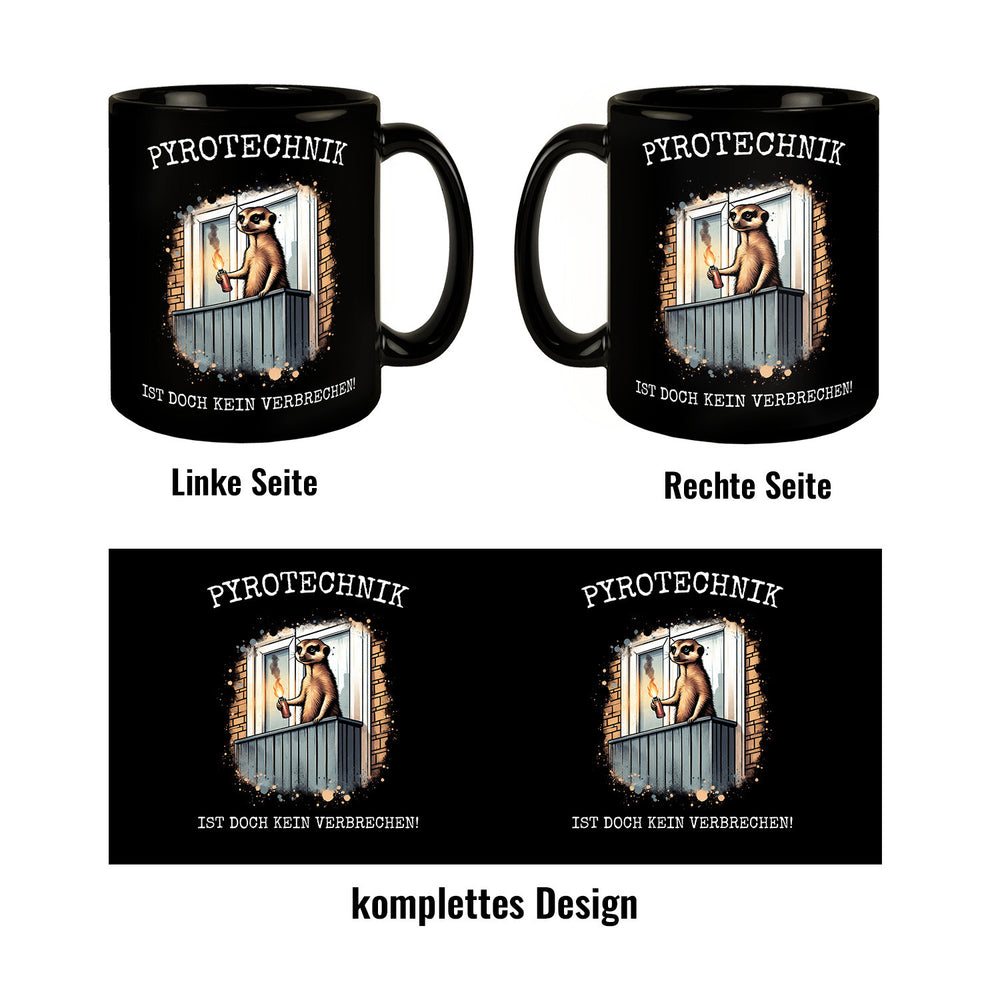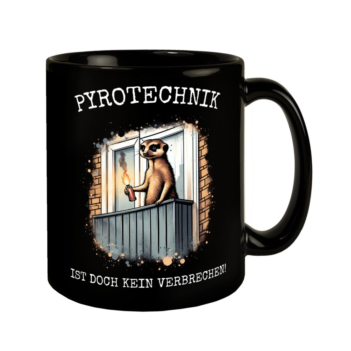 Balkon-Ultra Erdmännchen mit Pyrofackel Tasse in Schwarz mit Spruch Pyrotechnik ist doch kein Verbrechen
