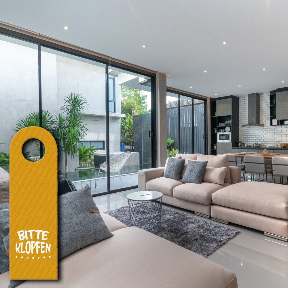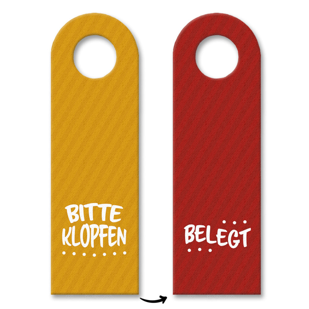 Zur Info an alle, ob man anklopfen soll oder eintreten darf. Hinweise: Material: Filz / Größe ca. 8x27 cm / beidseitig bedruckt