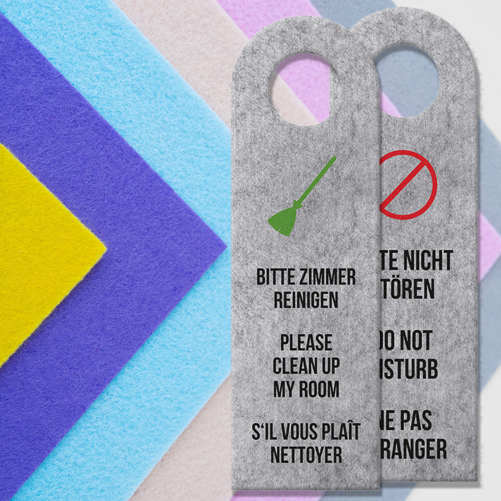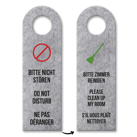 Je nach Seite kann man auf verschiedenen Sprachen sehen, ob der Gast sein Zimmer gereinigt haben möchte, oder nicht gestört werden will. Hinweise: Material: Filz / Größe ca. 8x27 cm / beidseitig bedruckt