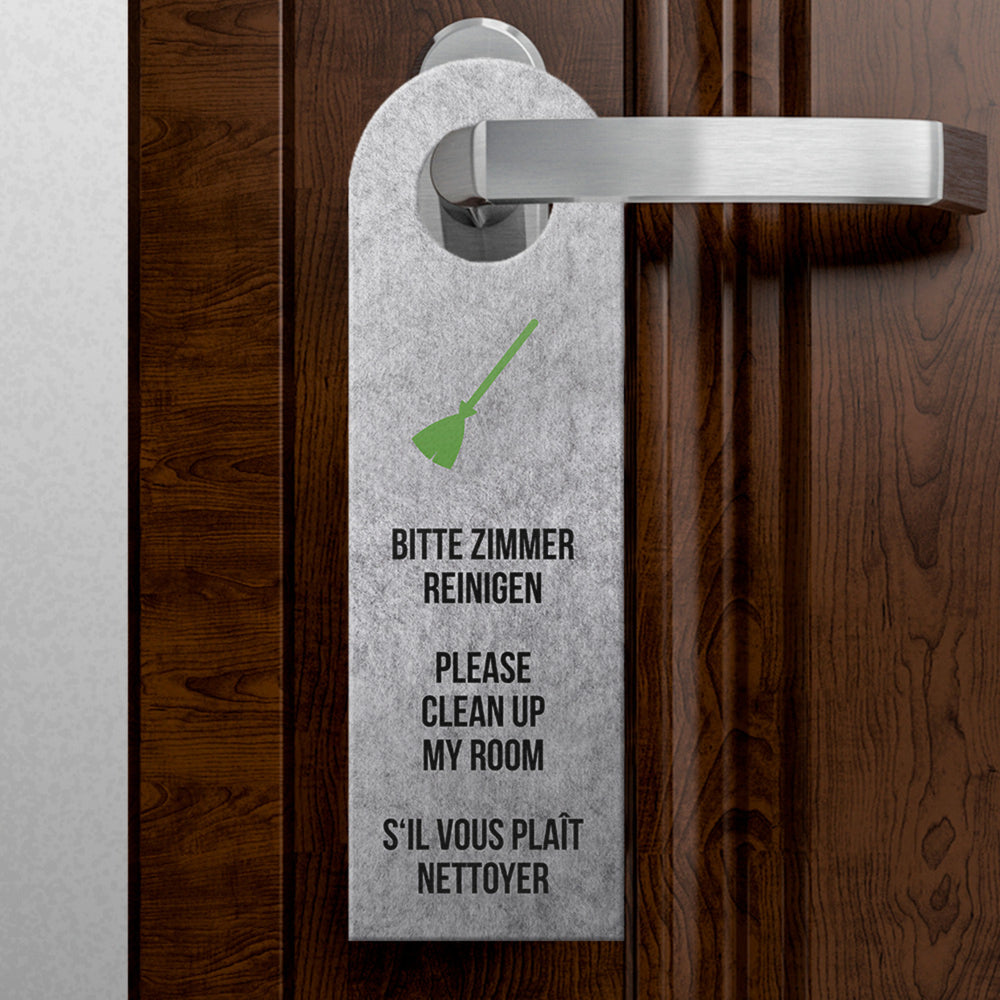 - Welche Seite des Türhängers an der Türklinke hängt, entscheidet der Hotelgast. Durch die Symbole kann man auf den ersten Blick ablesen, ob das Zimmer betreten werden darf oder nicht. Zusätzlich steht die Botschaft noch in verschiedenen Sprachen darunter.
