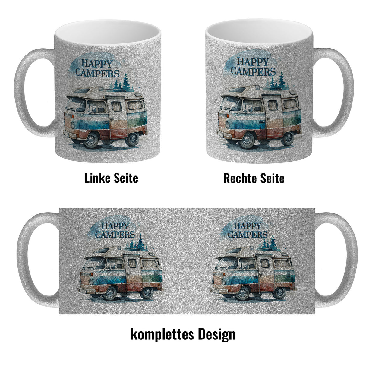 - 1x Campingwagen Kaffeebecher mit Spruch Happy Campers in der gewählten Ausführung