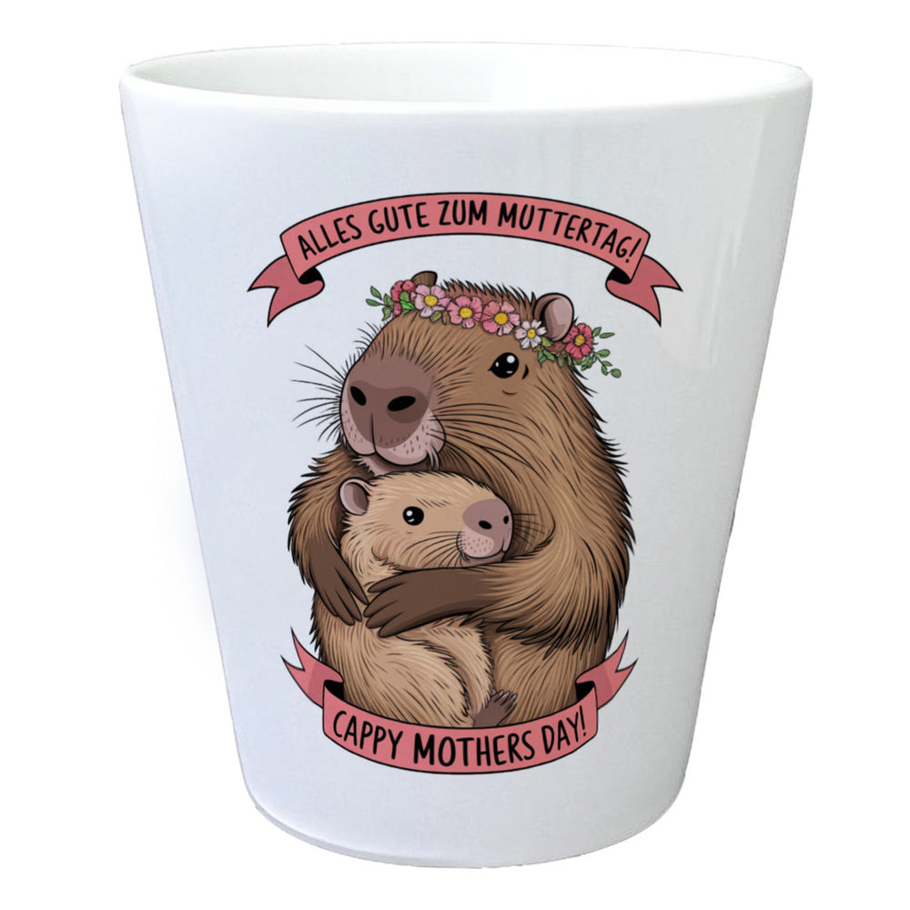 • Dieser bezaubernde Blumentopf zeigt eine liebevolle Illustration einer Capybara-Mama und ihrem Baby, die sich umarmen. Die Mama trägt einen niedlichen Blumenkranz, und ein Banner mit „Alles Gute zum Muttertag! Cappy Mothers Day!“ verleiht dem weißen Hintergrund einen festlichen Touch. Ein wahres Highlight für jedes Pflanzenparadies!