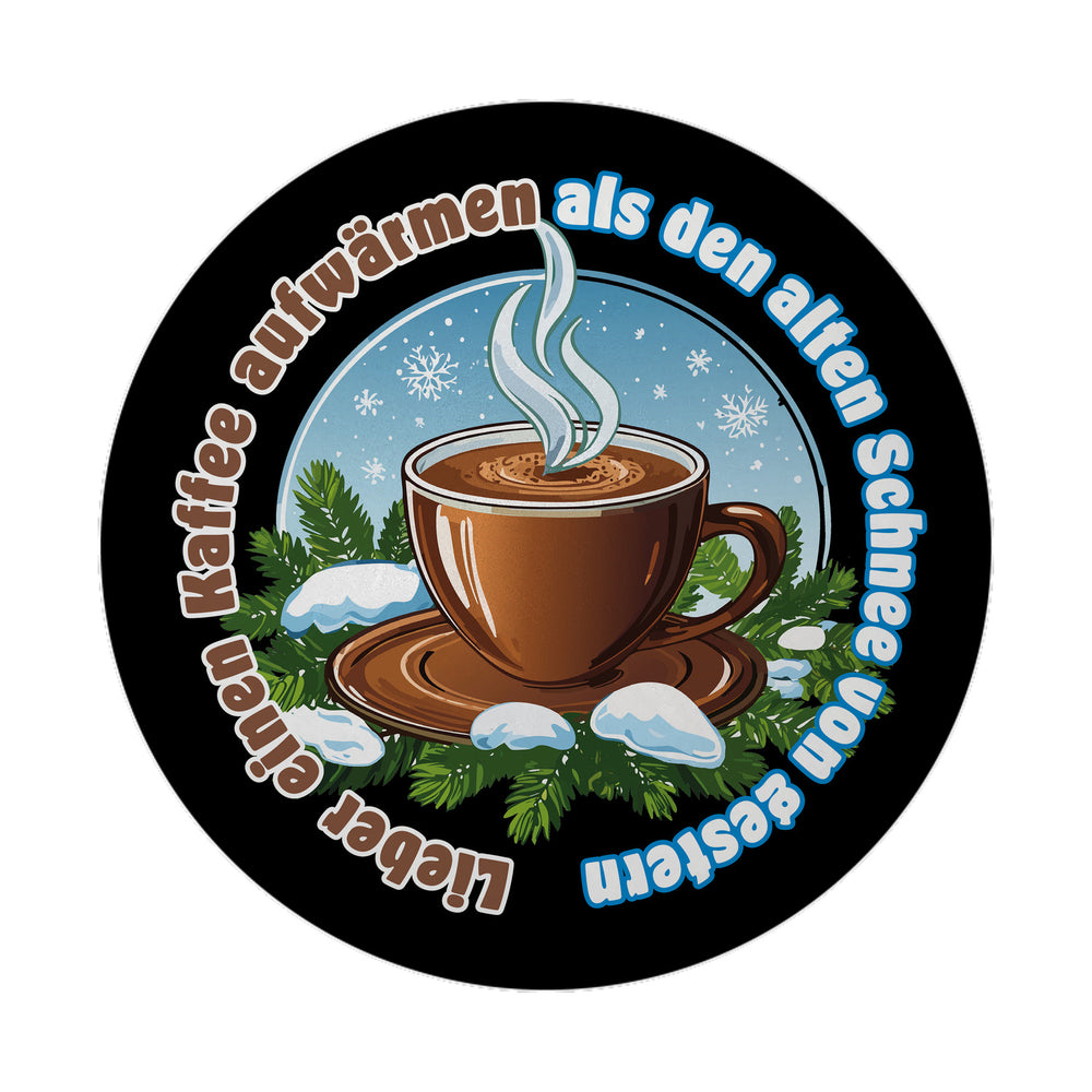 - Der runde Magnet zeigt eine dampfende Kaffeetasse, die auf schneebedeckten Tannenzweigen steht. Die Tasse strahlt Gemütlichkeit aus und trägt den humorvollen Spruch: "Lieber einen Kaffee aufwärmen, als den Schnee von gestern." Perfekt für alle, die den Winter lieben und Humor schätzen.