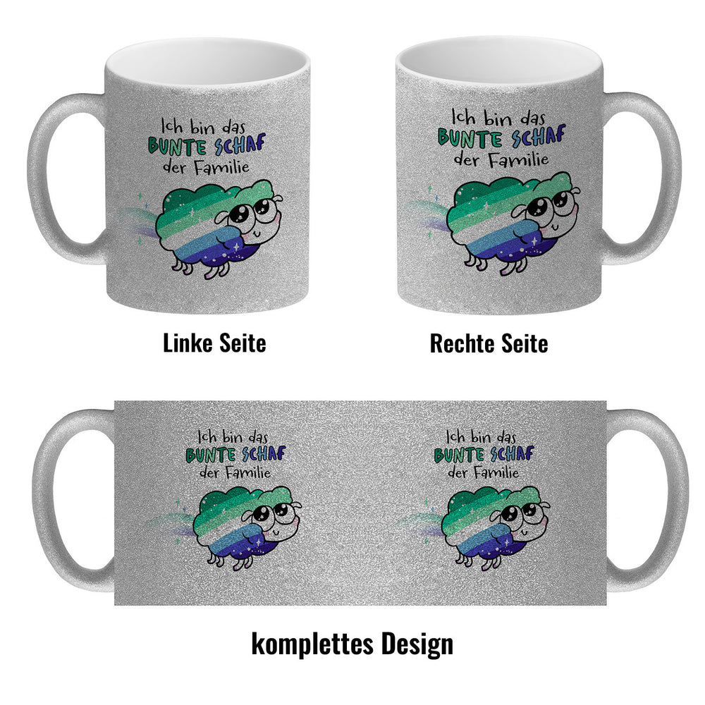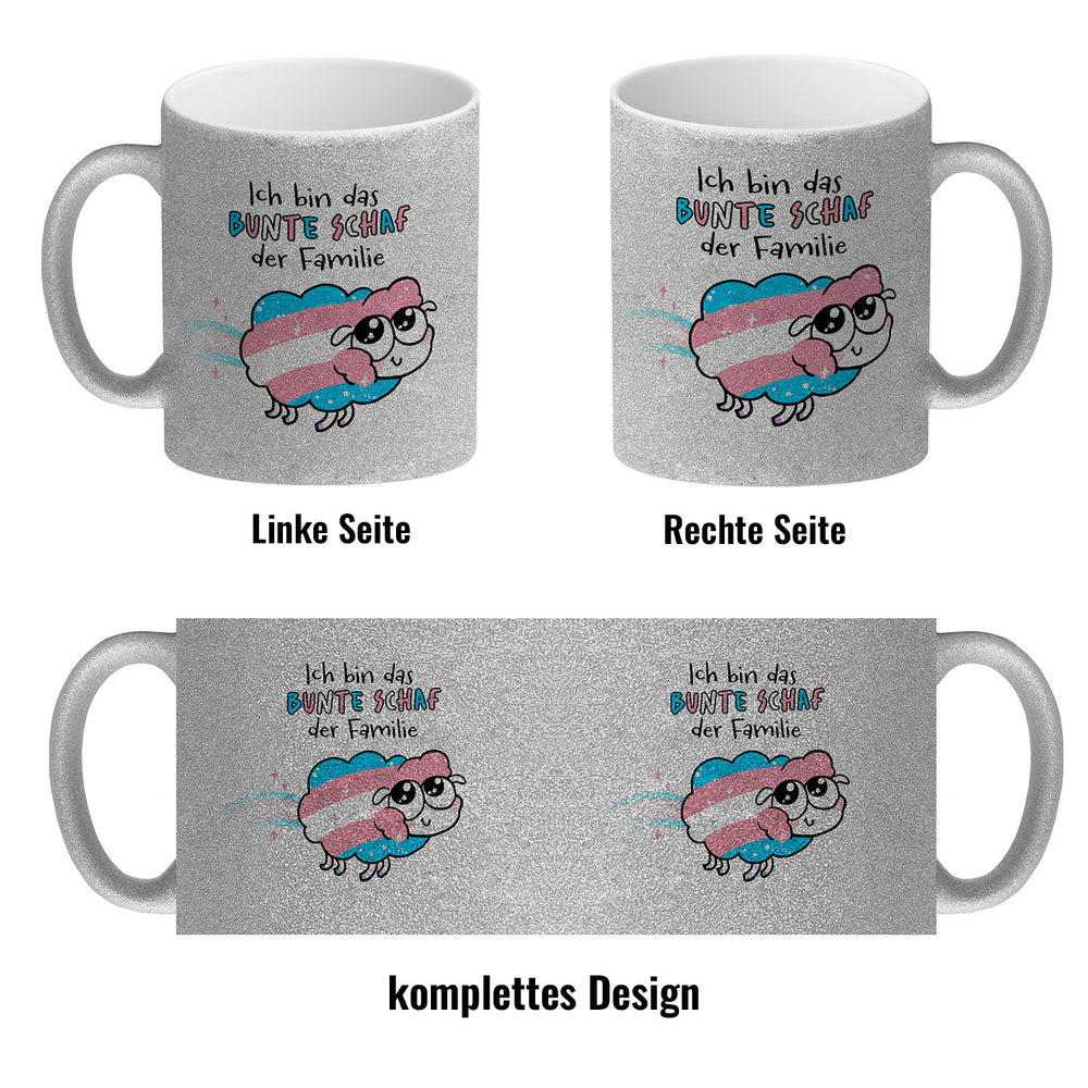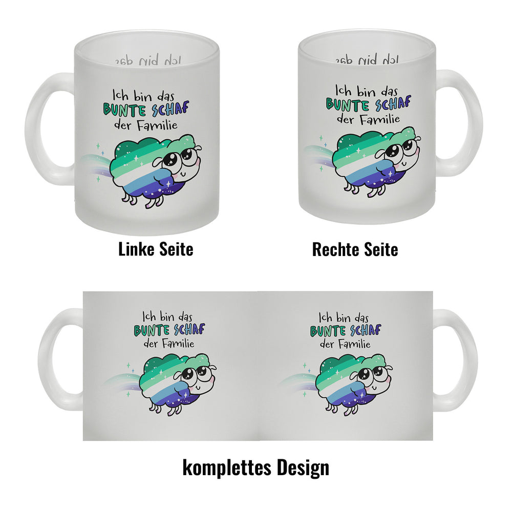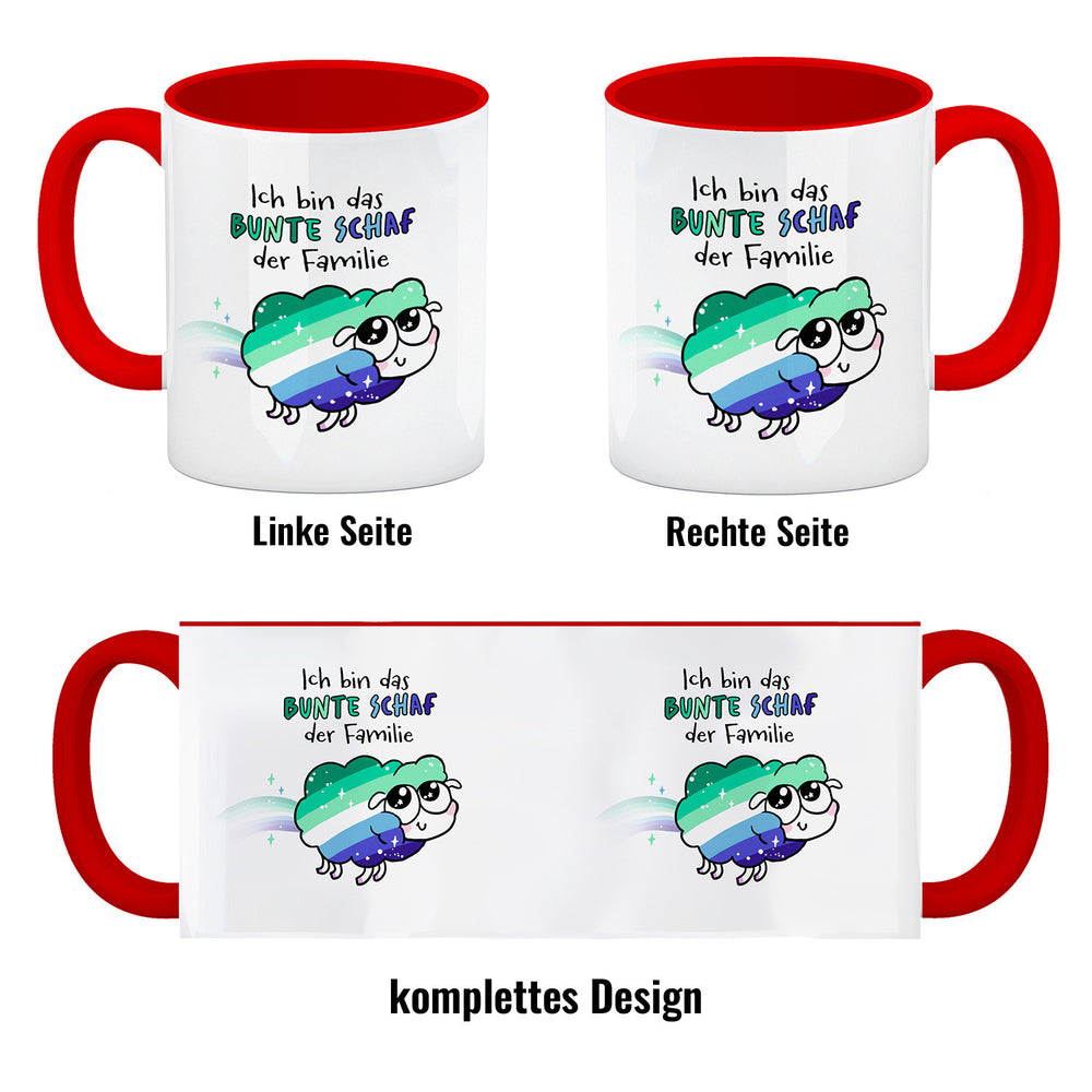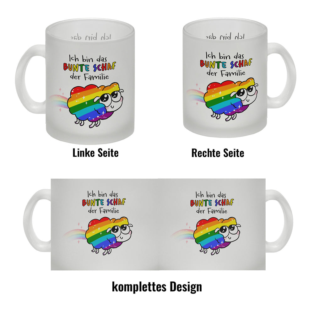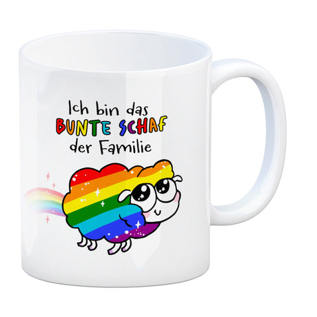 - 1x Das bunte Schaf der Familie in Pride-Farben Kaffeebecher mit Spruch in der gewählten Ausführung