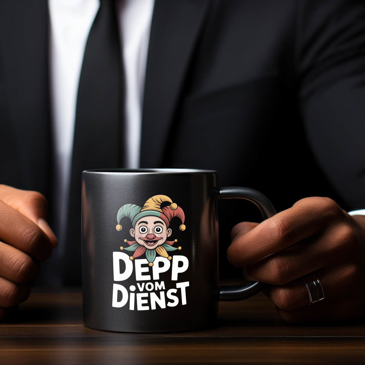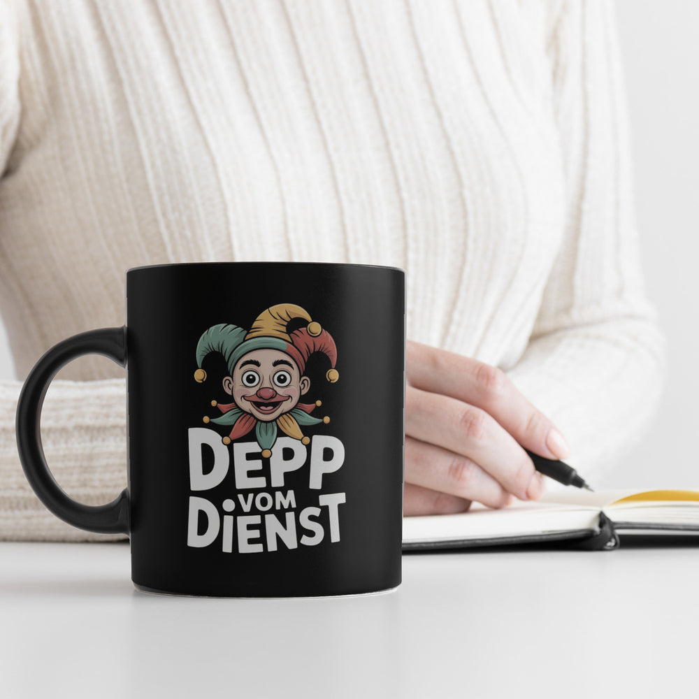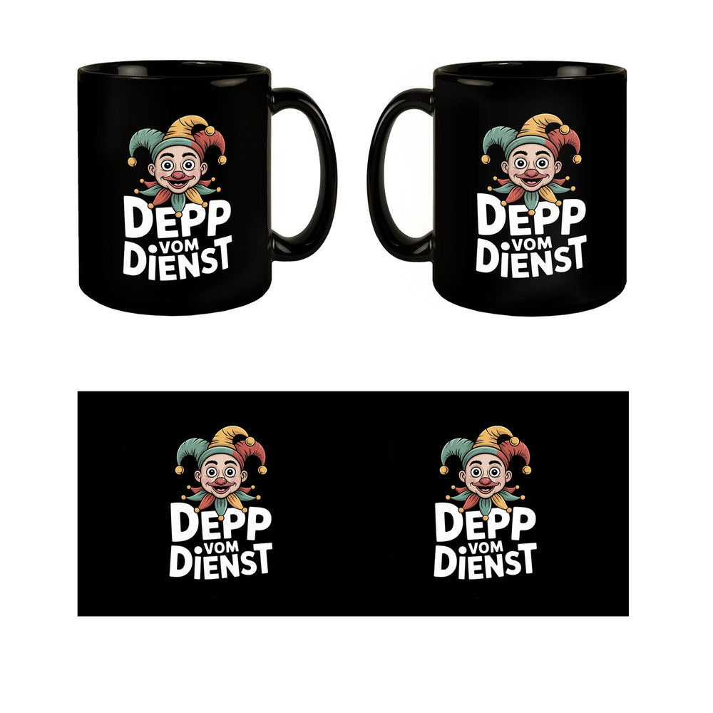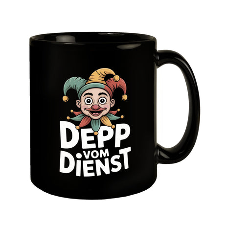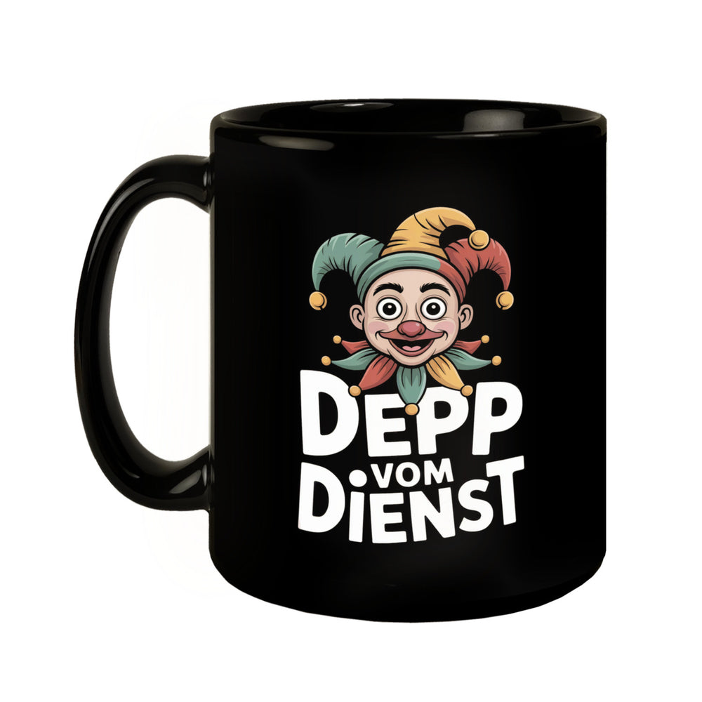 - Die "Depp vom Dienst" Tasse zeigt ein skurriles und charmantes Kasperle-Puppen-Cartoon. Der Kasper trägt ein buntes Narrenkostüm, komplett mit spitzer Mütze und Glöckchen, und starrt mit großen, ausdrucksstarken Augen und einem schelmischen Grinsen. Der Text in verspielter Schrift hebt sich humorvoll vom kräftigen Schwarz der Tasse ab.
