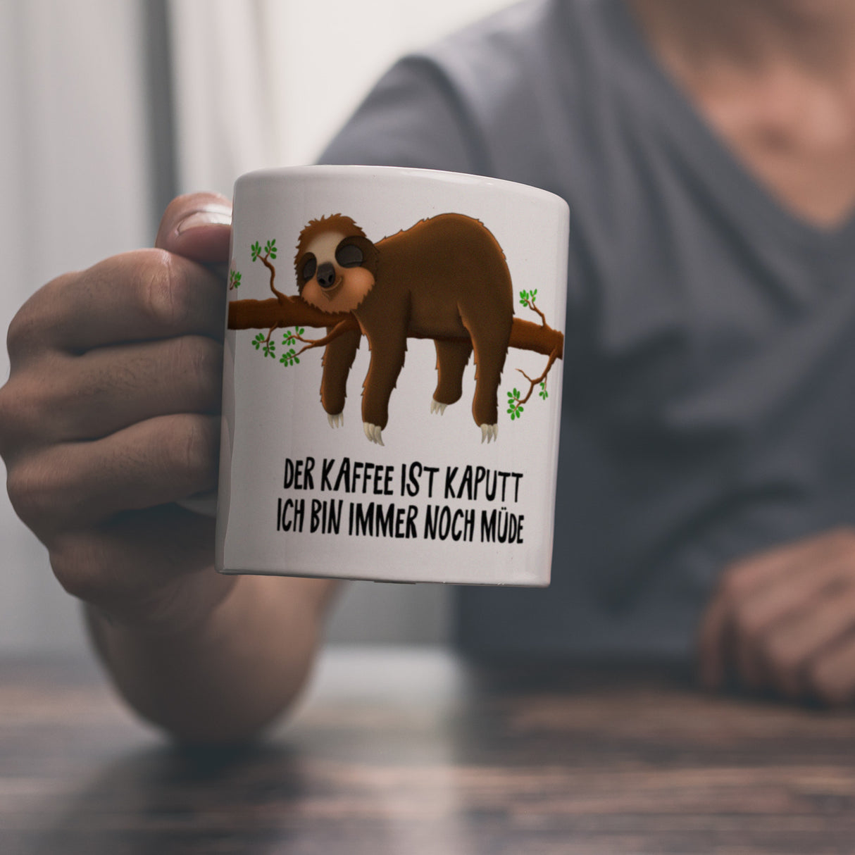• Lieferumfang: 1x Kaffeebecher mit liegendes Faultier Motiv und Spruch: Der Kaffee ist kaputt - ich bin ...
