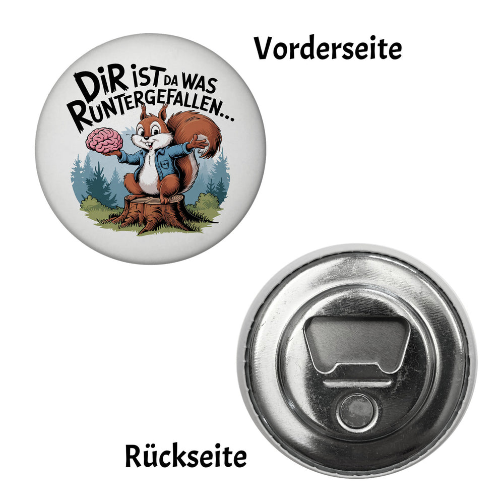 - Der runde Magnet präsentiert ein humorvolles Eichhörnchen, das in einer Jeansjacke auf einem Baumstumpf sitzt und ein Gehirn hält. Mit dem witzigen Spruch "Dir ist da was runtergefallen..." sorgt der Magnet für Schmunzler. Der weiße Hintergrund und die ungleichmäßigen Buchstaben runden das lustige Design ab.