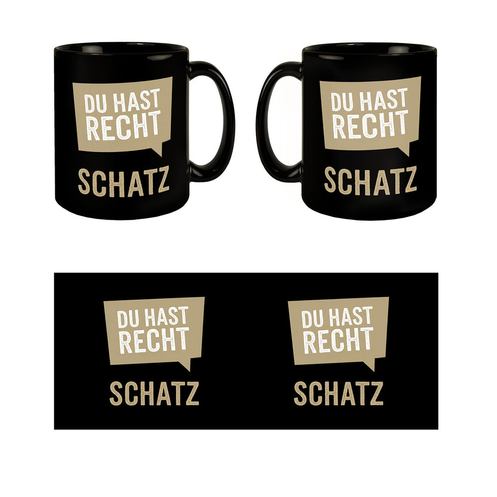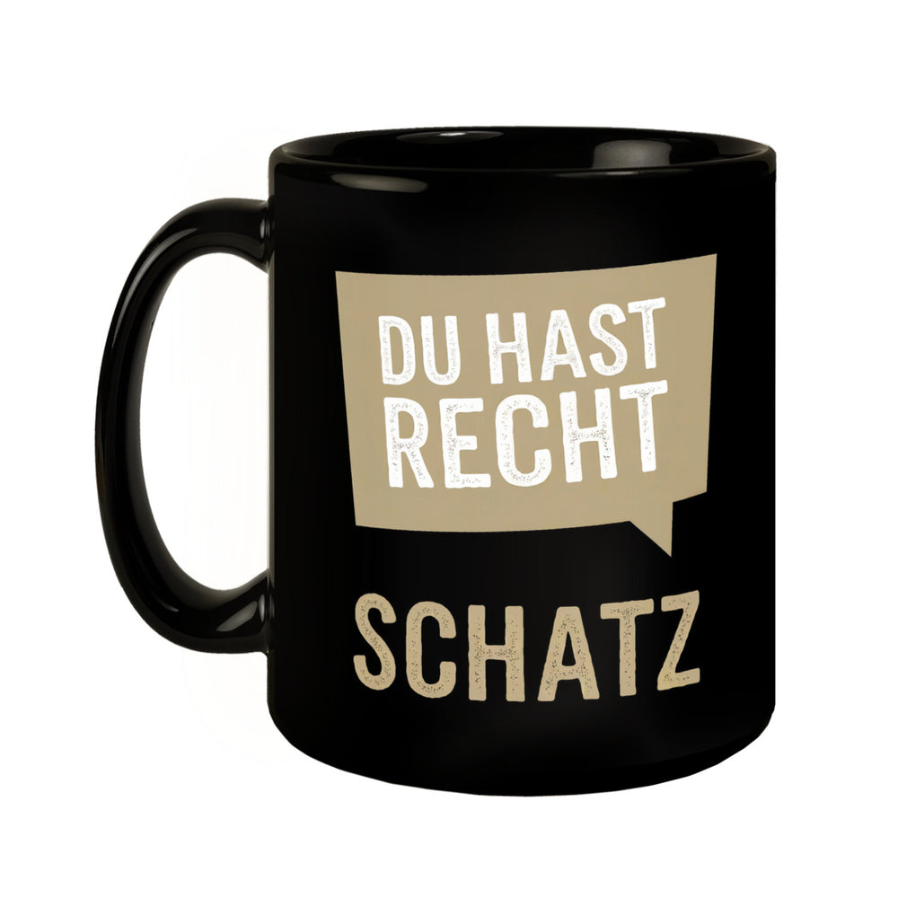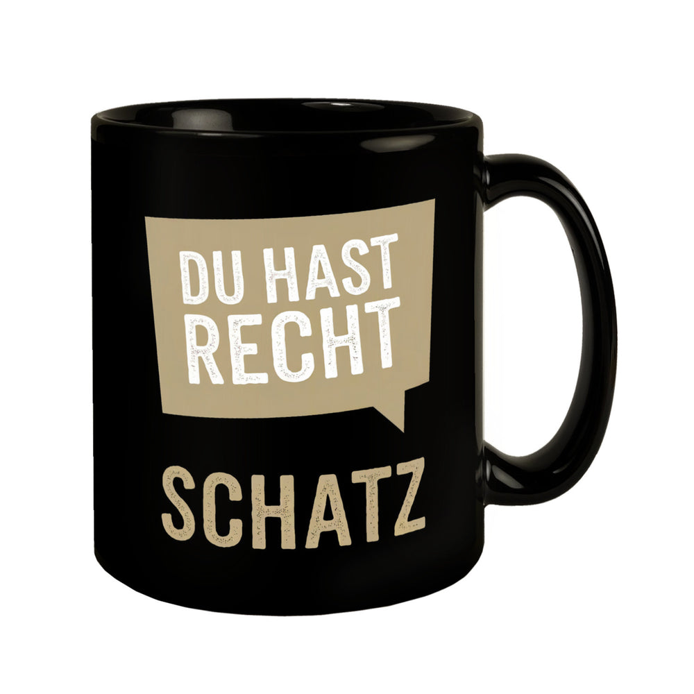 - Diese Tasse fällt sofort ins Auge mit ihrem schlichten, schwarzen Design und der amüsanten Sprechblase. "Du hast Recht Schatz" in weißer Schrift sorgt garantiert für ein Schmunzeln. Der farbliche Akzent beim Wort "Schatz" verleiht der Tasse einen besonderen Touch.