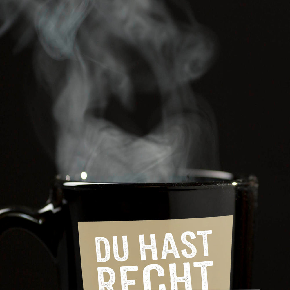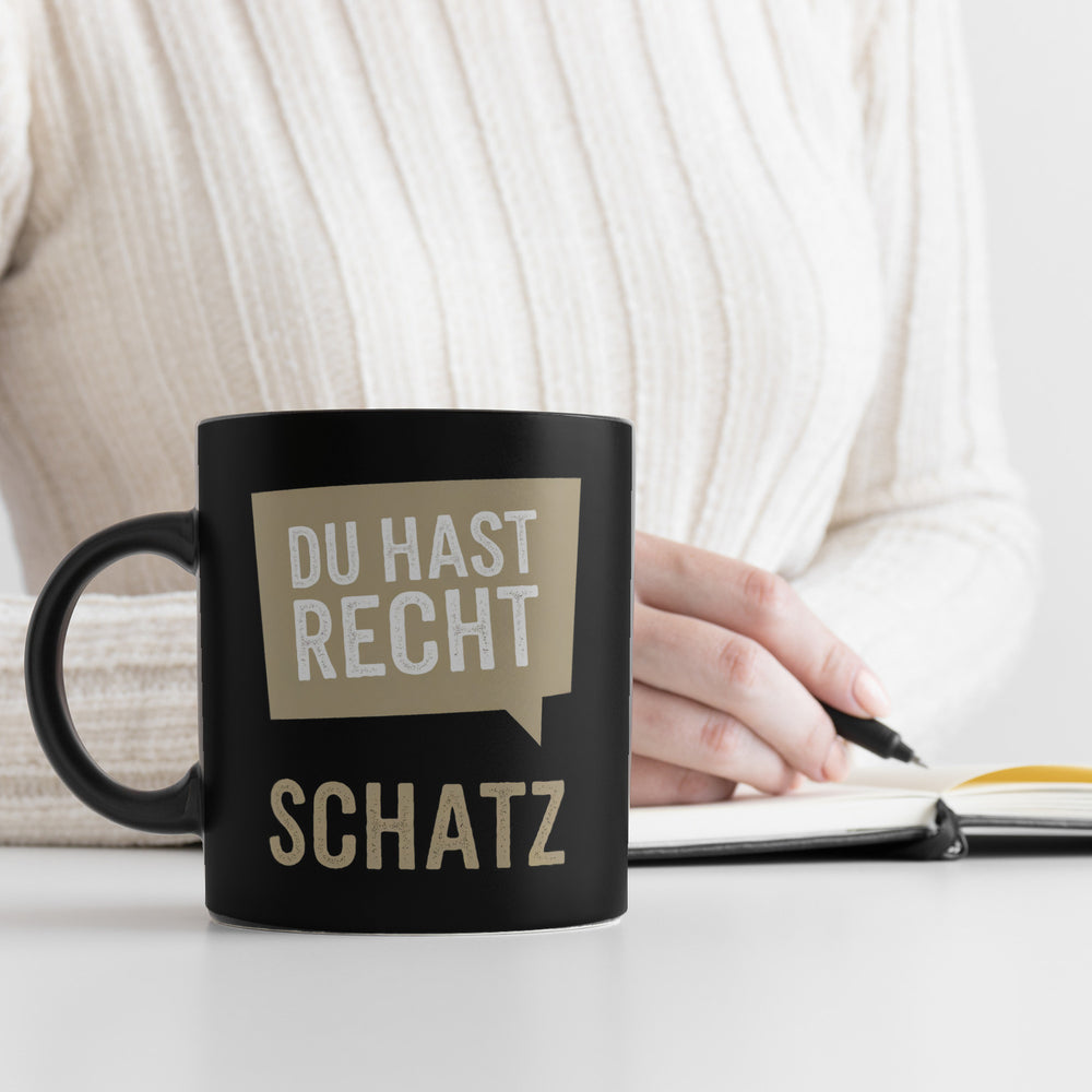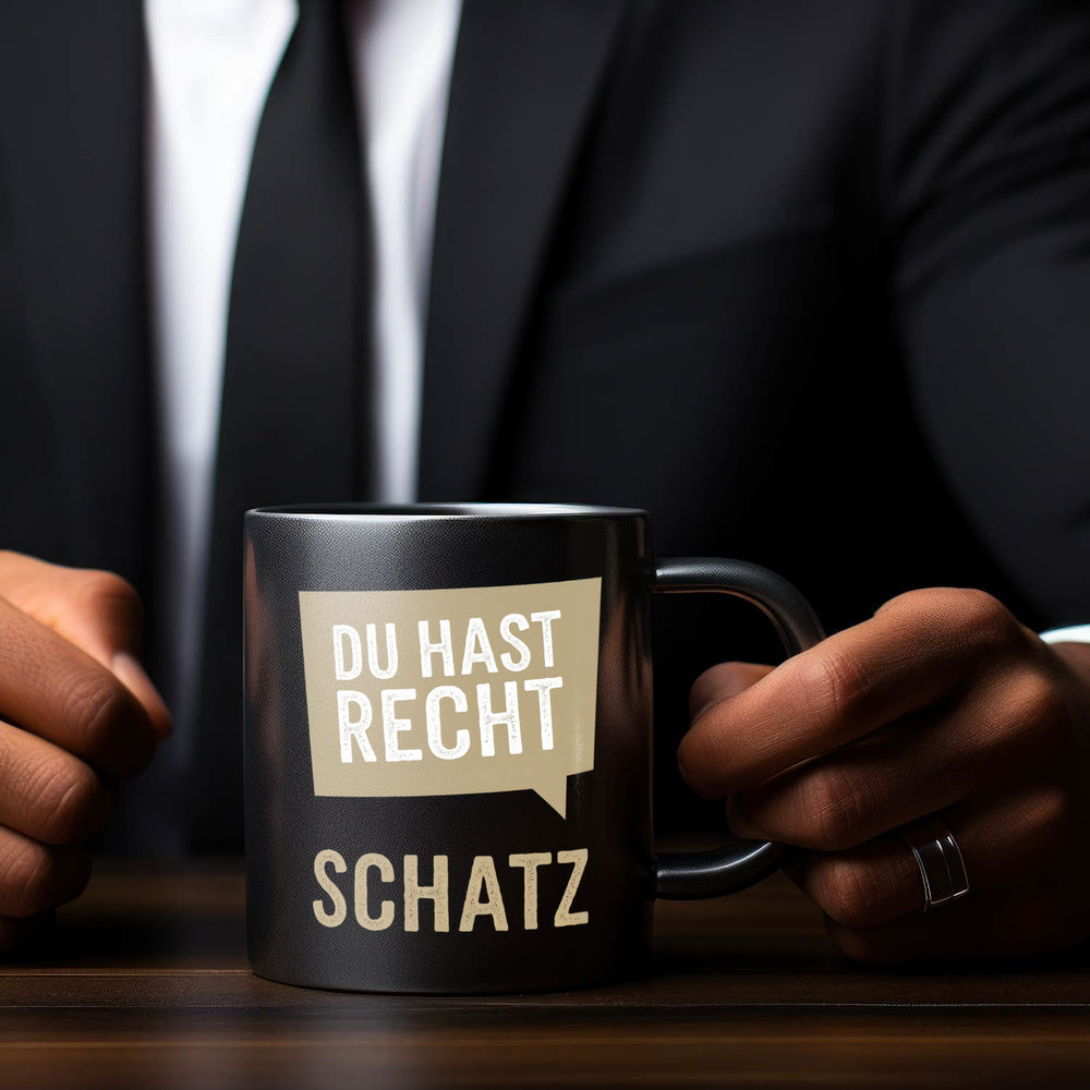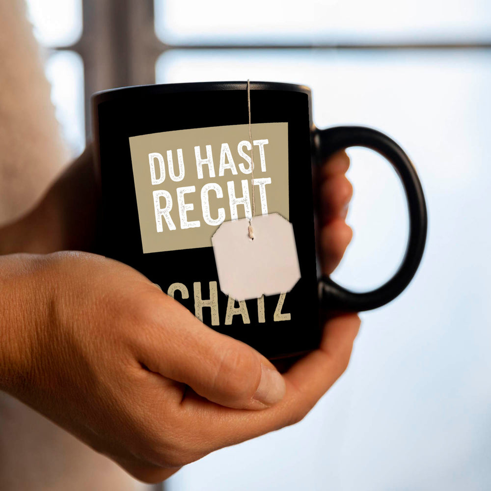 - Diese Tasse fällt sofort ins Auge mit ihrem schlichten, schwarzen Design und der amüsanten Sprechblase. "Du hast Recht Schatz" in weißer Schrift sorgt garantiert für ein Schmunzeln. Der farbliche Akzent beim Wort "Schatz" verleiht der Tasse einen besonderen Touch.