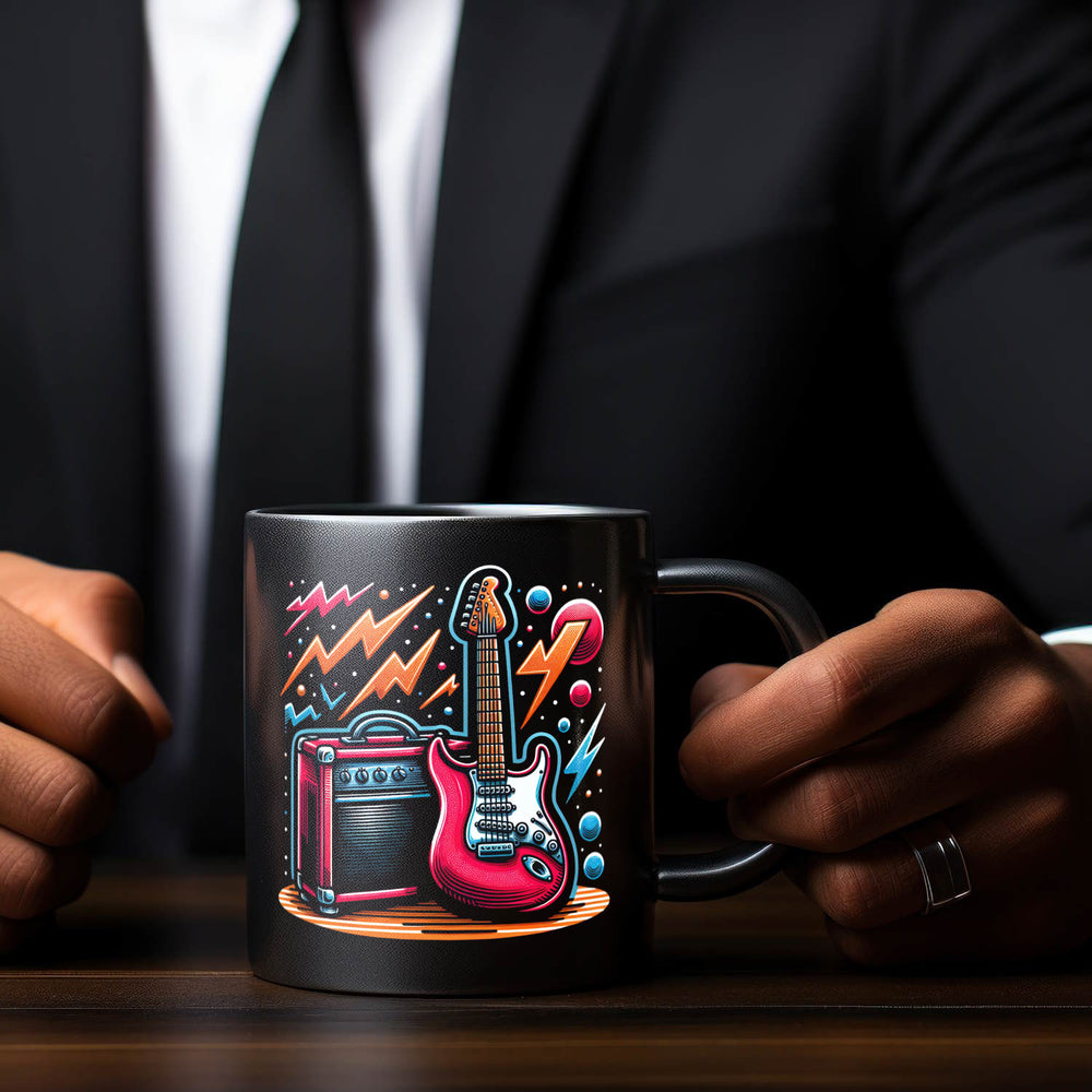 - Erwecke den Rockstar zum Frühstück mit der E-Gitarre Tasse in Schwarz! Schwing dich rhythmisch in den Tag, während eine leuchtend rote E-Gitarre neben einem schwarzen Verstärker deine Morgenroutine zum Solo macht. Ideal für jeden, der in seiner Küche einen kräftigen Akkord an Koffein braucht!