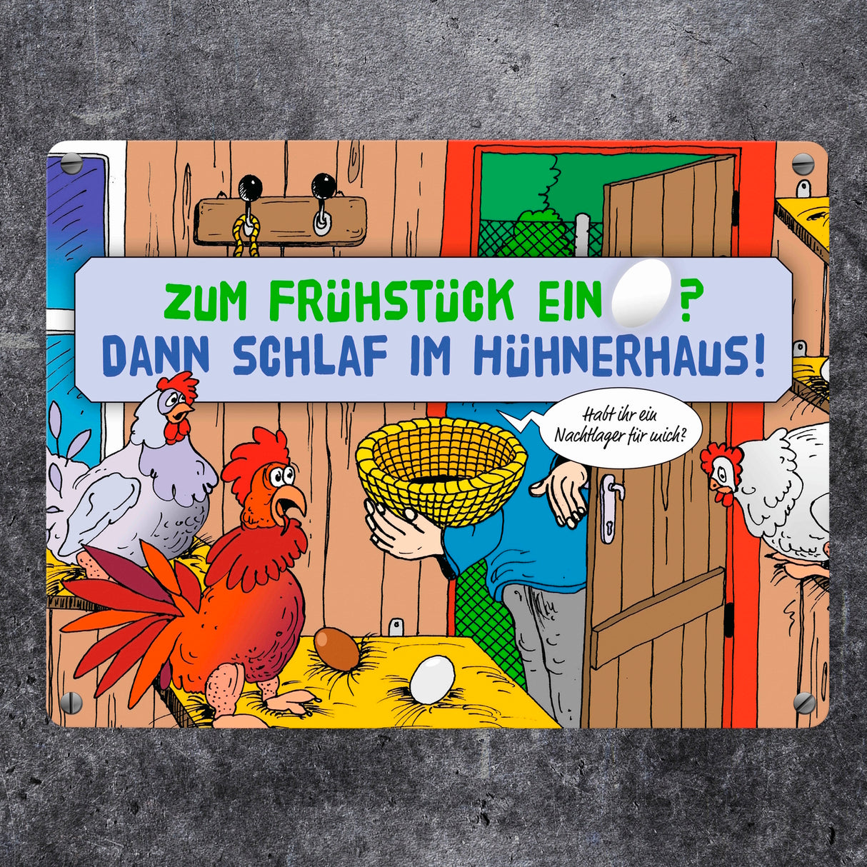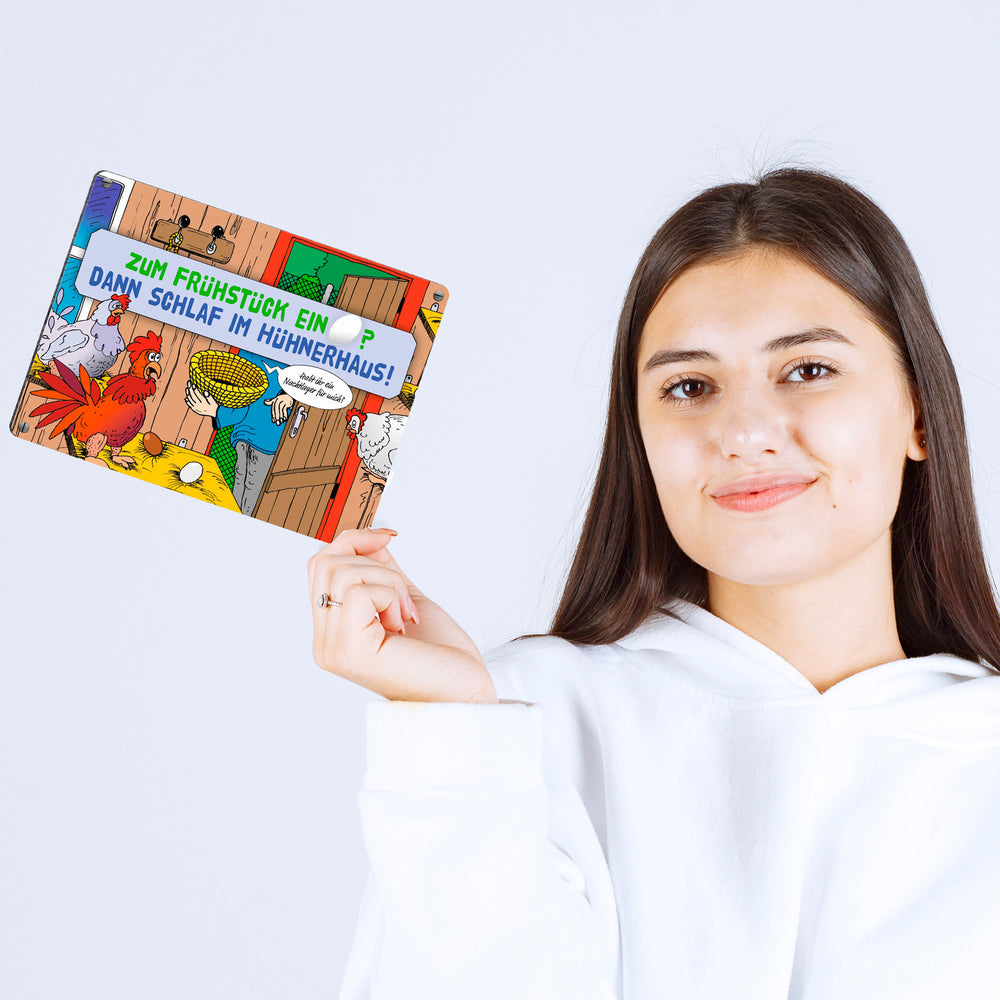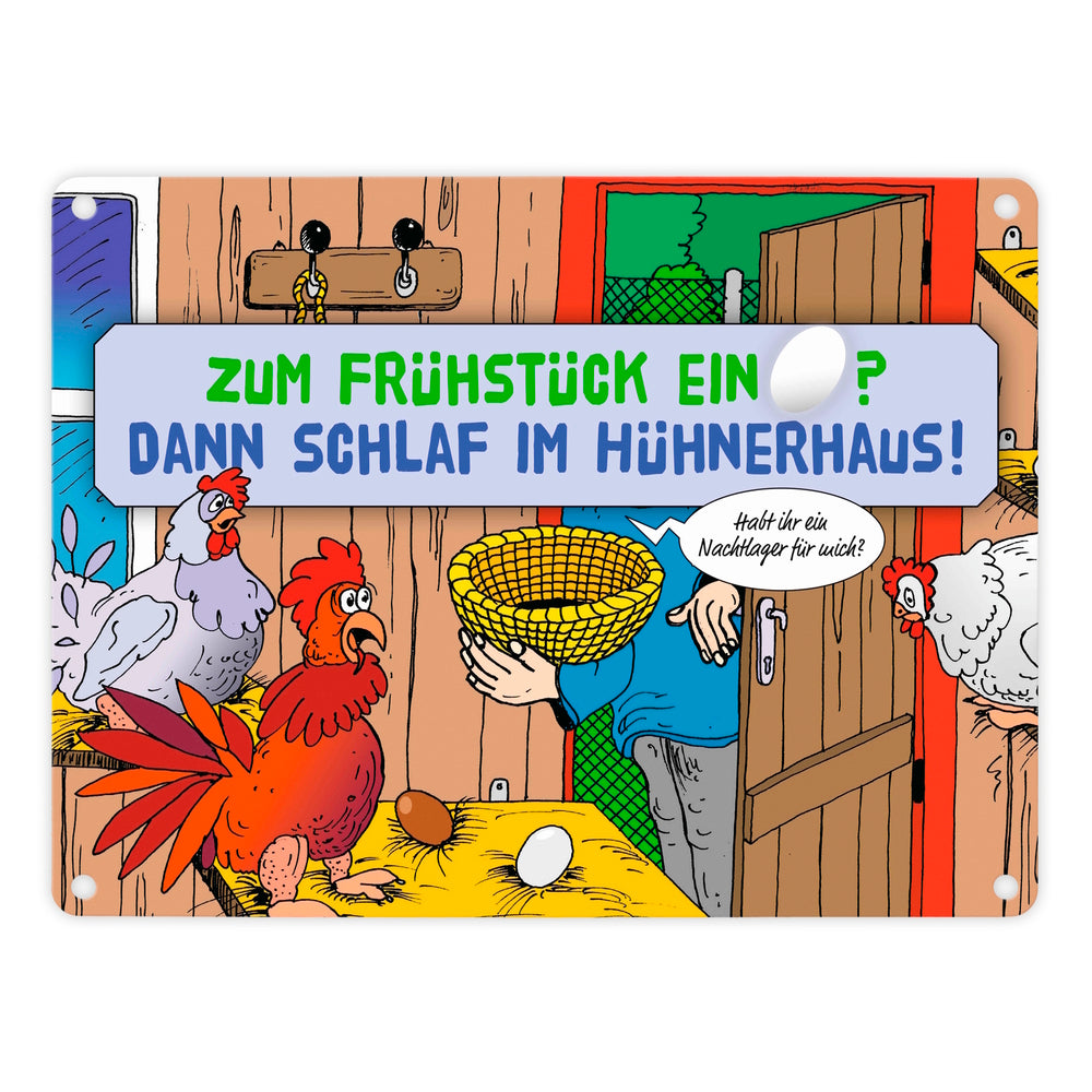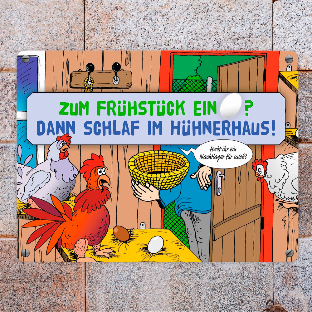 - 1x Ein Ei zum Frühstück - dann schlaf im Hühnerhaus Comic Metallschild mit Spruch in der gewählten Größe