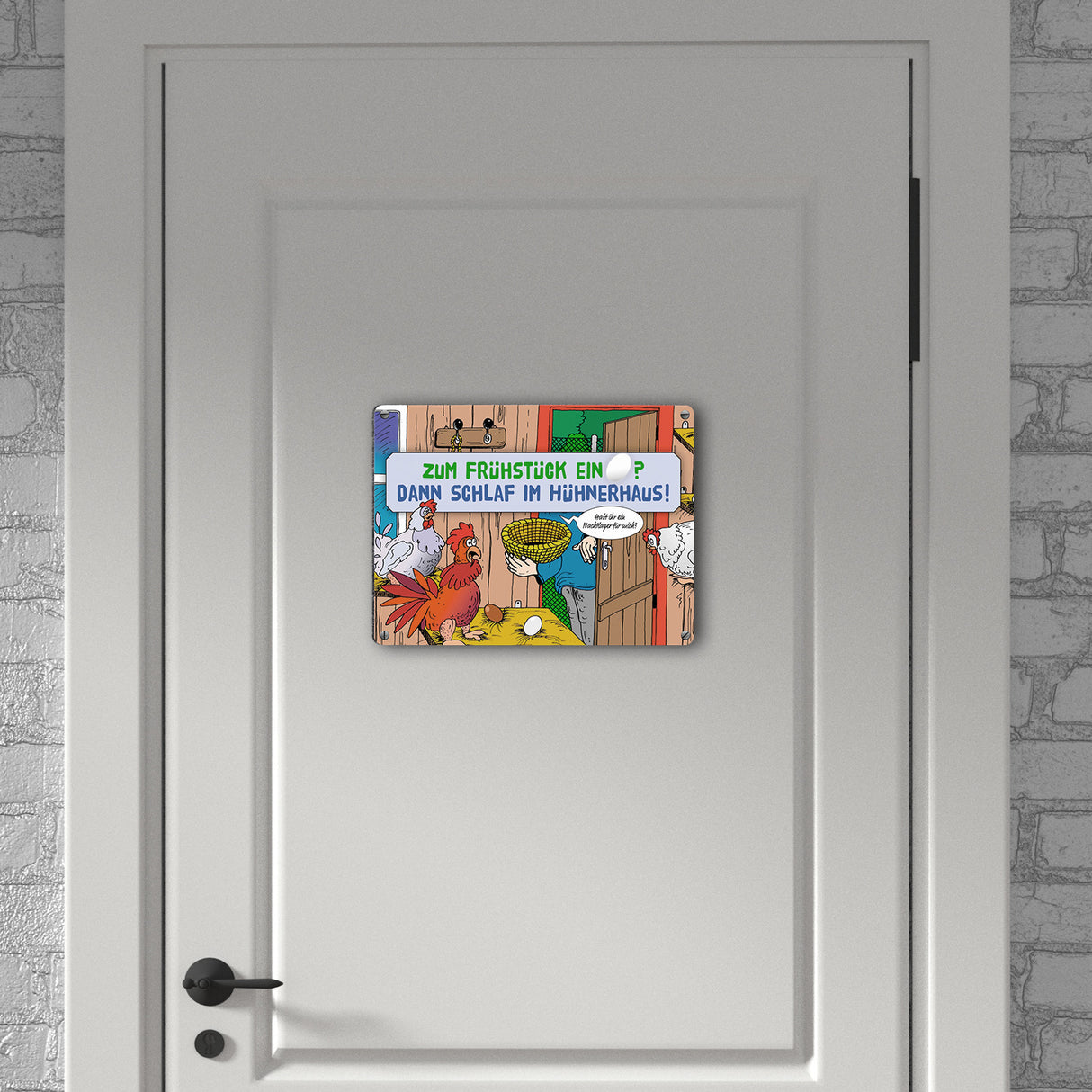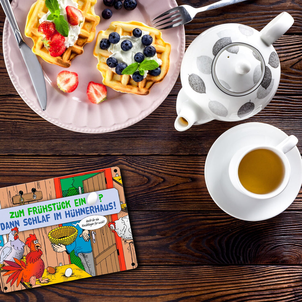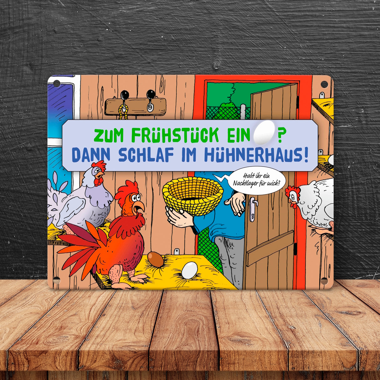 - 1x Ein Ei zum Frühstück - dann schlaf im Hühnerhaus Comic Metallschild mit Spruch in der gewählten Größe