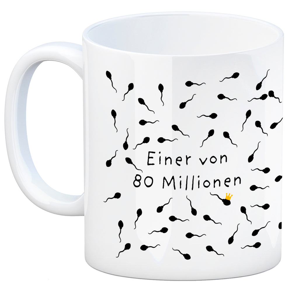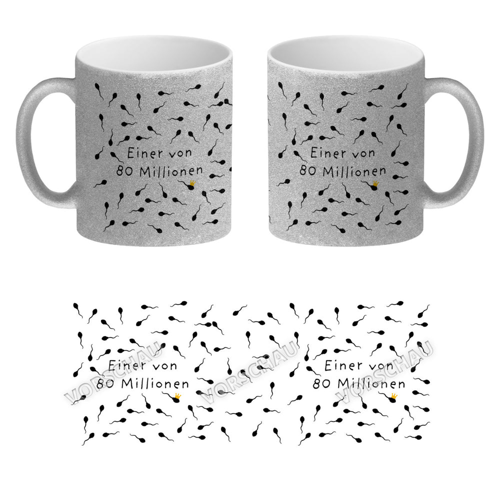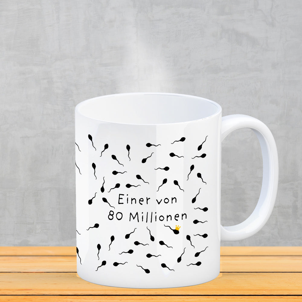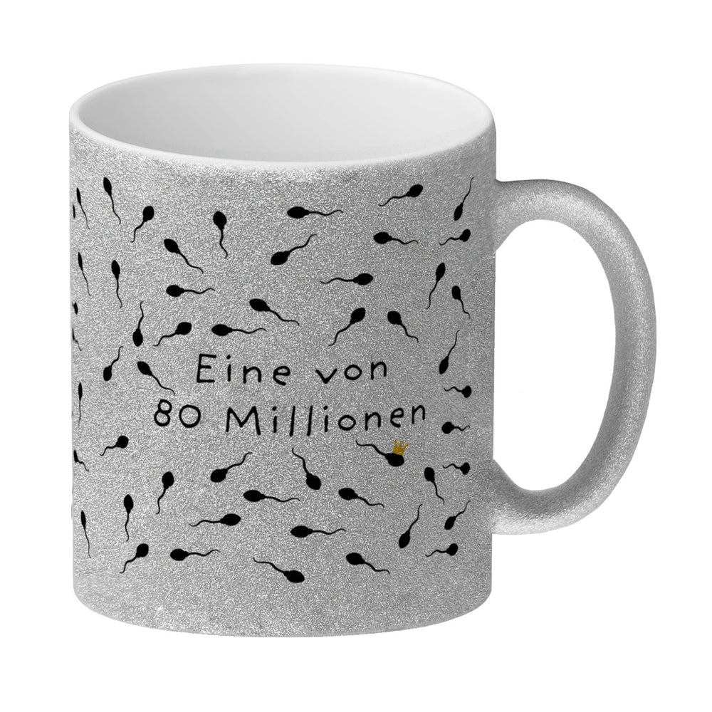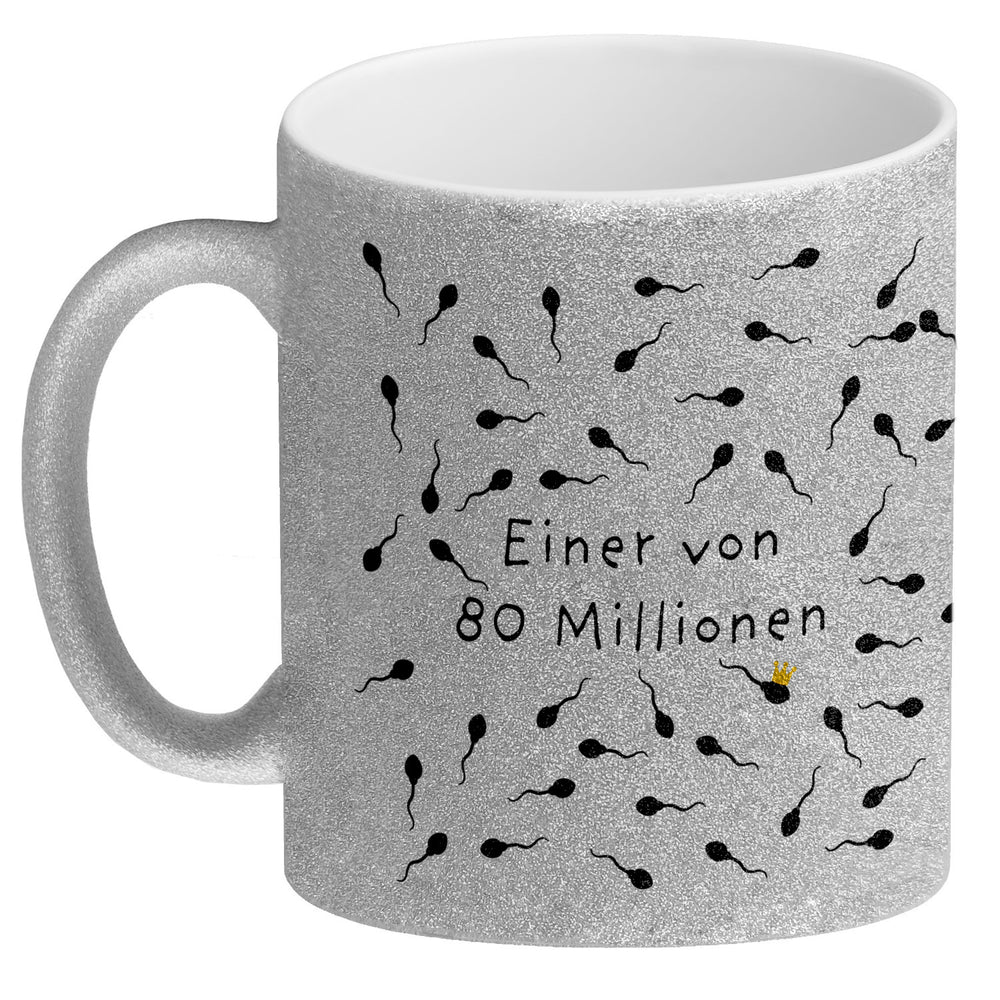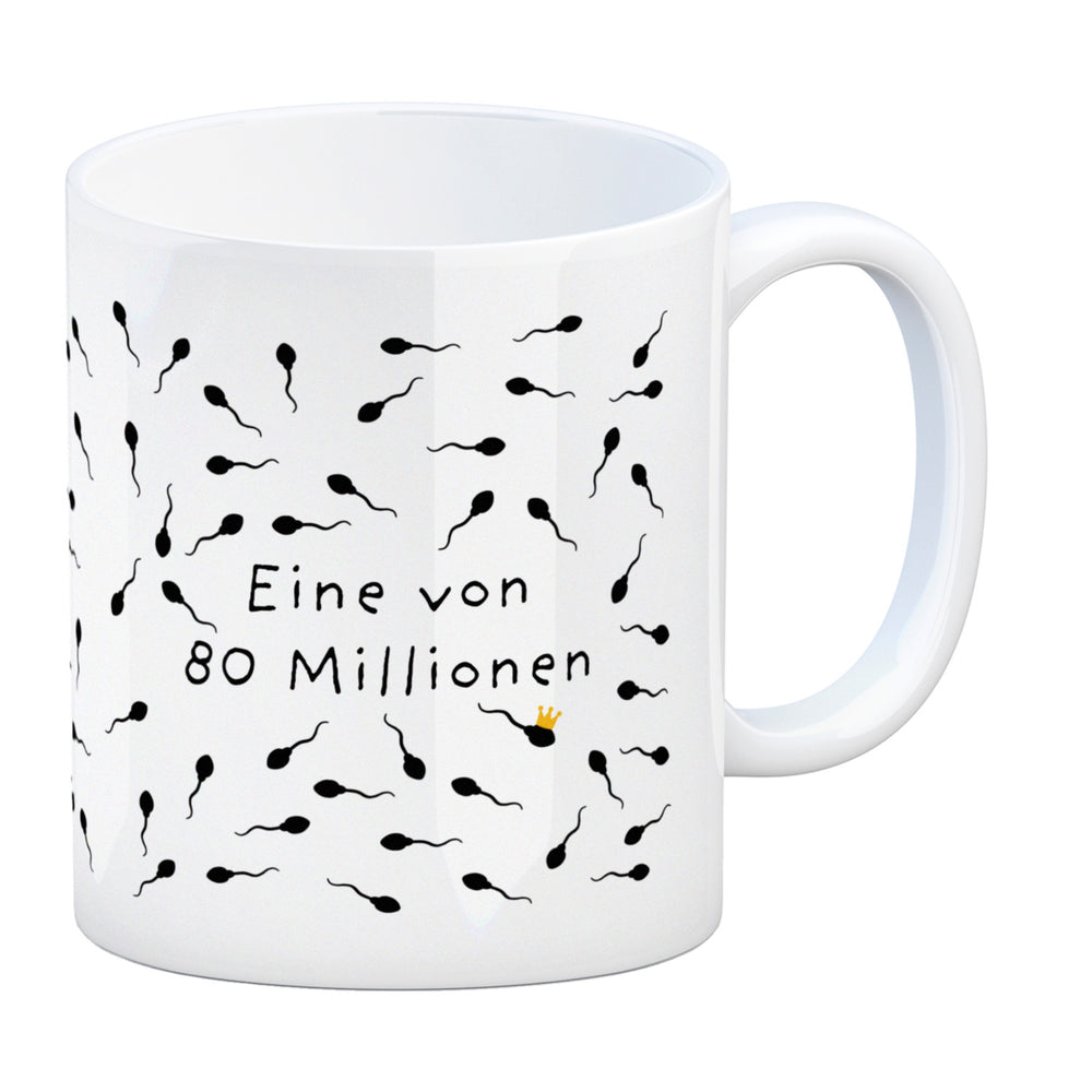Der Kaffeebecher Einer von 80 Millionen ist ein witziges Geschenk für alle, die Humor beim Kaffeetrinken lieben und ihren Mitmenschen eine Freude machen möchten. Dank der verschiedenen Ausführungen - weiße Standardtasse, mit farbigem Henkel und Innenseite, als edle Glastasse oder in der exklusiven Silberedition mit Glitzereffekt - wird jeder seinen persönlichen Favoriten finden. Mit viel Liebe zum Detail in Deutschland hergestellt, ist der Kaffeebecher ein echter Hingucker und das perfekte Geschenk für Eltern, Kinder oder Freunde zu besonderen Anlässen. Ein Geschenk, das an die Tatsache erinnert, dass wir alle bereits am Anfang unseres Lebens den Wettbewerb mit der größten Konkurrenz gewonnen haben: Das Sperma-Rennen!