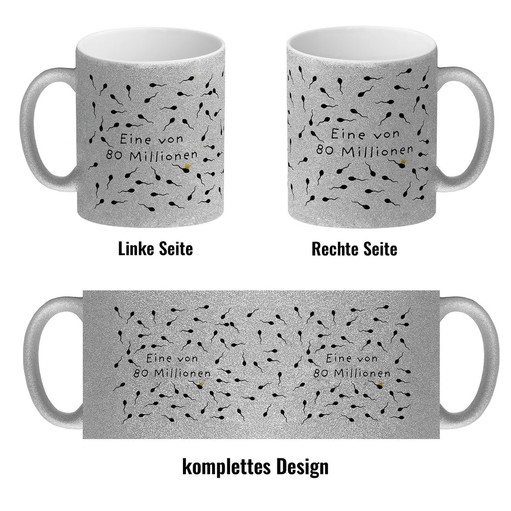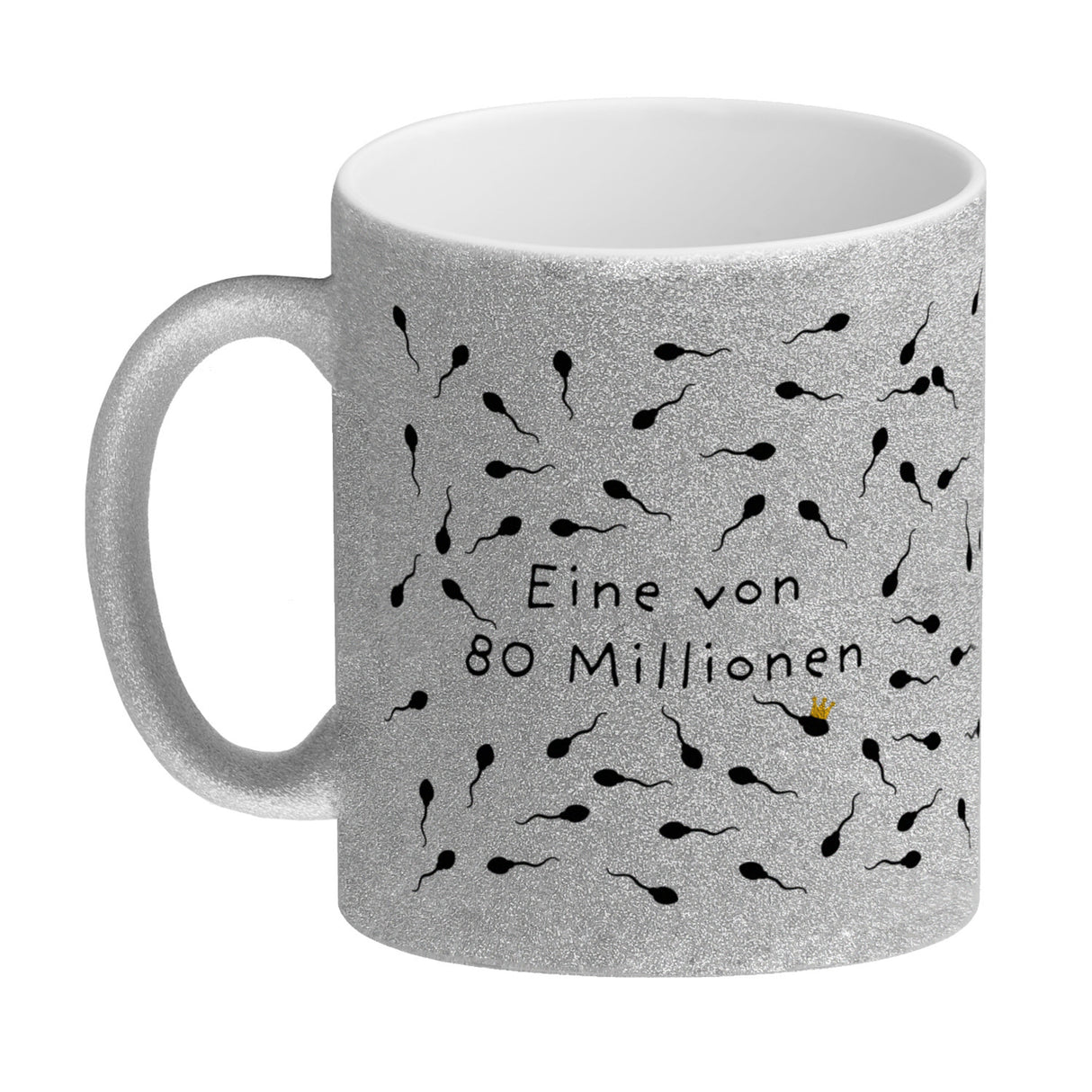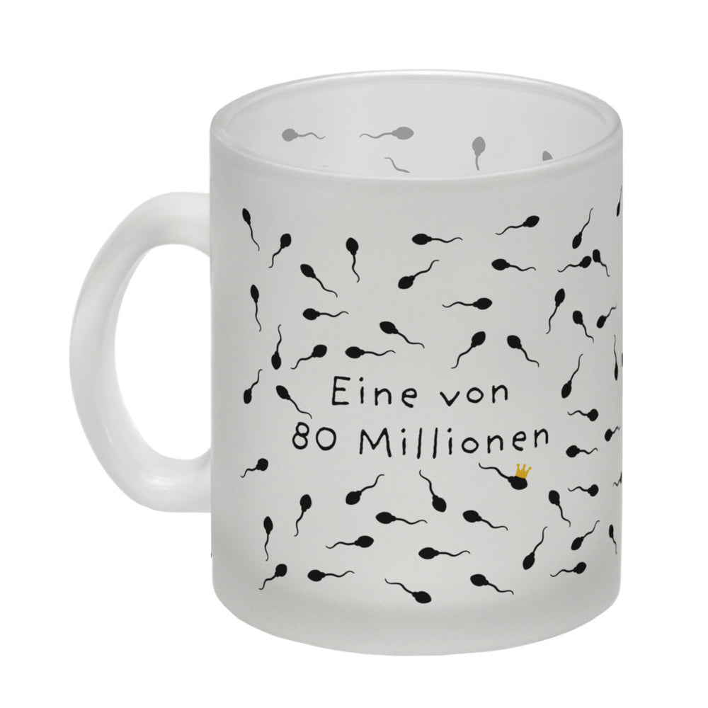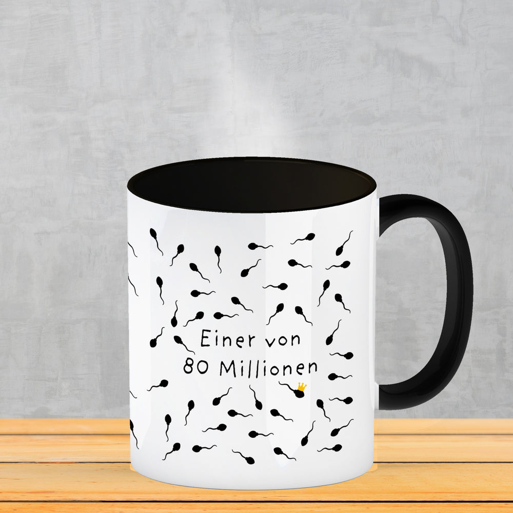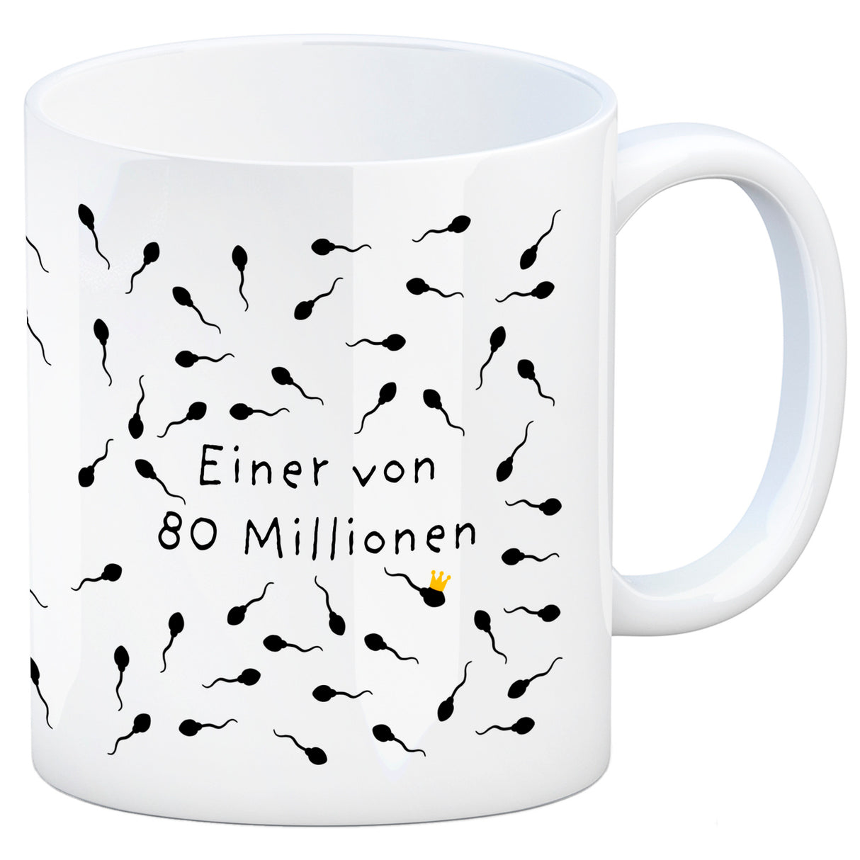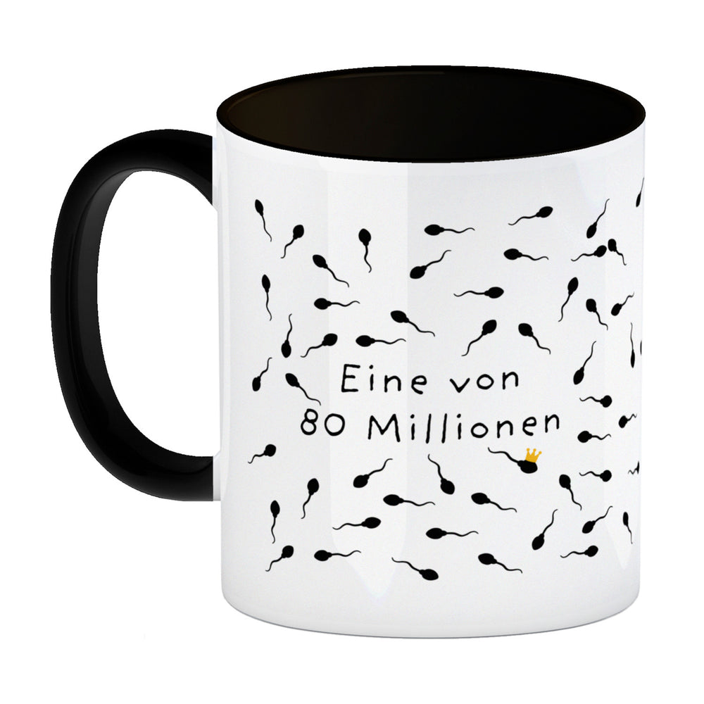 Der Kaffeebecher Einer von 80 Millionen ist ein witziges Geschenk für alle, die Humor beim Kaffeetrinken lieben und ihren Mitmenschen eine Freude machen möchten. Dank der verschiedenen Ausführungen - weiße Standardtasse, mit farbigem Henkel und Innenseite, als edle Glastasse oder in der exklusiven Silberedition mit Glitzereffekt - wird jeder seinen persönlichen Favoriten finden. Mit viel Liebe zum Detail in Deutschland hergestellt, ist der Kaffeebecher ein echter Hingucker und das perfekte Geschenk für Eltern, Kinder oder Freunde zu besonderen Anlässen. Ein Geschenk, das an die Tatsache erinnert, dass wir alle bereits am Anfang unseres Lebens den Wettbewerb mit der größten Konkurrenz gewonnen haben: Das Sperma-Rennen!