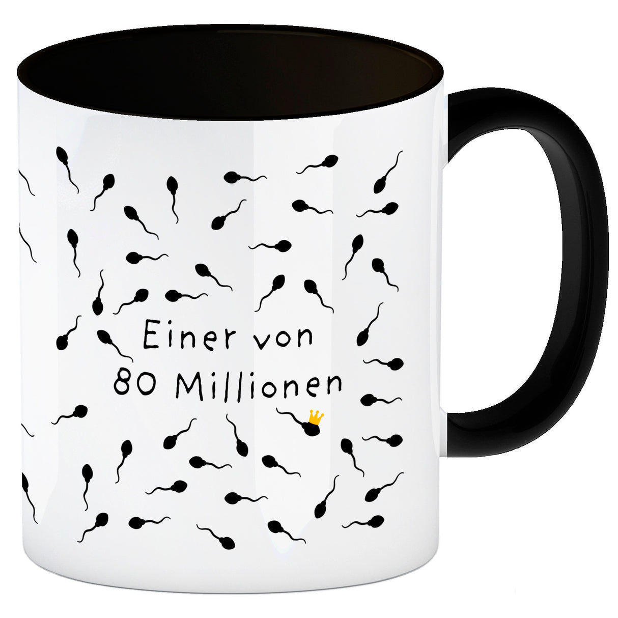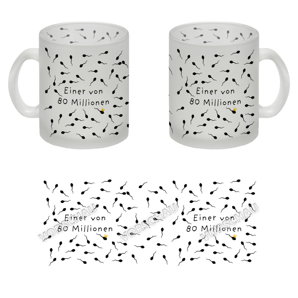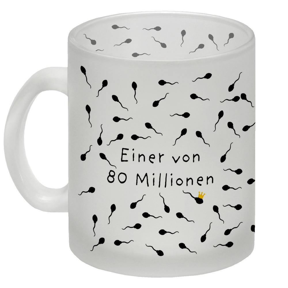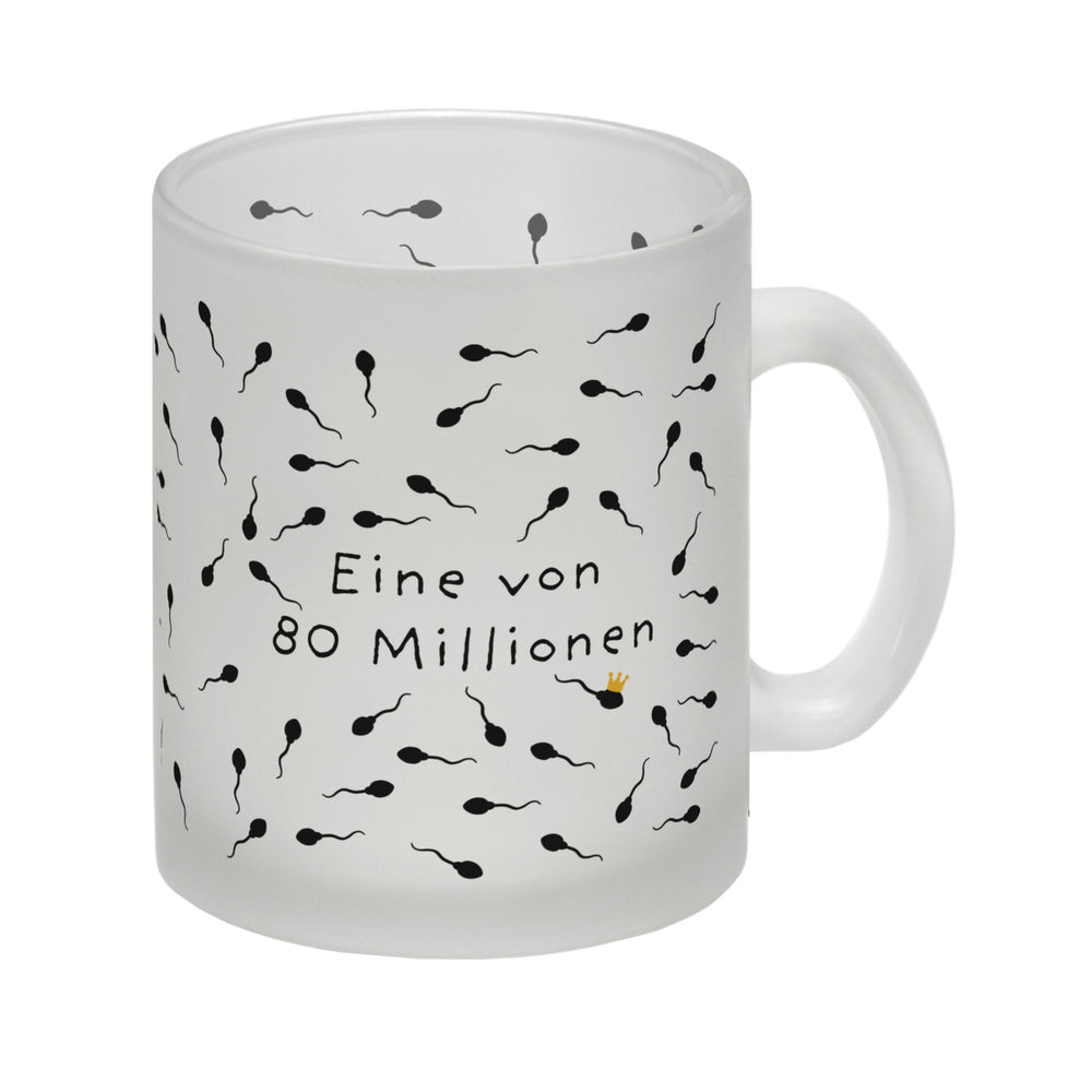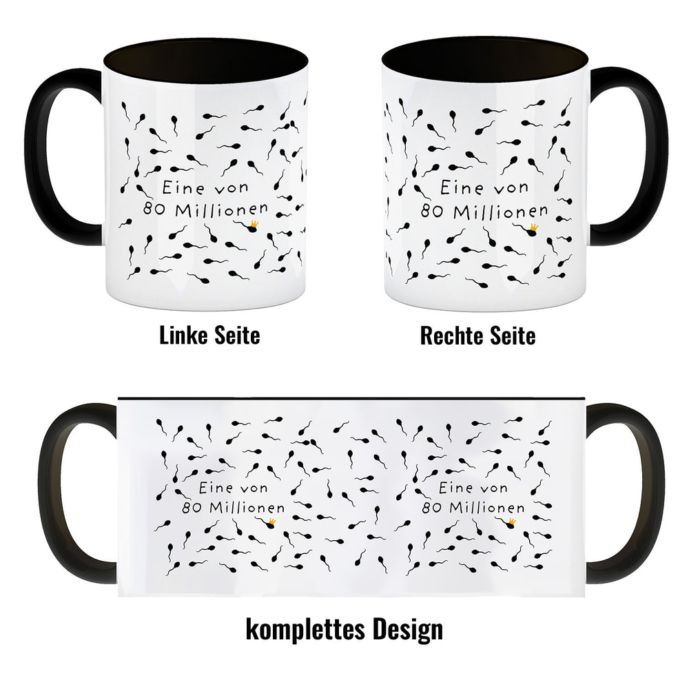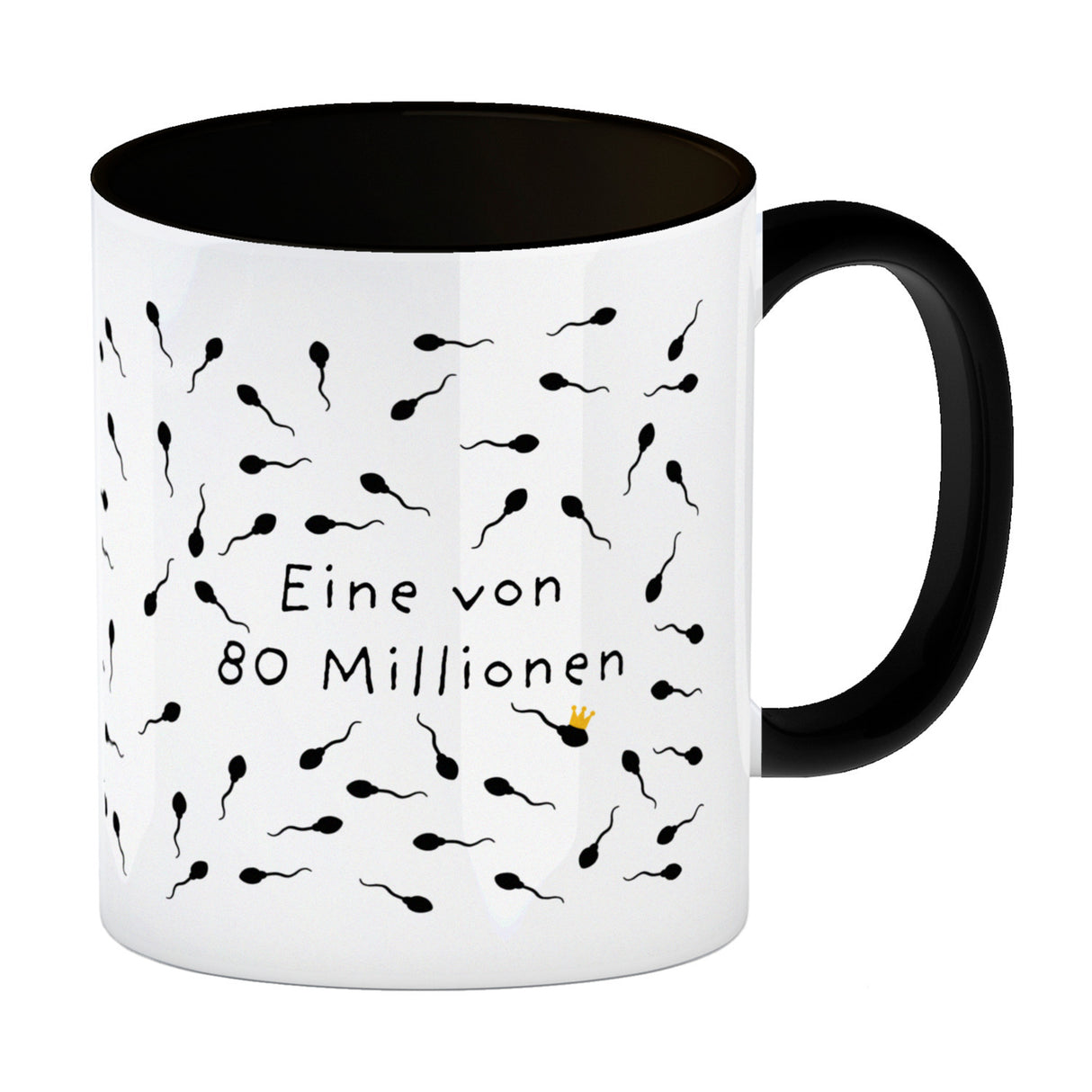 Der Kaffeebecher Einer von 80 Millionen ist ein witziges Geschenk für alle, die Humor beim Kaffeetrinken lieben und ihren Mitmenschen eine Freude machen möchten. Dank der verschiedenen Ausführungen - weiße Standardtasse, mit farbigem Henkel und Innenseite, als edle Glastasse oder in der exklusiven Silberedition mit Glitzereffekt - wird jeder seinen persönlichen Favoriten finden. Mit viel Liebe zum Detail in Deutschland hergestellt, ist der Kaffeebecher ein echter Hingucker und das perfekte Geschenk für Eltern, Kinder oder Freunde zu besonderen Anlässen. Ein Geschenk, das an die Tatsache erinnert, dass wir alle bereits am Anfang unseres Lebens den Wettbewerb mit der größten Konkurrenz gewonnen haben: Das Sperma-Rennen!