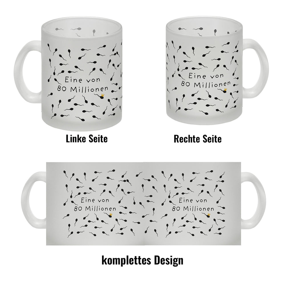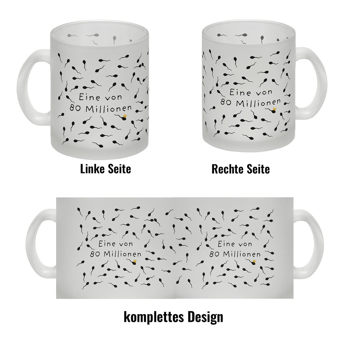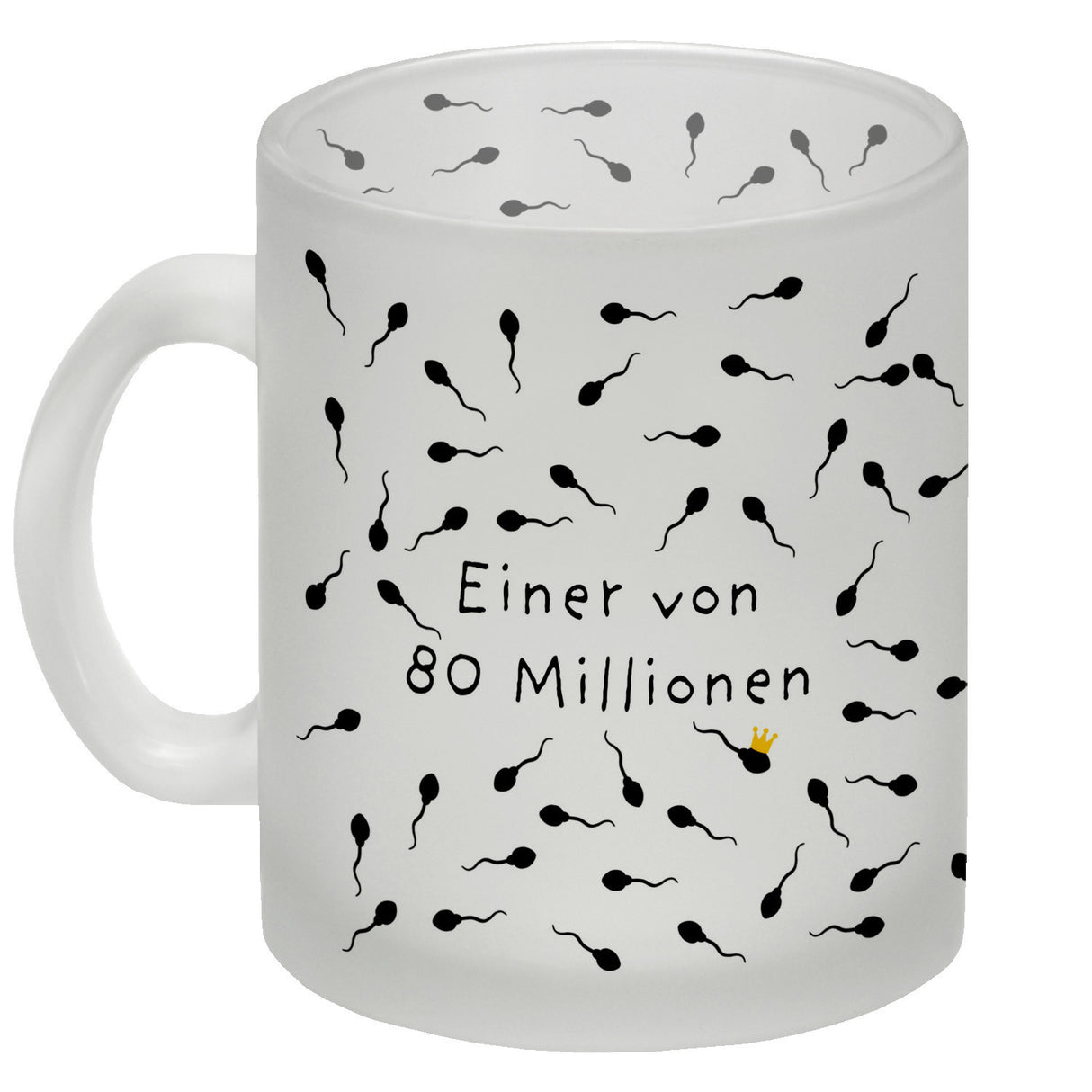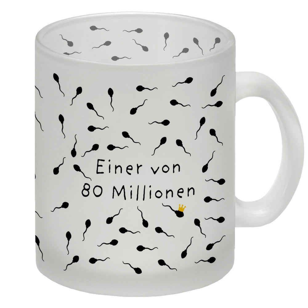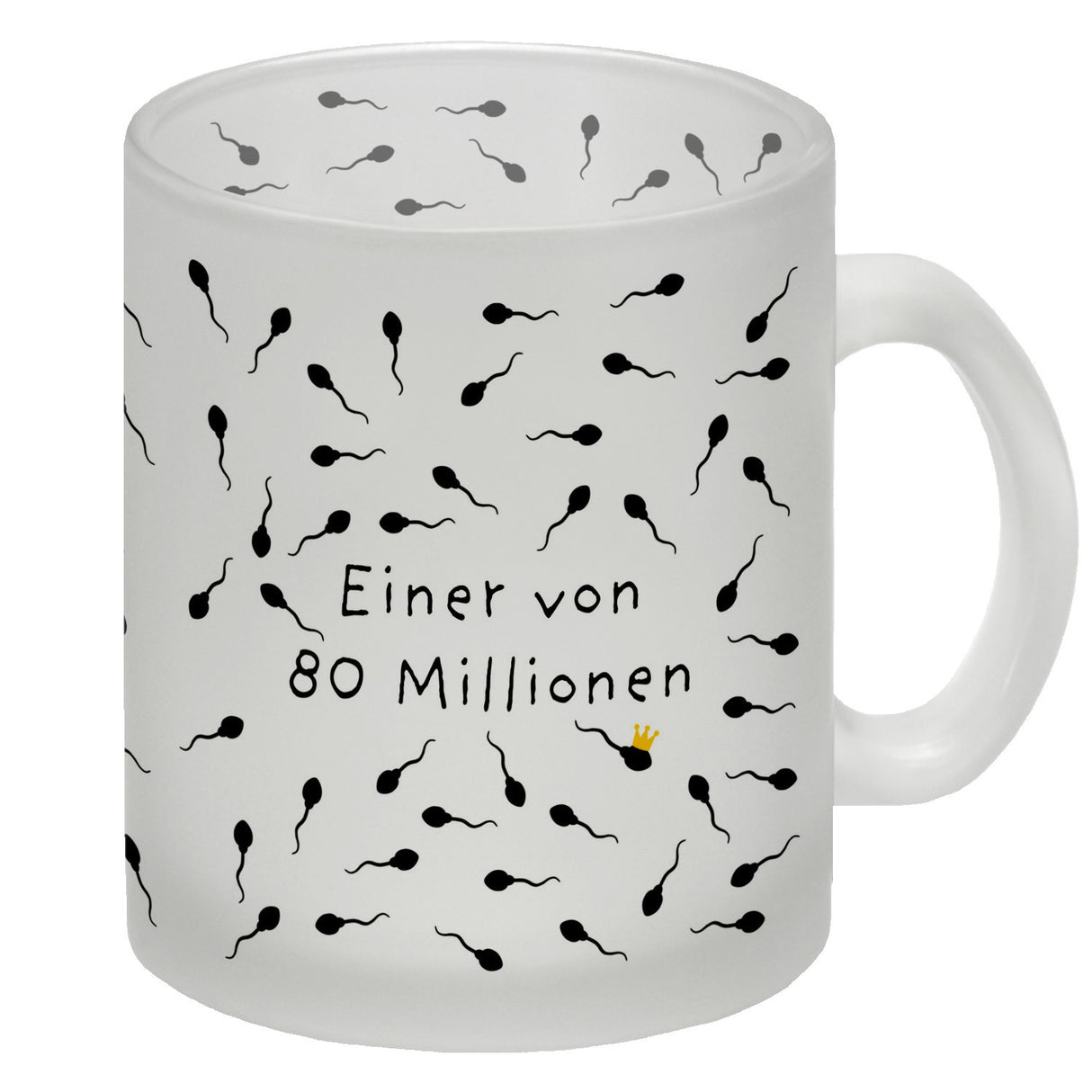 Der Kaffeebecher Einer von 80 Millionen ist ein witziges Geschenk für alle, die Humor beim Kaffeetrinken lieben und ihren Mitmenschen eine Freude machen möchten. Dank der verschiedenen Ausführungen - weiße Standardtasse, mit farbigem Henkel und Innenseite, als edle Glastasse oder in der exklusiven Silberedition mit Glitzereffekt - wird jeder seinen persönlichen Favoriten finden. Mit viel Liebe zum Detail in Deutschland hergestellt, ist der Kaffeebecher ein echter Hingucker und das perfekte Geschenk für Eltern, Kinder oder Freunde zu besonderen Anlässen. Ein Geschenk, das an die Tatsache erinnert, dass wir alle bereits am Anfang unseres Lebens den Wettbewerb mit der größten Konkurrenz gewonnen haben: Das Sperma-Rennen!