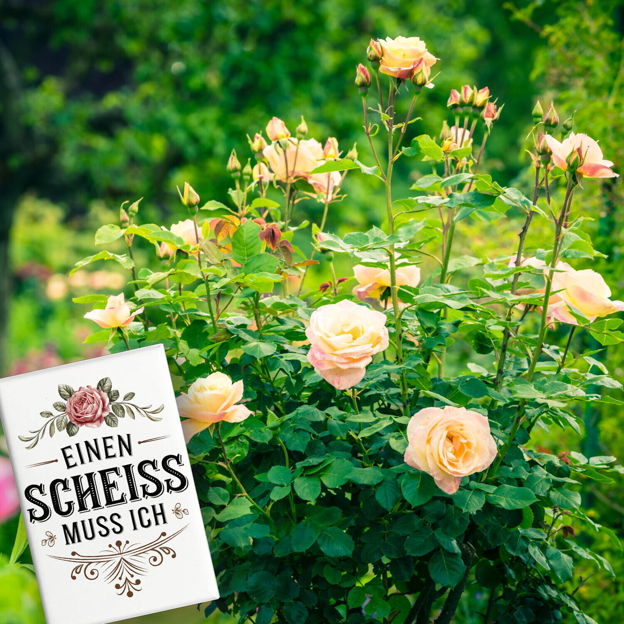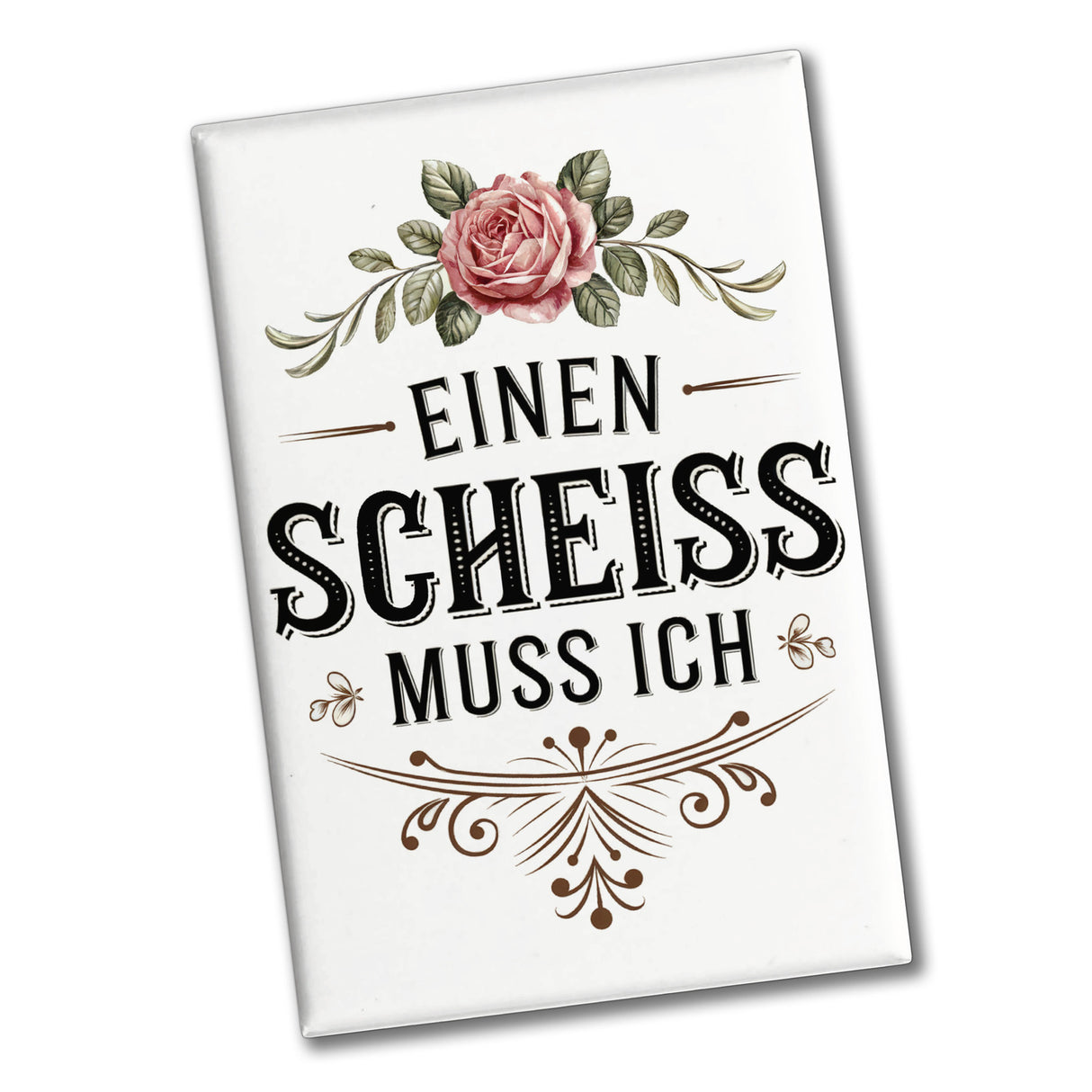 Dieser eckige Kühlschrankmagnet zeigt eine kunstvolle Rose, umgeben von grünen Blättern, in einem eleganten Vintage-Design. Der freche Spruch "EINEN SCHEISS MUSS ICH" in stilvollen schwarzen Buchstaben sorgt für humorvolle Momente. Der sanfte beig Hinweise: Größe: ca. 8x5,5 cm