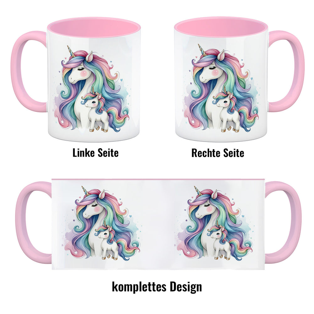 - Dieser zauberhafte Kaffeebecher zeigt eine Einhorn-Mama mit ihrem niedlichen Fohlen – ein Traum in Regenbogenfarben! Die Mama-Einhorn hat eine prächtige, bunte Mähne, und das kleine Fohlen verzaubert jeden mit seinem süßen Blick.