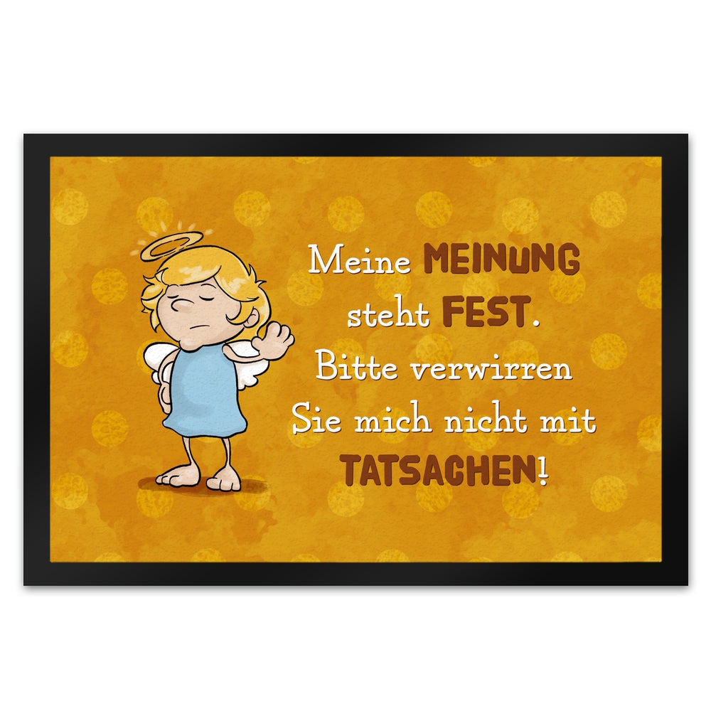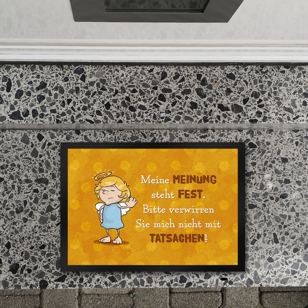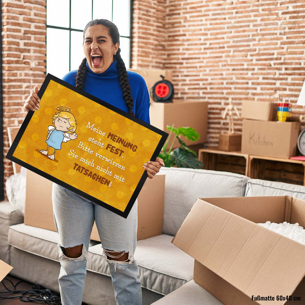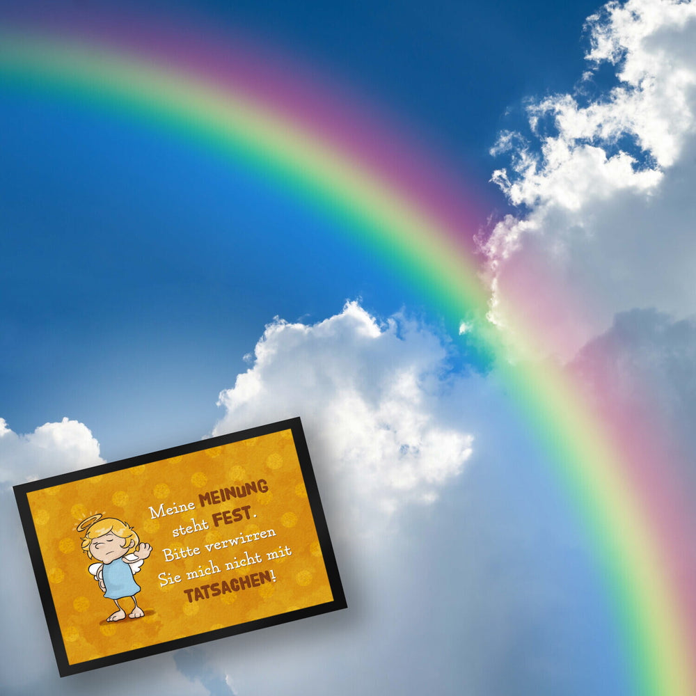 - Du bist auf der Suche nach einer kreativen Geschenkidee? Dann ist die neckische Fußmatte mit Engel Motiv genau das Richtige! Ob zur Einweihungsparty oder beim Umzug in eine neue Wohnung - dieser sarkastisch-witzig gestaltete Fußabtreter wird garantiert viele Lacher hervorrufen. Mit dem Spruch: Meine Meinung steht fest. Bitte verwirren Sie mich nicht mit Tatsachen! versprüht die Türmatte himmlische Ironie.