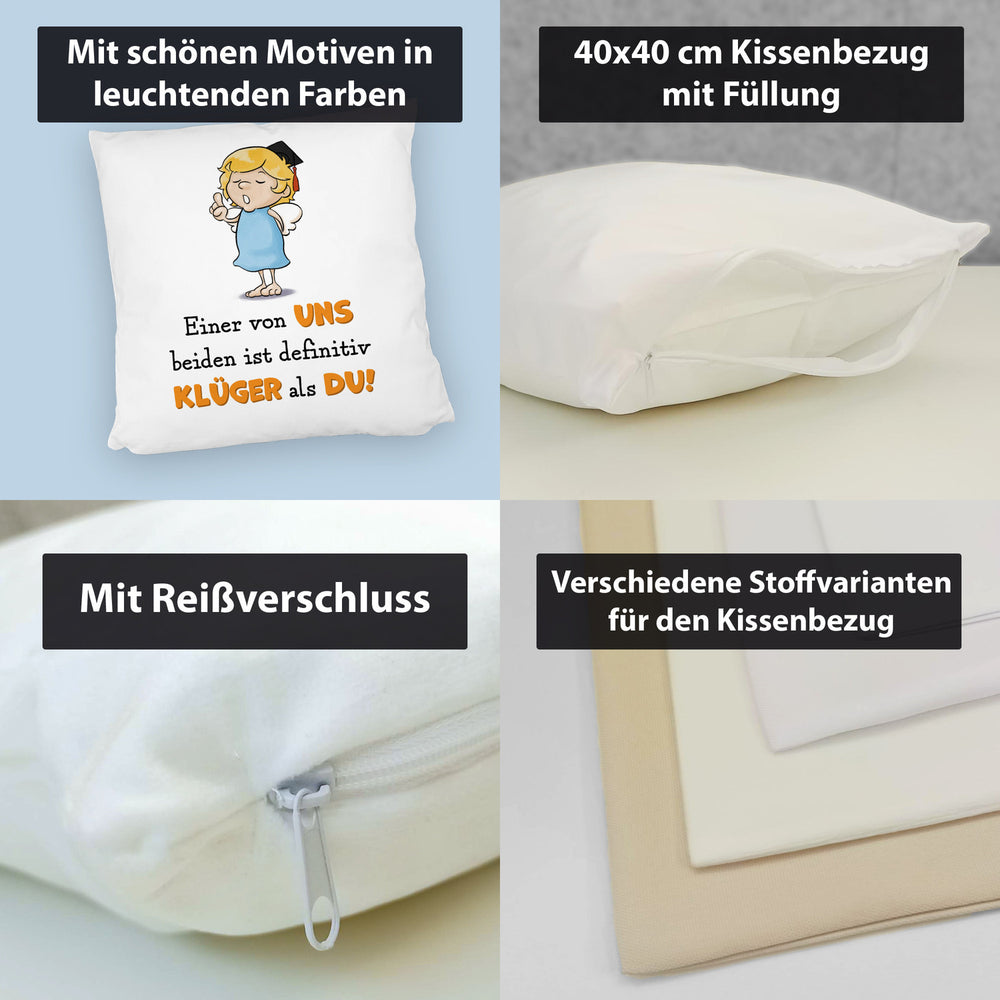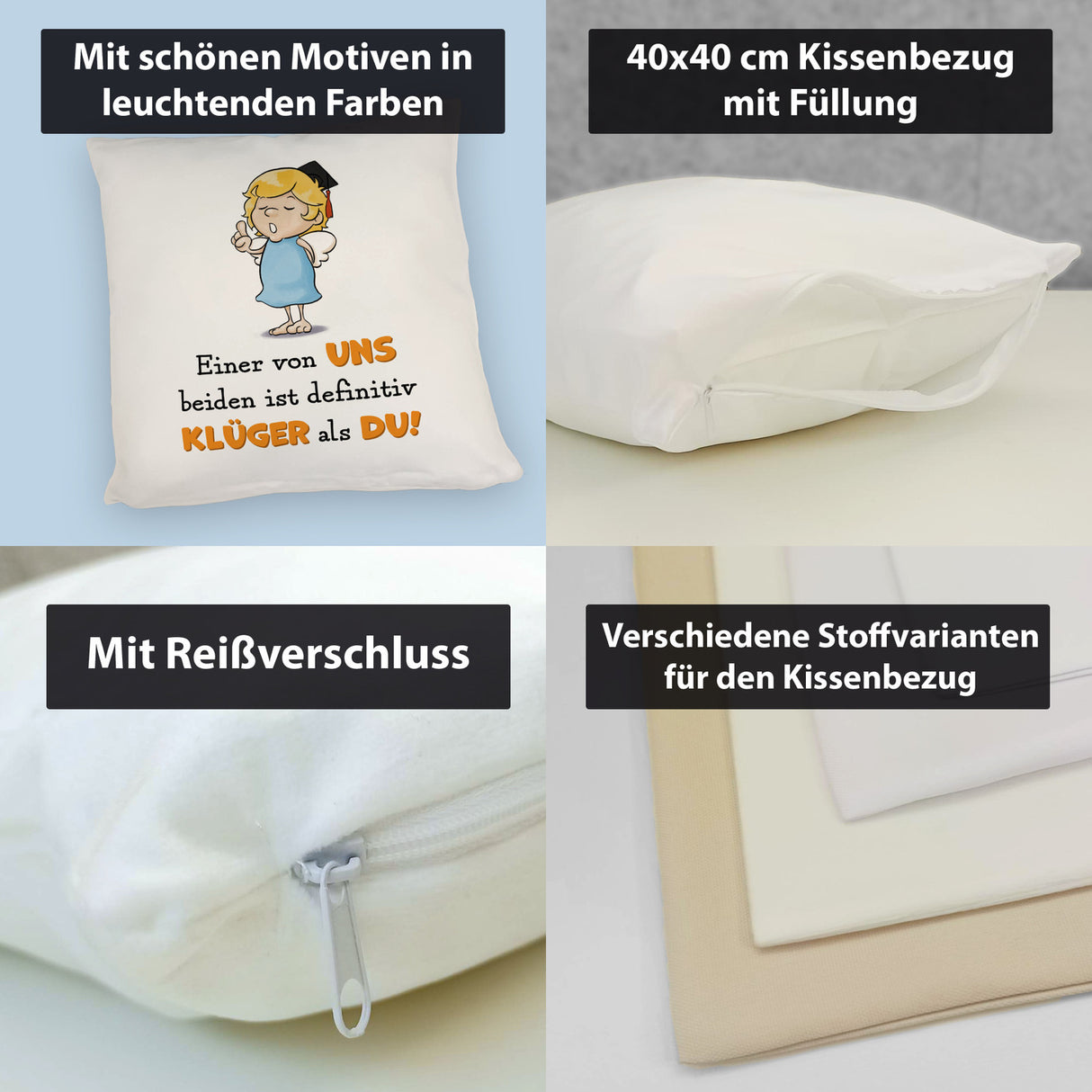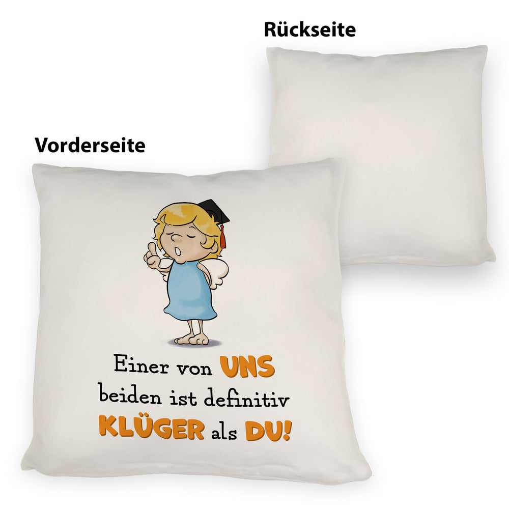 - 1x Engel Kissen mit Spruch - Einer von uns ist klüger als du! in der gewählten Ausführung