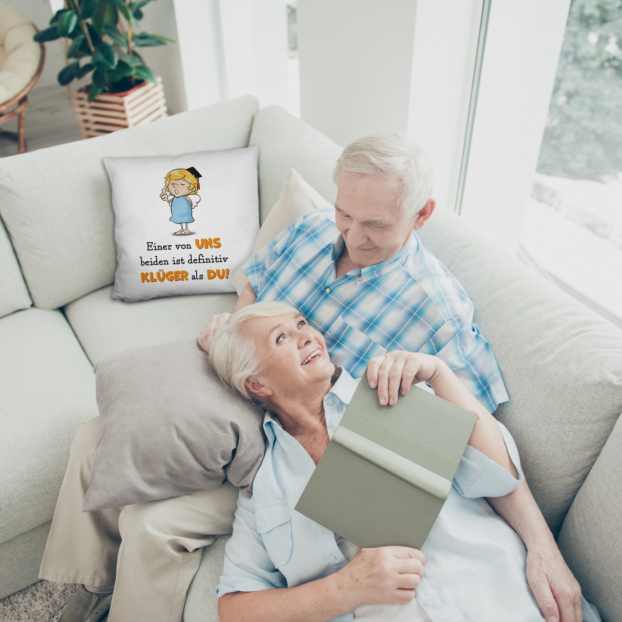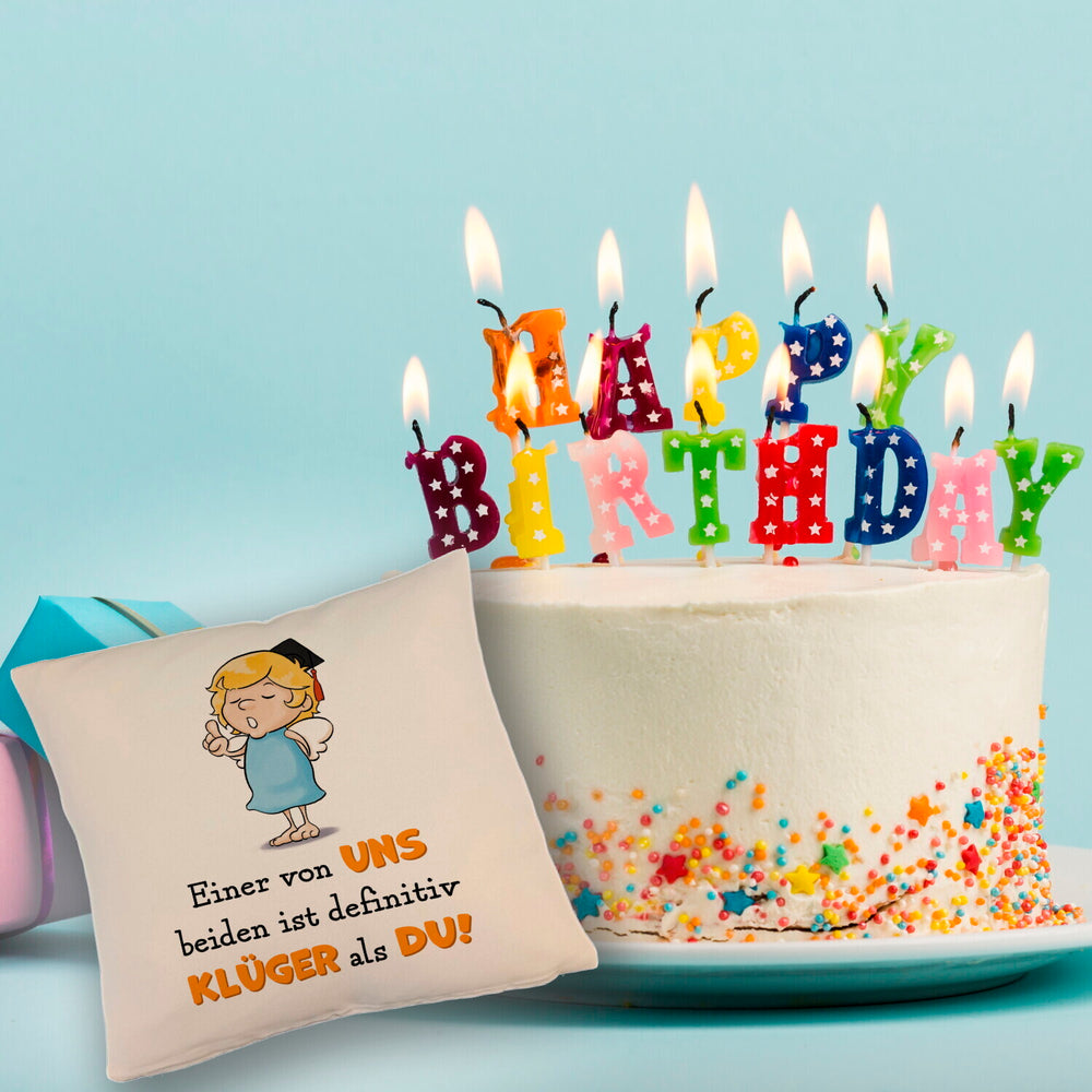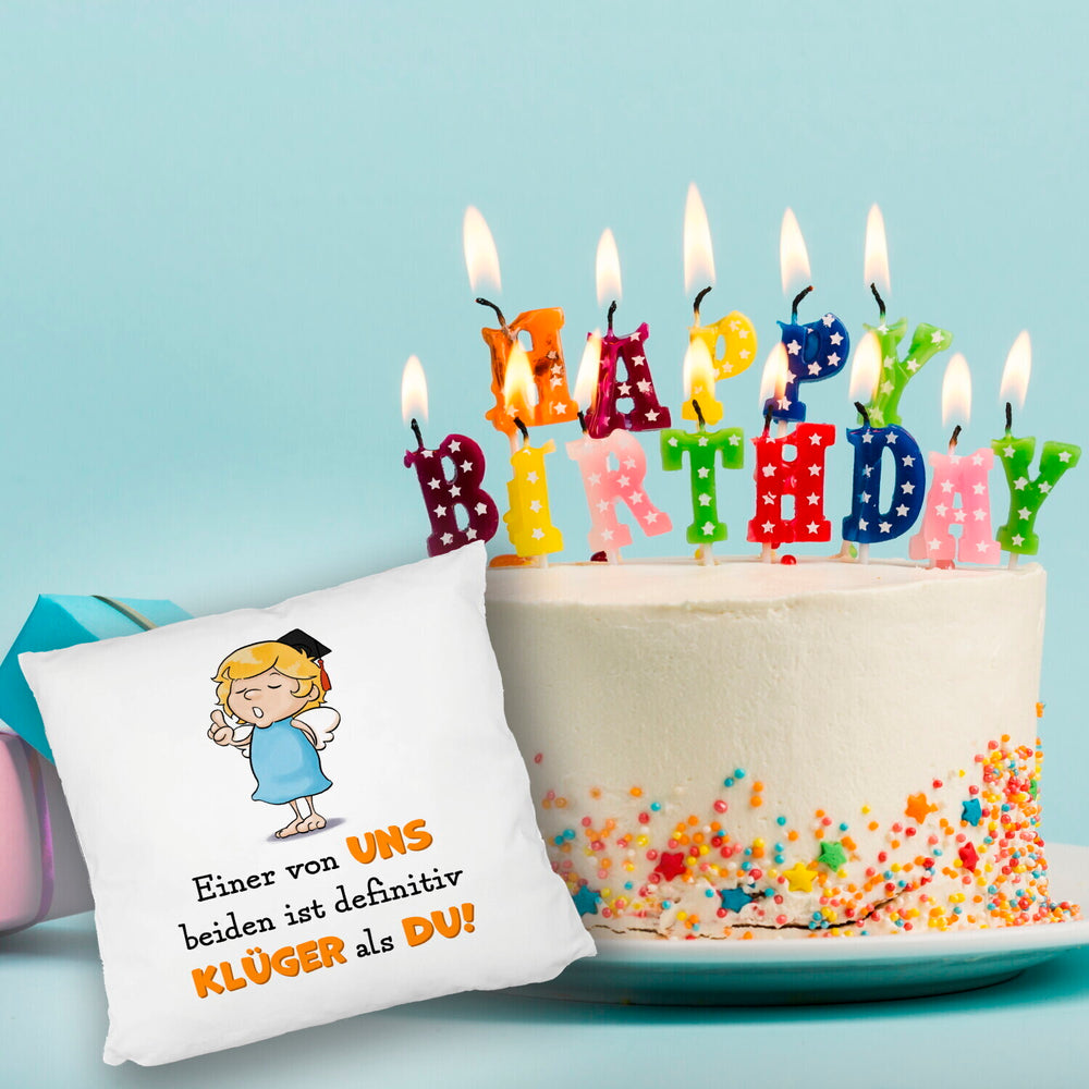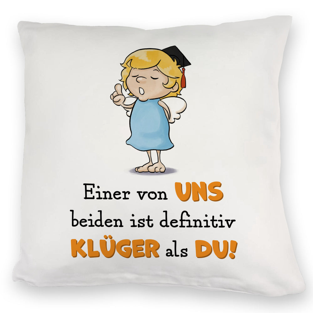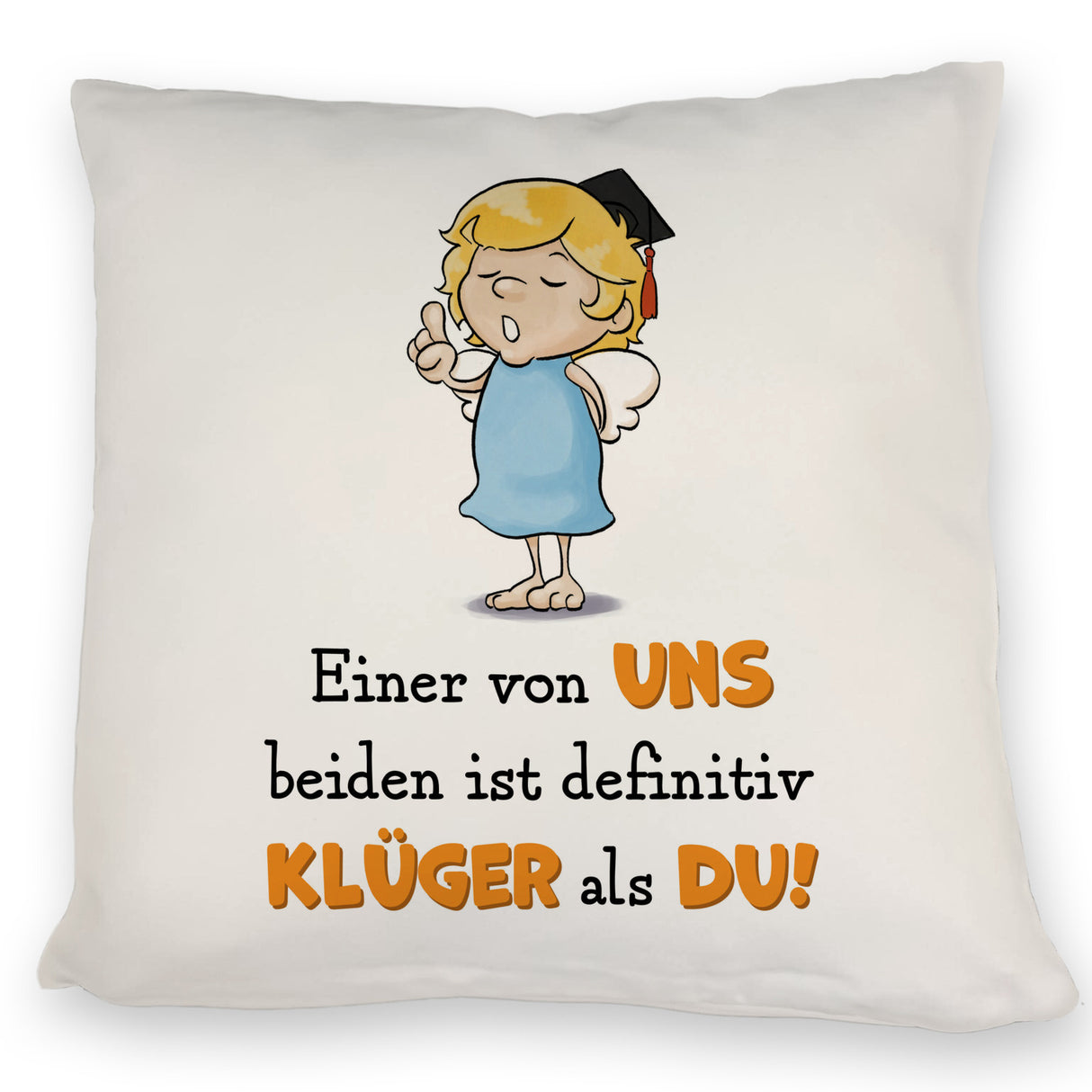 - Dieses neckische Kissen mit Engel Motiv ist eine fantastische Geschenkidee für jeden Scherzkeks zum Geburtstag. Auf dem Artikel steht der witzige und ironische Spruch: Einer von uns beiden ist definitiv klüger als du!. Darüber hinaus haben Sie ein schönes Dekokissen.