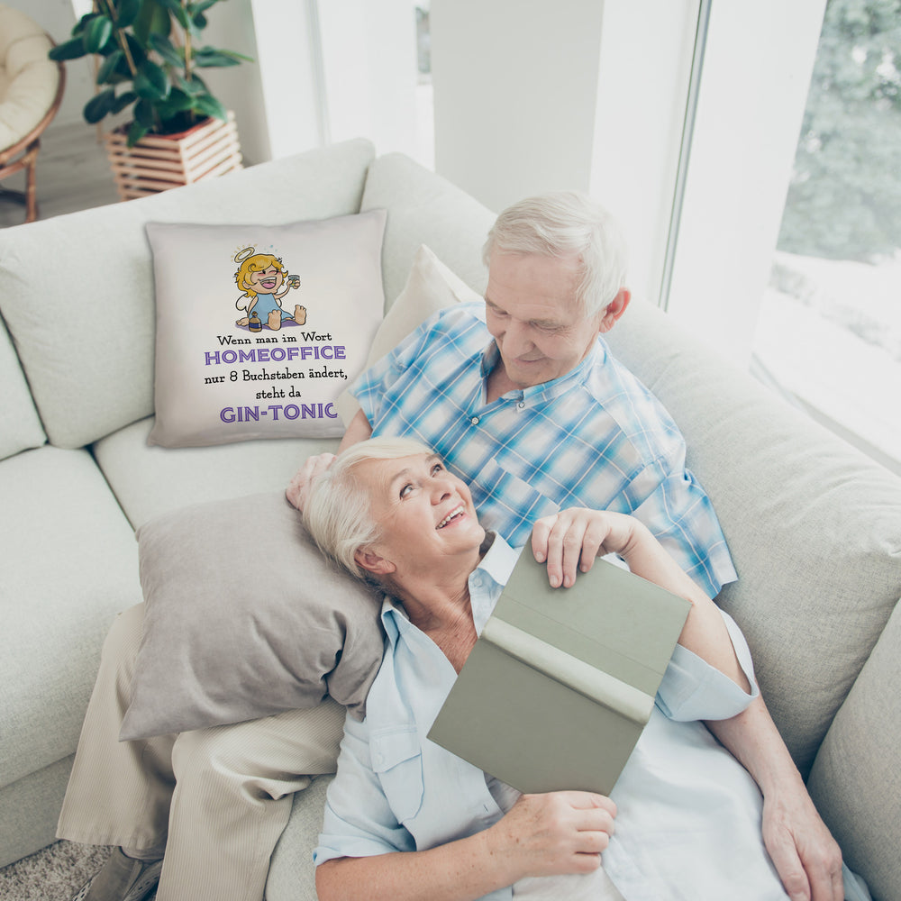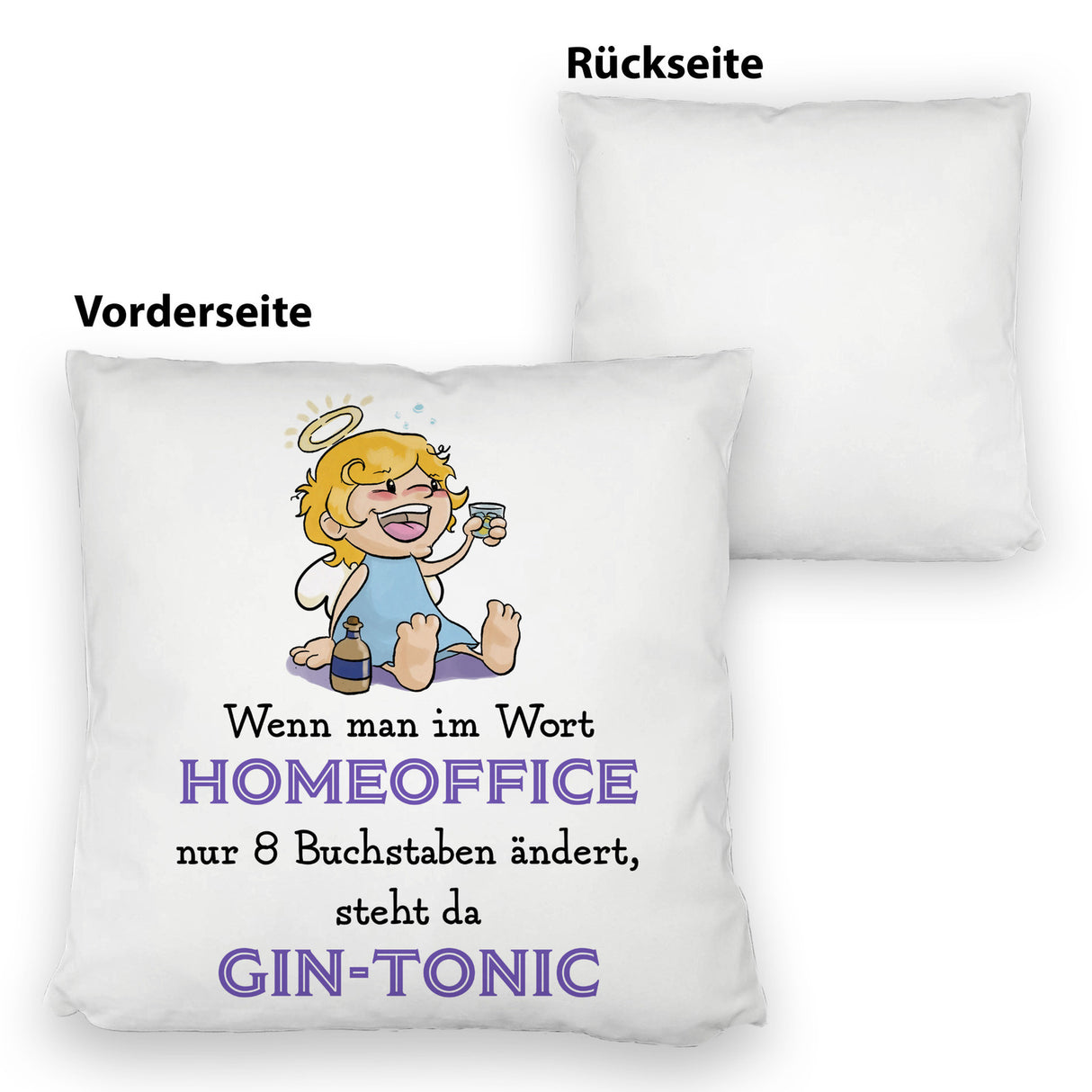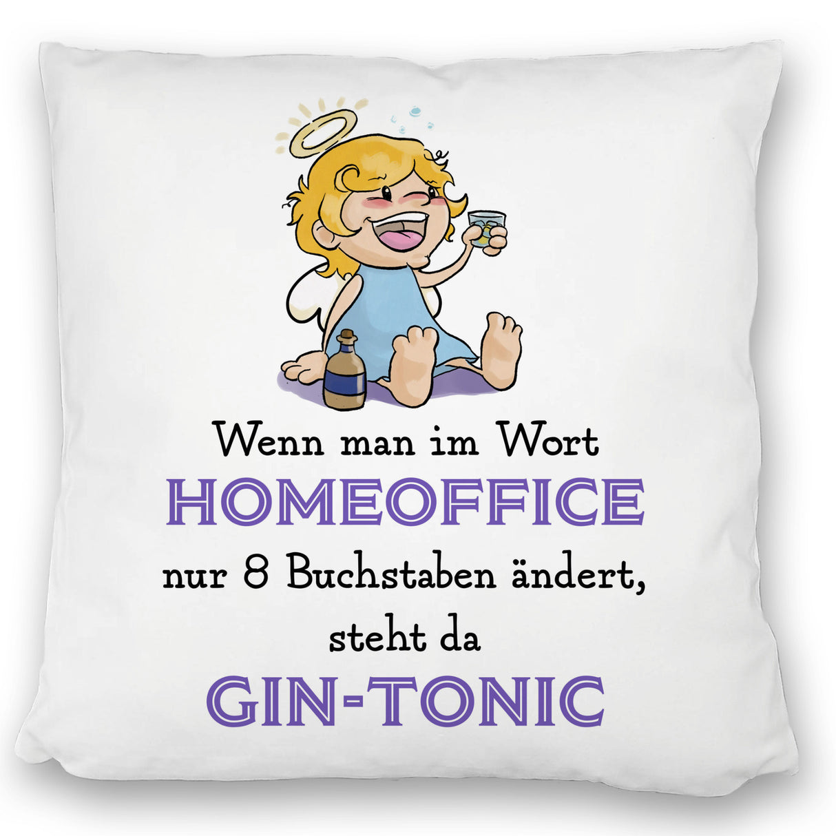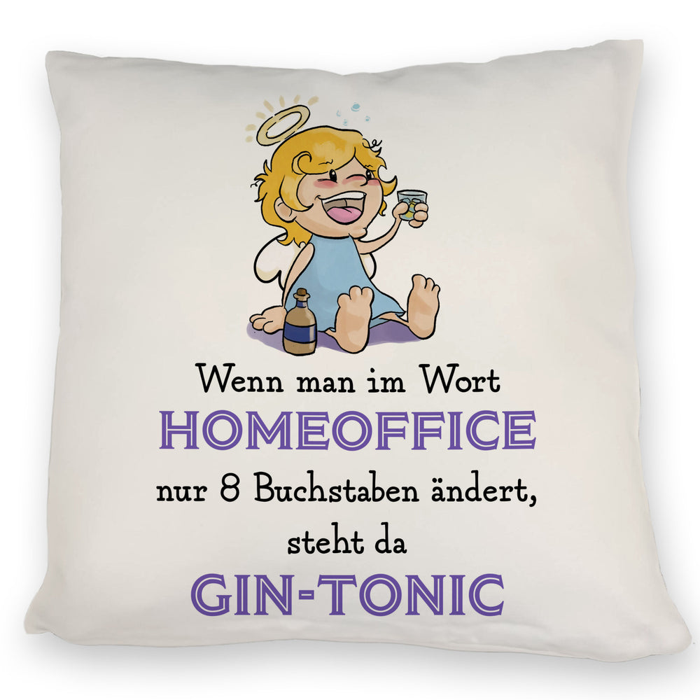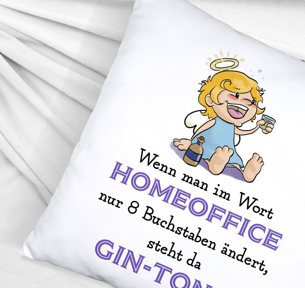 - Dieses neckische Kissen mit Engel Motiv ist eine fantastische Geschenkidee für jeden Scherzkeks zum Geburtstag. Auf dem Artikel steht der witzige und ironische Spruch: Wenn man im Wort Homeoffice nur 8 Buchstaben ändert, steht da Gin-Tonic. Darüber hinaus haben Sie ein schönes Dekokissen.