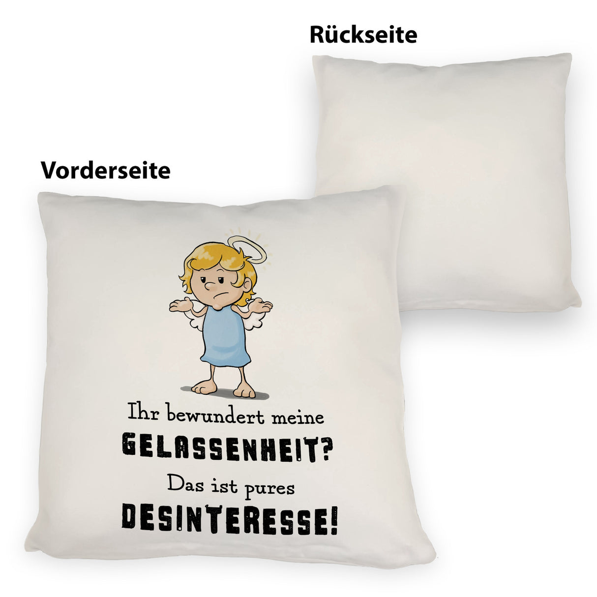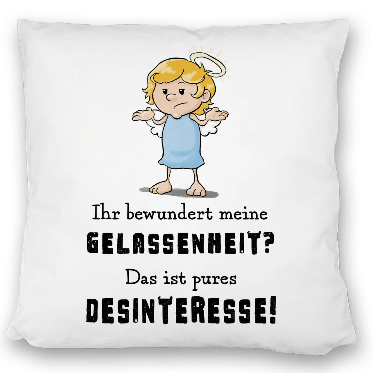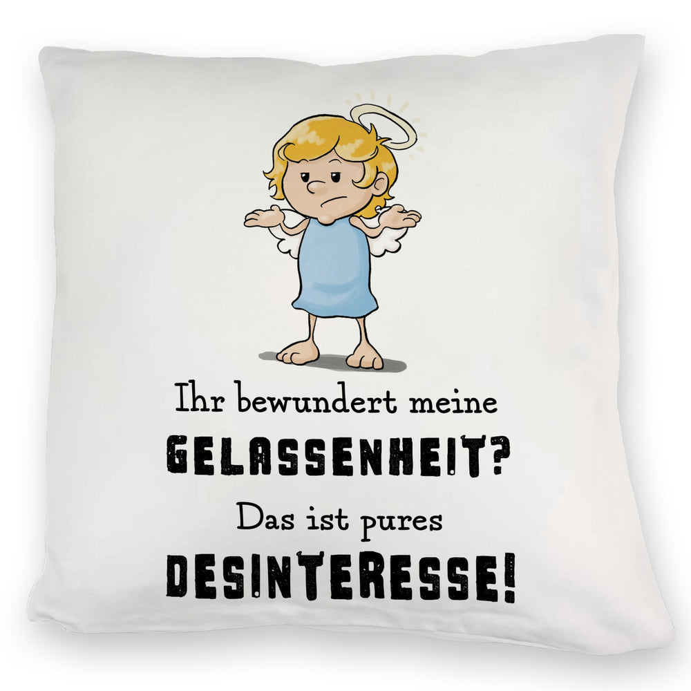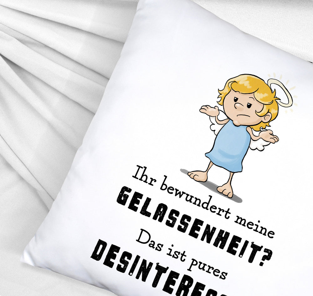 - Dieses neckische Kissen mit Engel Motiv ist eine fantastische Geschenkidee für jeden Scherzkeks zum Geburtstag. Auf dem Artikel steht der witzige und ironische Spruch: Ihr bewundert meine Gelassenheit? Das ist pures Desinteresse!. Darüber hinaus haben Sie ein schönes Dekokissen.