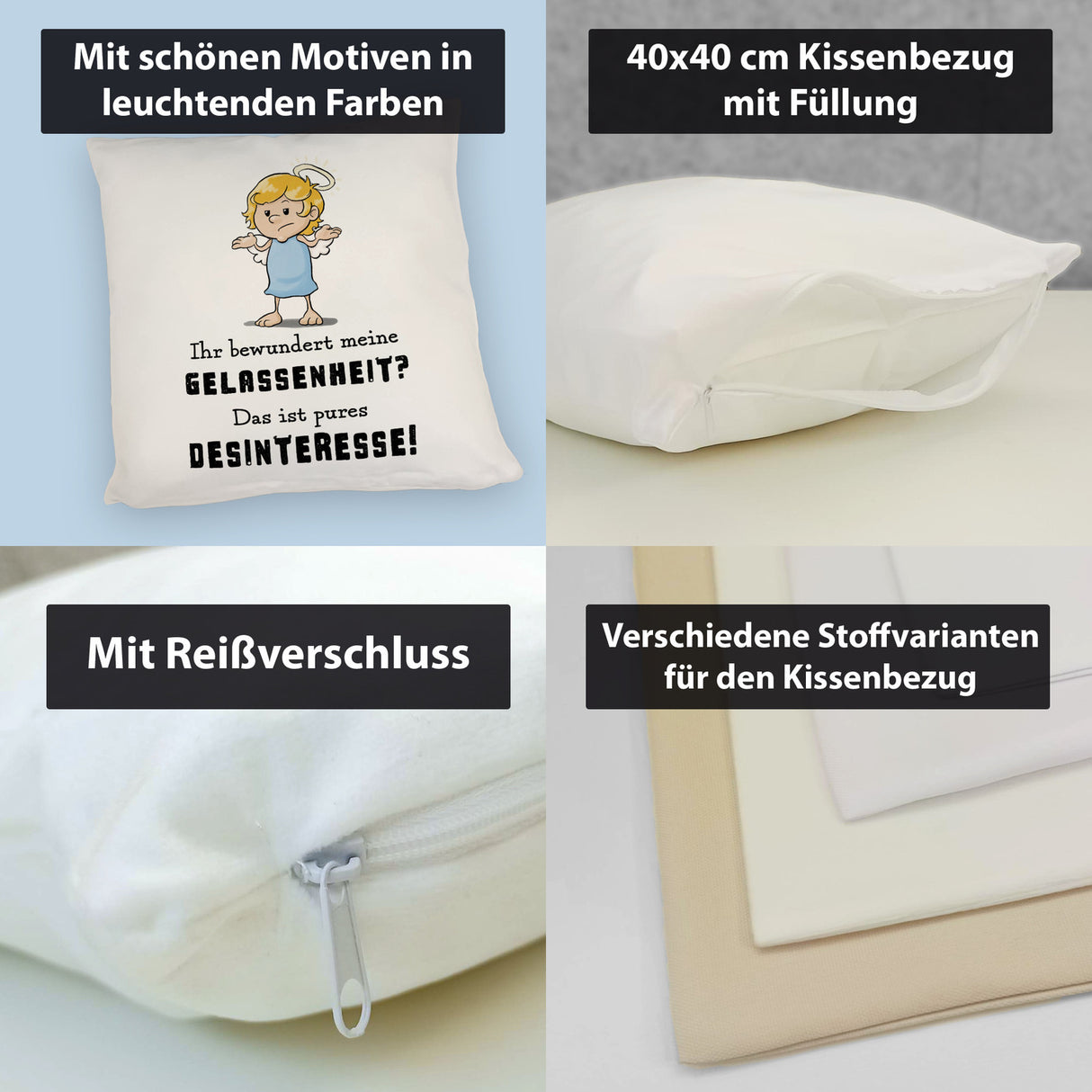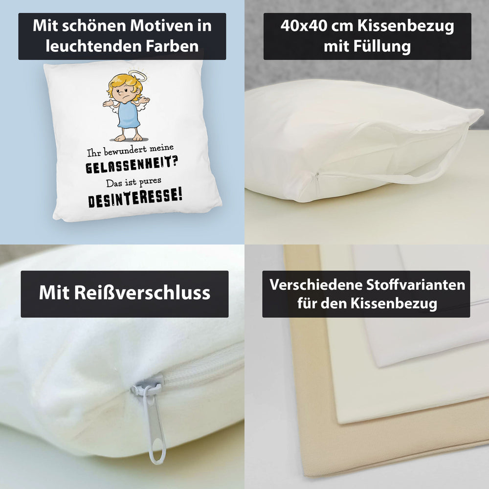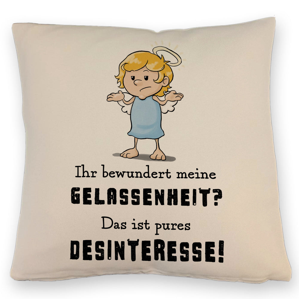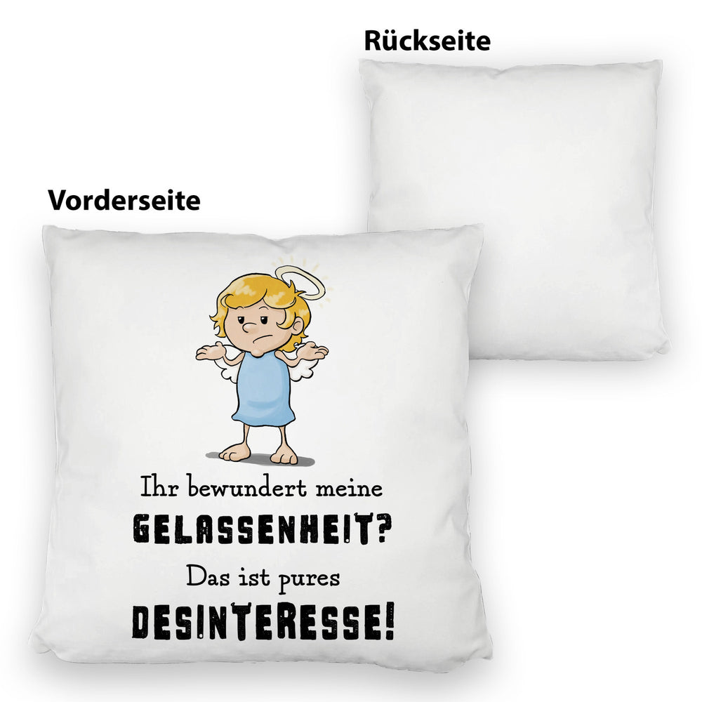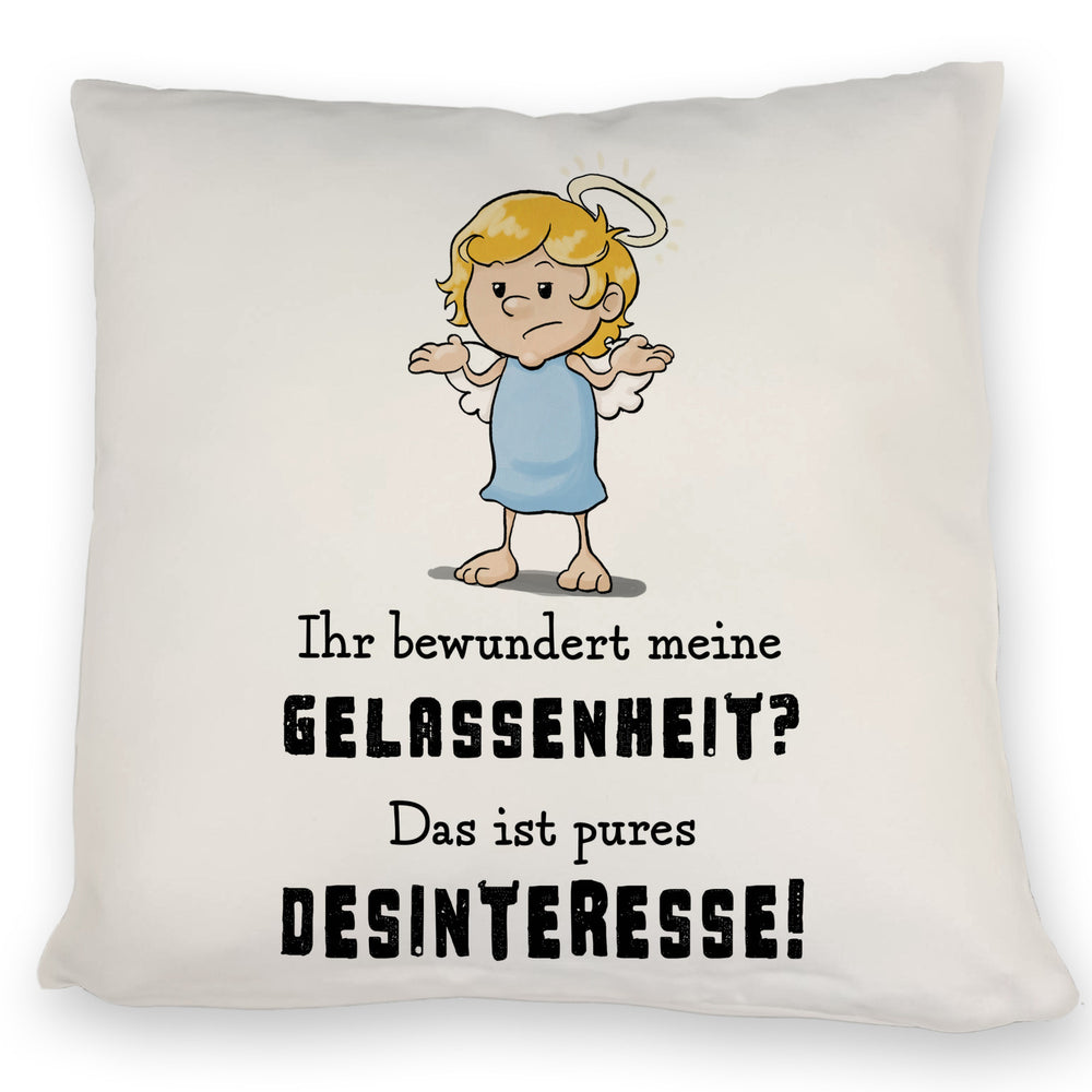 - Dieses neckische Kissen mit Engel Motiv ist eine fantastische Geschenkidee für jeden Scherzkeks zum Geburtstag. Auf dem Artikel steht der witzige und ironische Spruch: Ihr bewundert meine Gelassenheit? Das ist pures Desinteresse!. Darüber hinaus haben Sie ein schönes Dekokissen.
