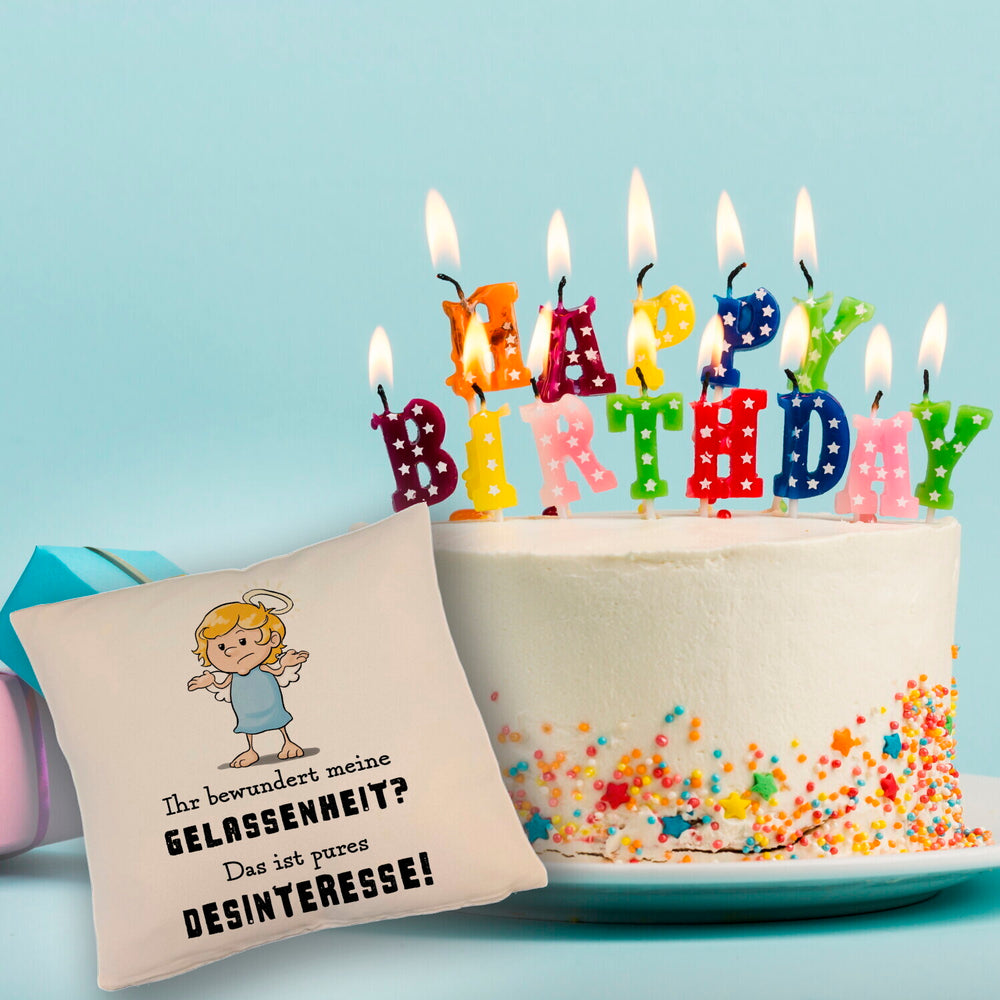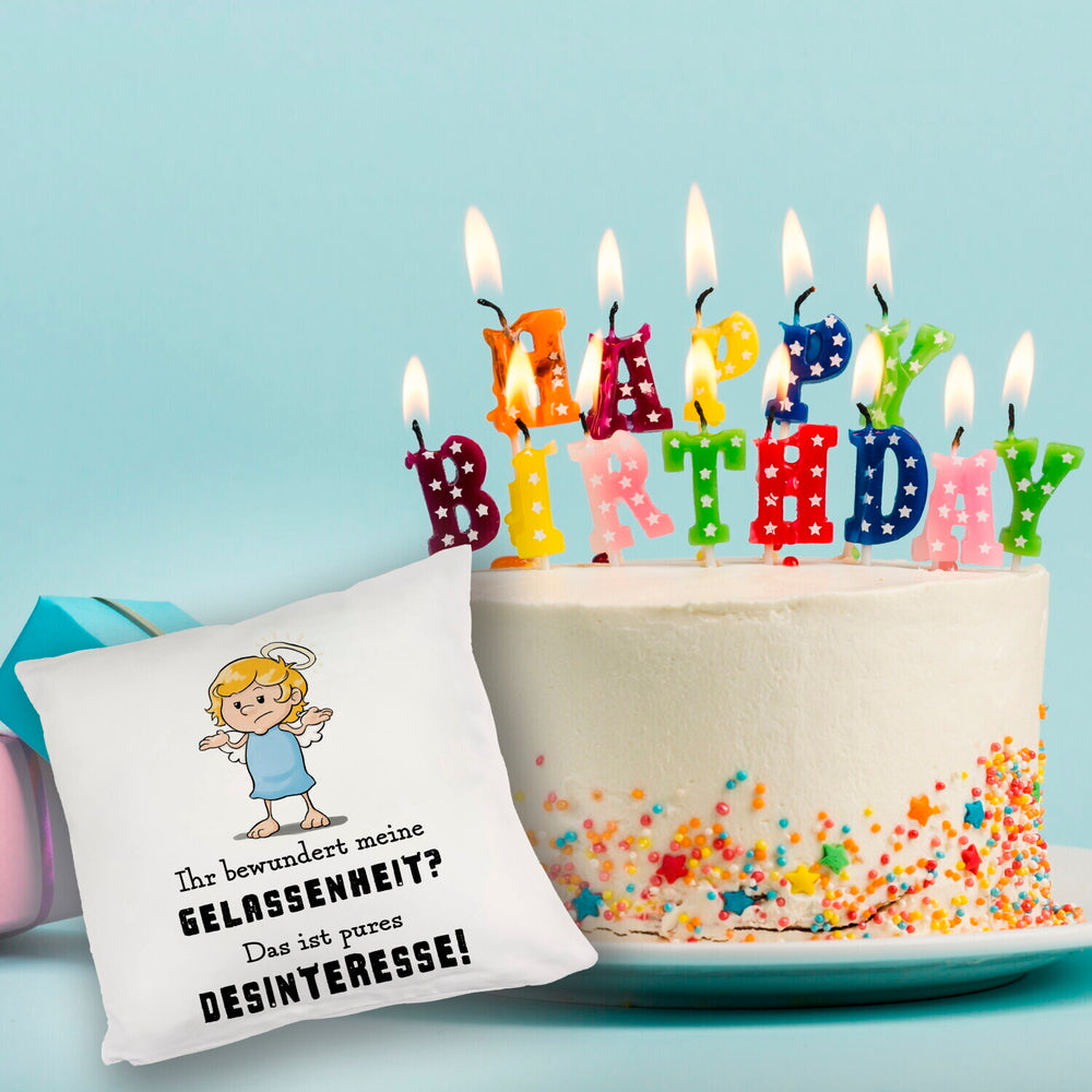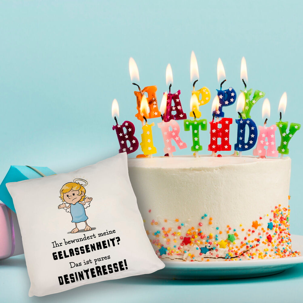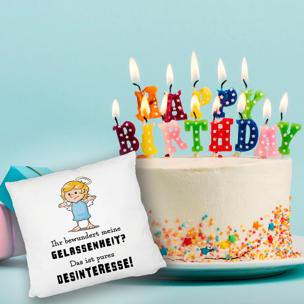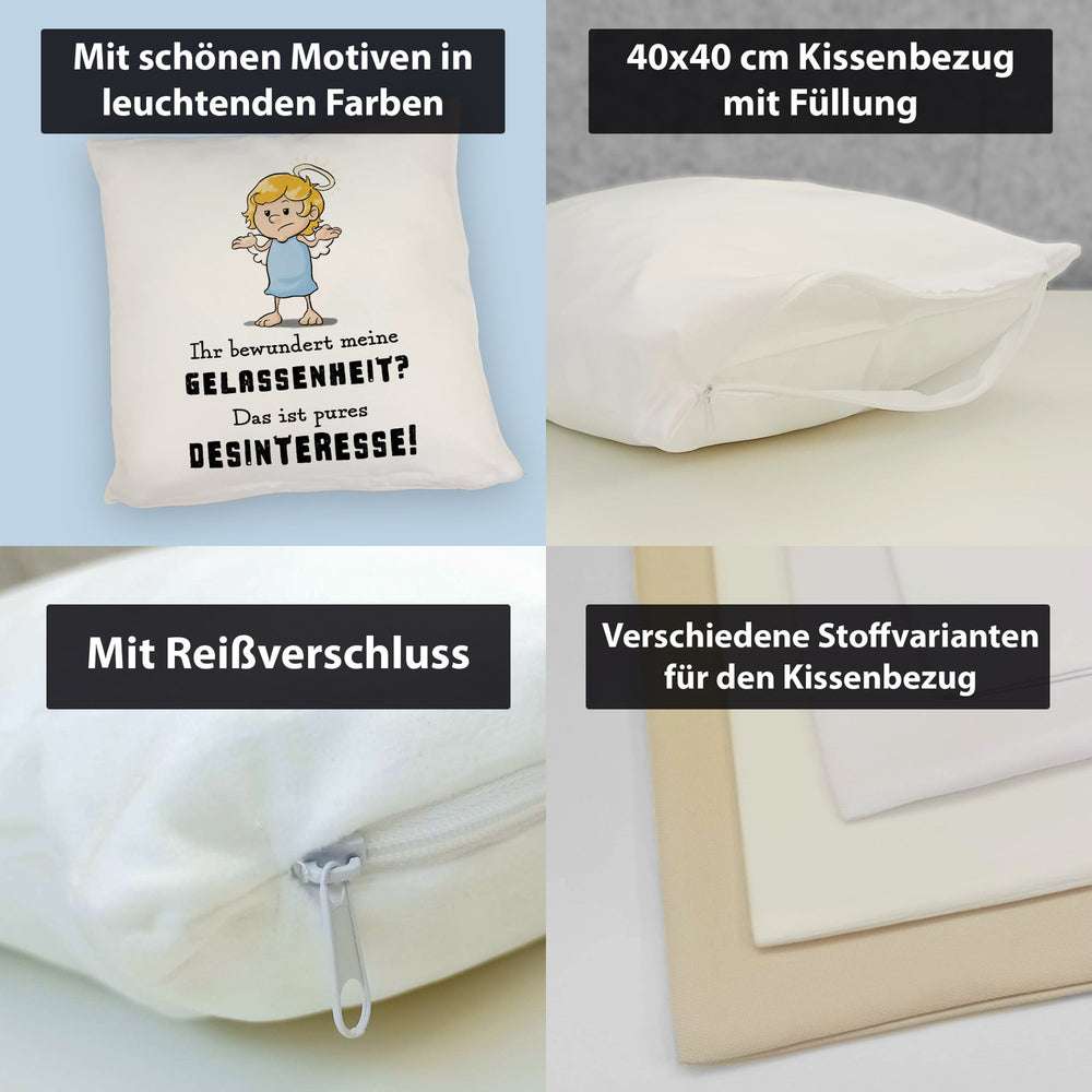 - Dieses neckische Kissen mit Engel Motiv ist eine fantastische Geschenkidee für jeden Scherzkeks zum Geburtstag. Auf dem Artikel steht der witzige und ironische Spruch: Ihr bewundert meine Gelassenheit? Das ist pures Desinteresse!. Darüber hinaus haben Sie ein schönes Dekokissen.