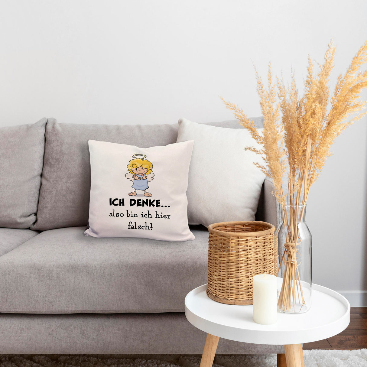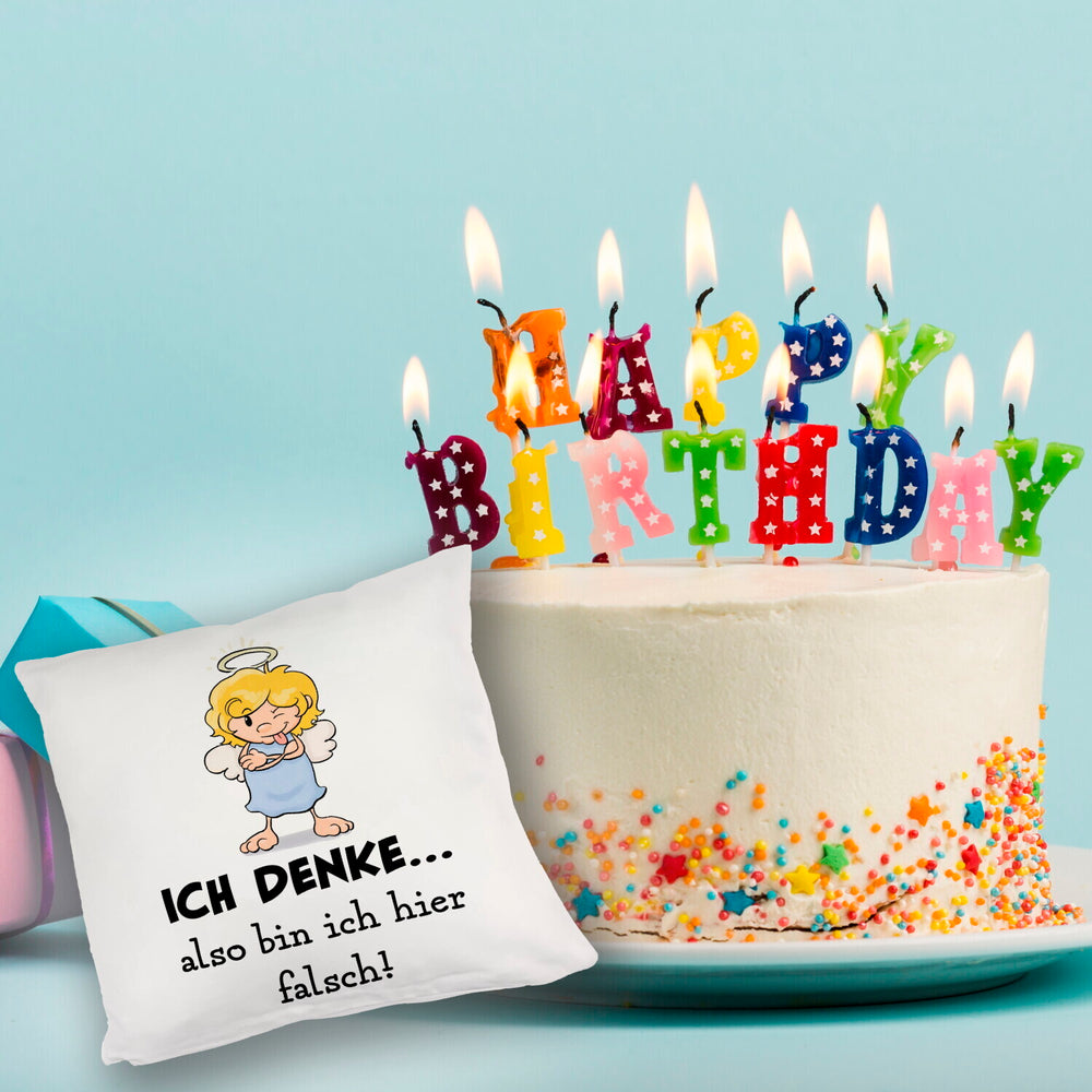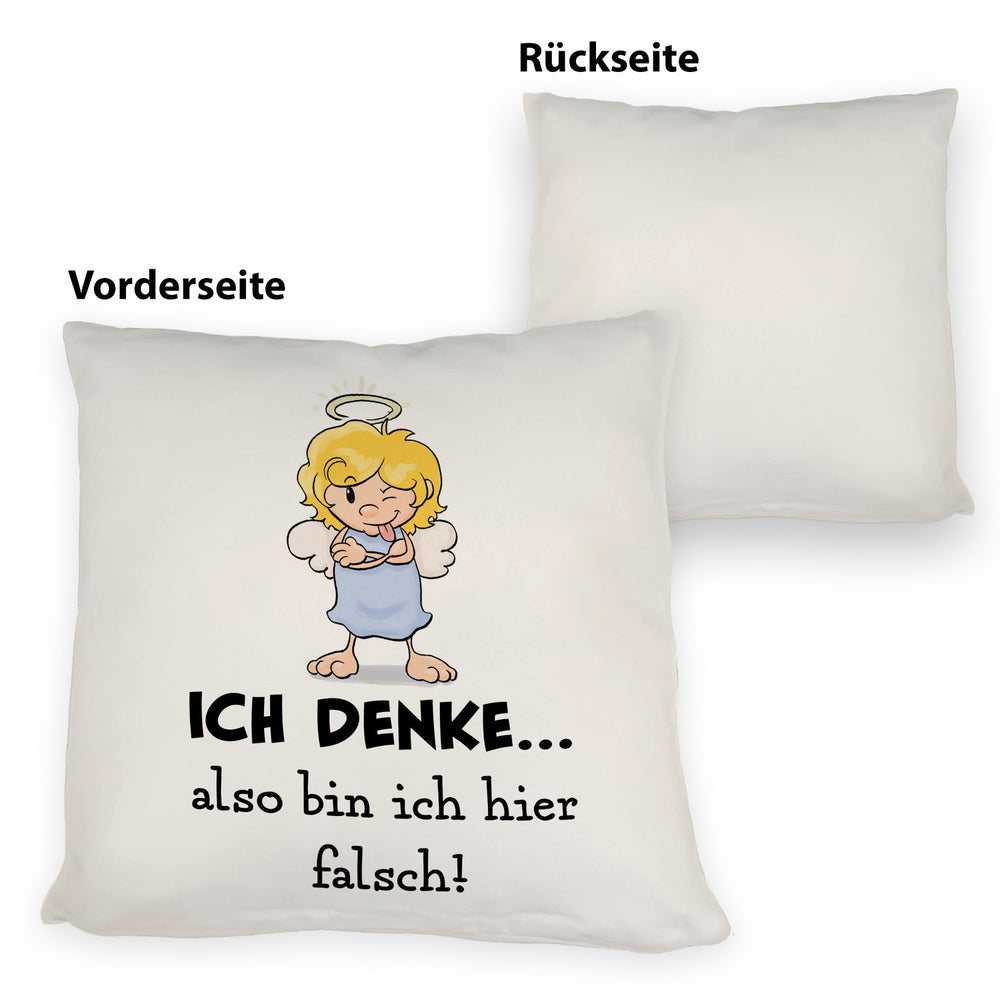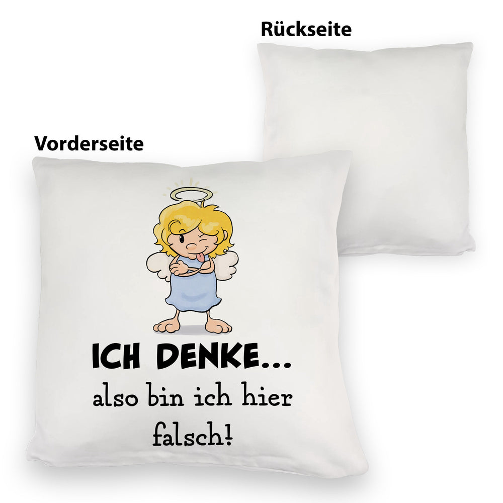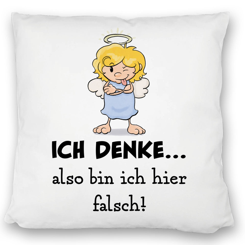 - Dieses neckische Kissen mit Engel Motiv ist eine fantastische Geschenkidee für jeden Scherzkeks zum Geburtstag. Auf dem Artikel steht der witzige und ironische Spruch: Ich denke…also bin ich hier falsch!. Darüber hinaus haben Sie ein schönes Dekokissen.