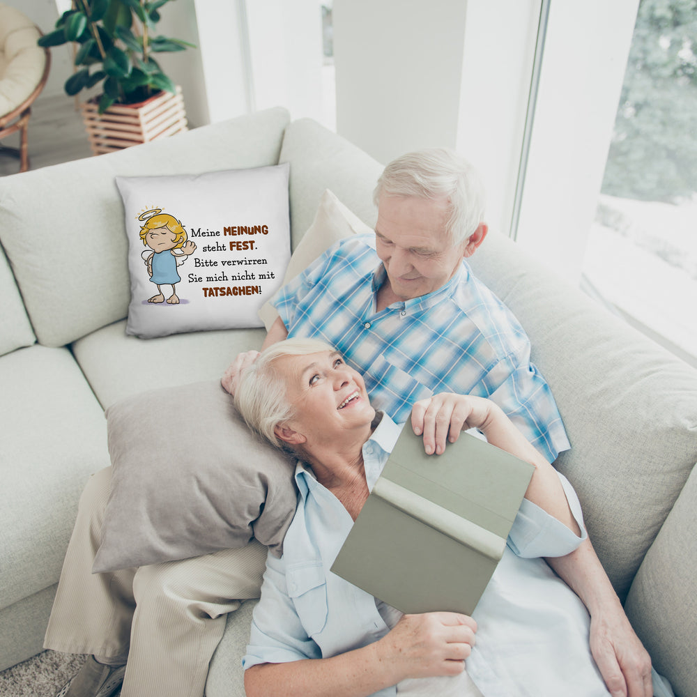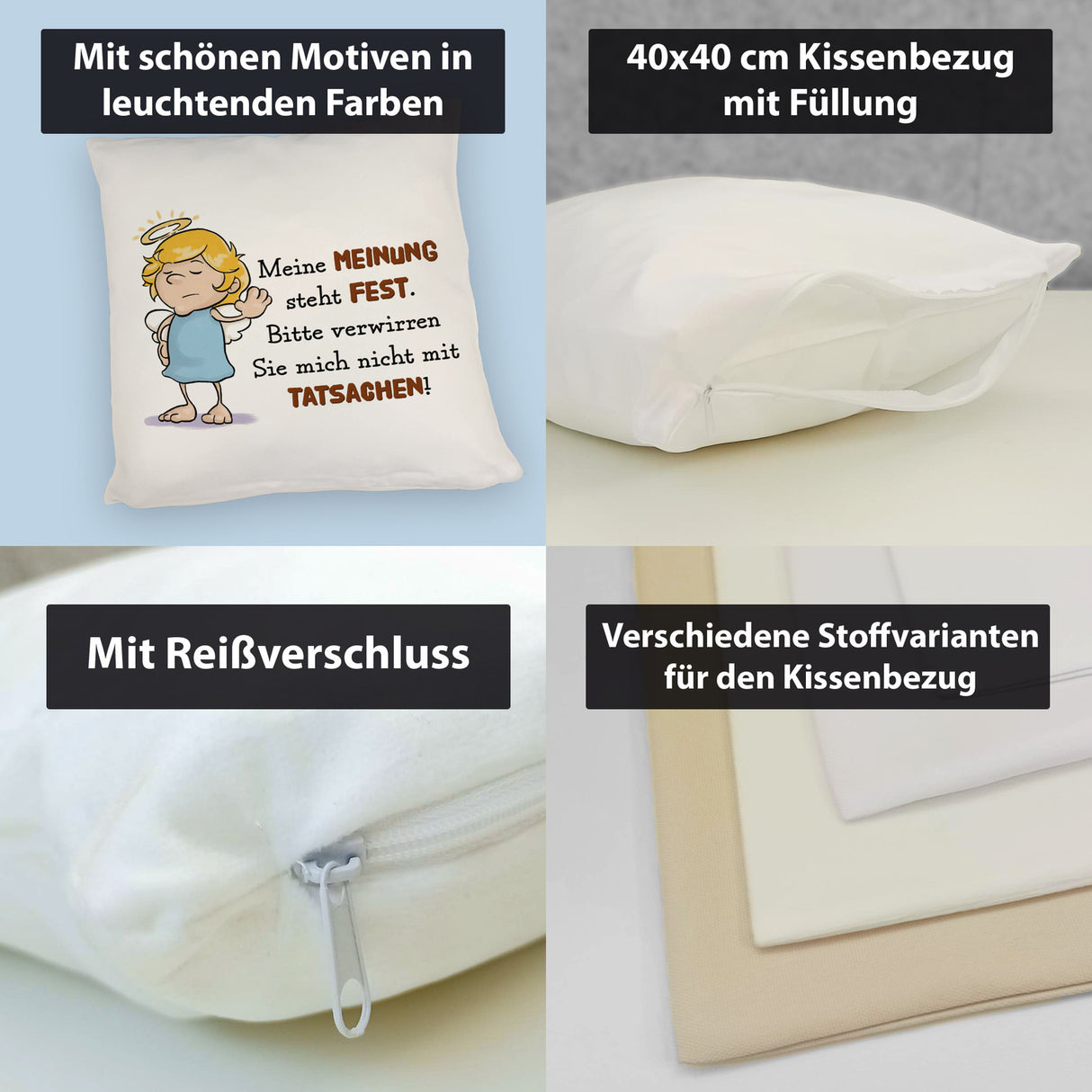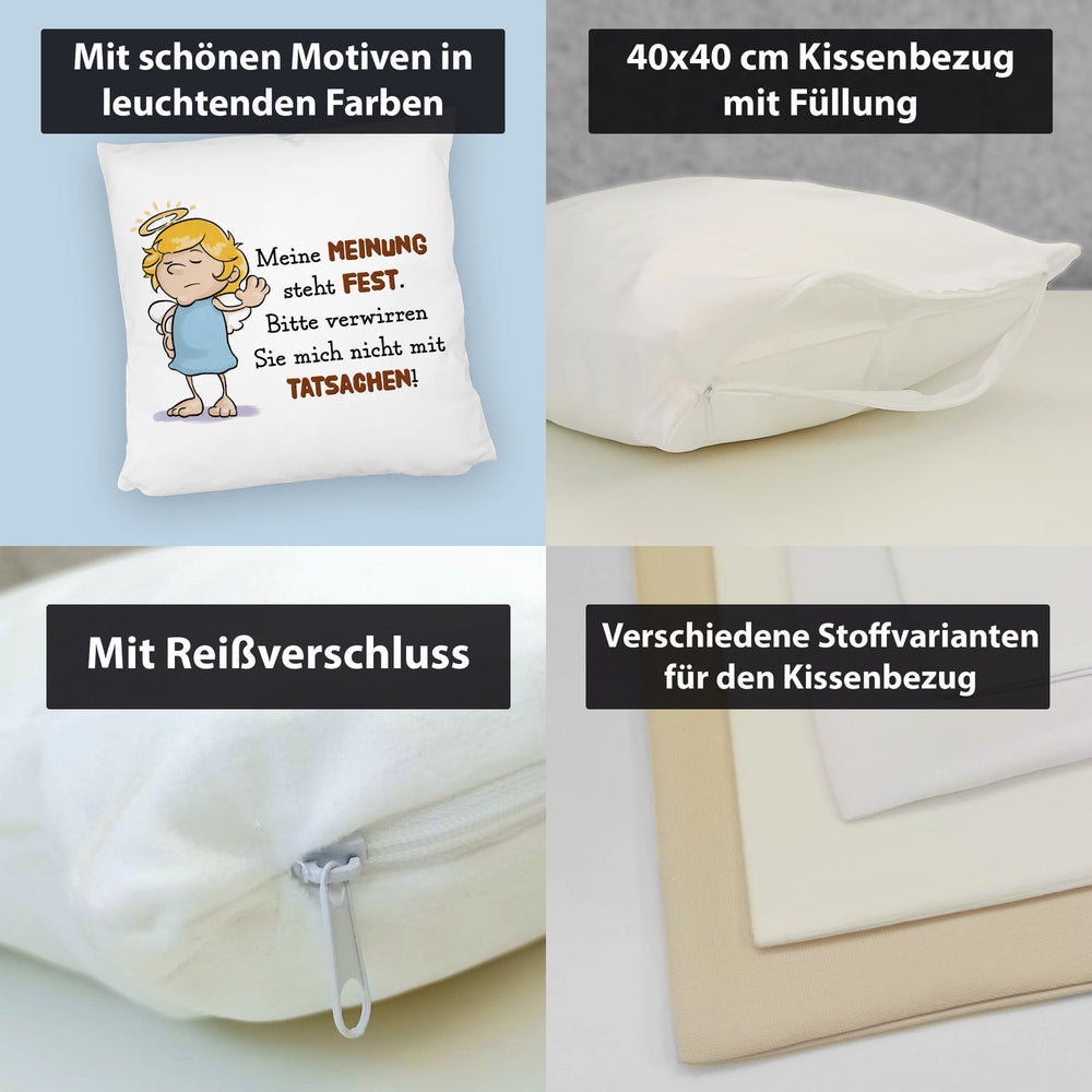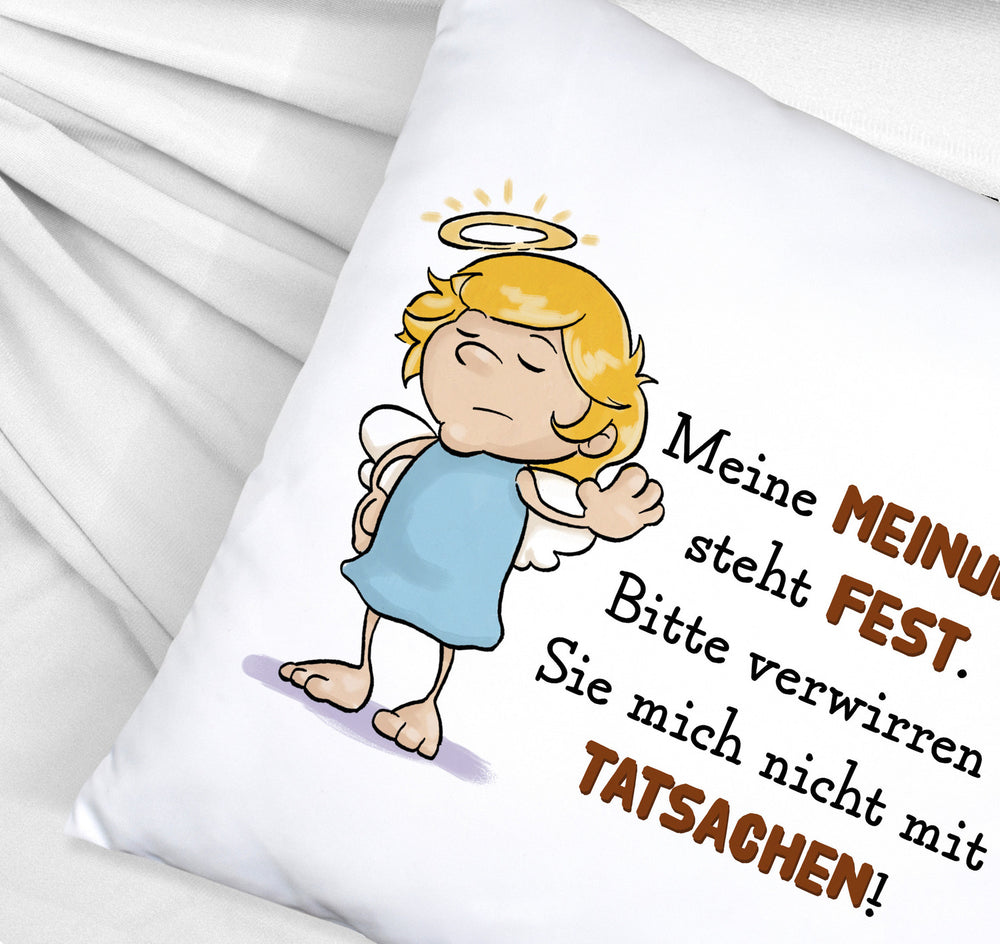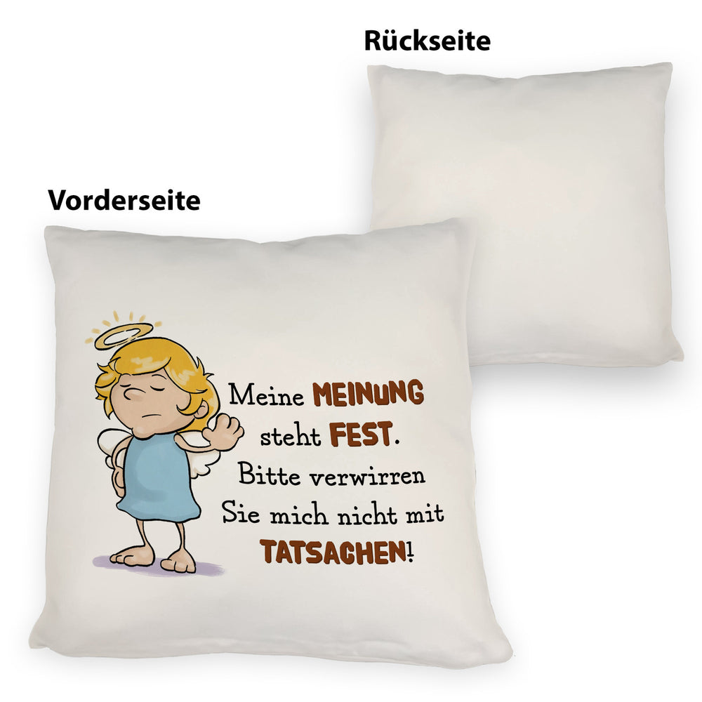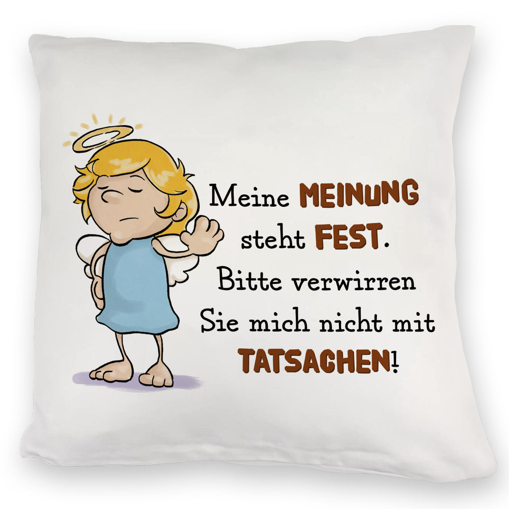 - Dieses neckische Kissen mit Engel Motiv ist eine fantastische Geschenkidee für jeden Scherzkeks zum Geburtstag. Auf dem Artikel steht der witzige und ironische Spruch: Meine Meinung steht fest. Bitte verwirren Sie mich nicht mit Tatsachen!. Darüber hinaus haben Sie ein schönes Dekokissen.