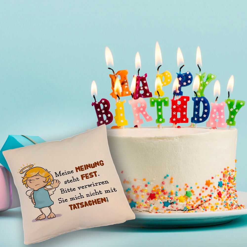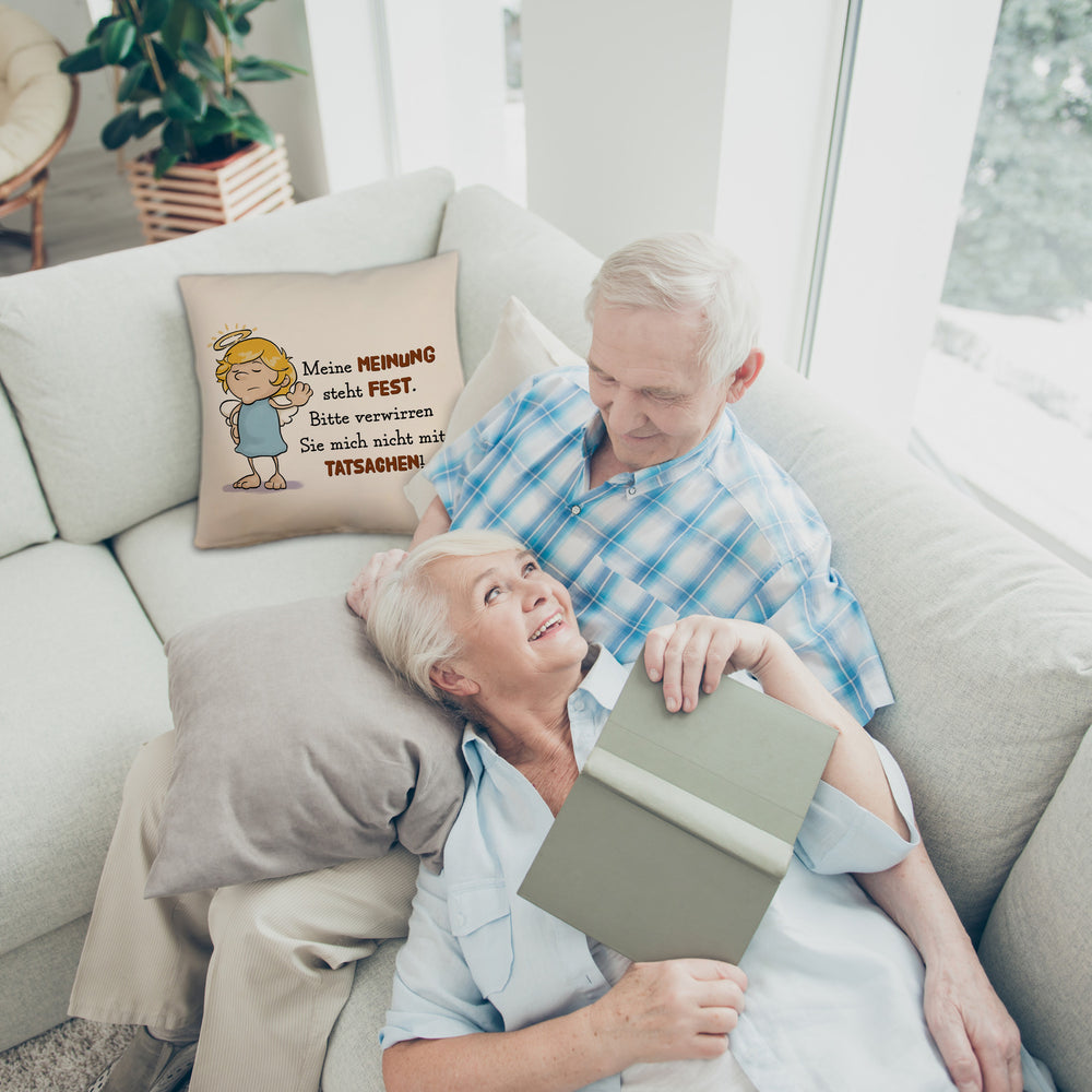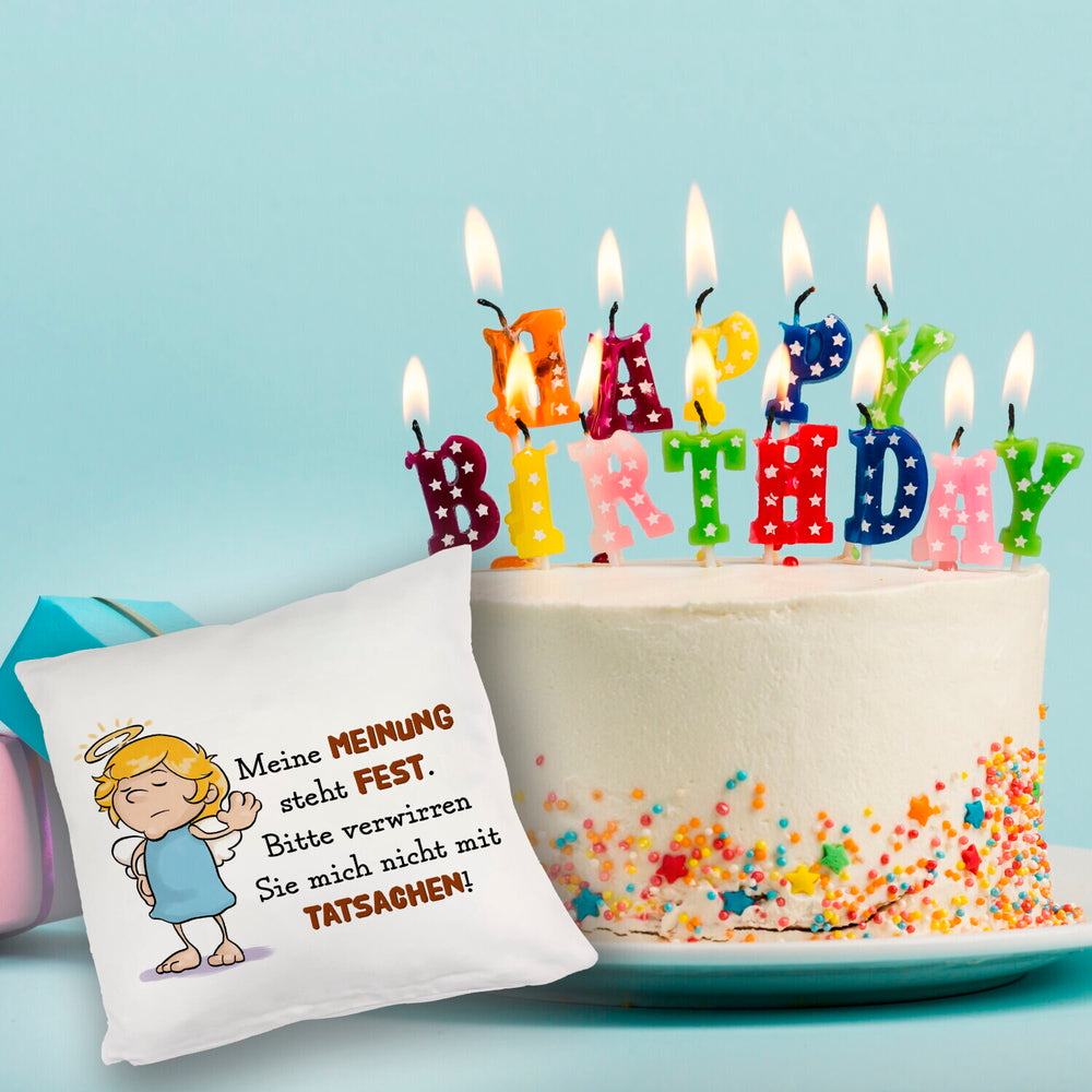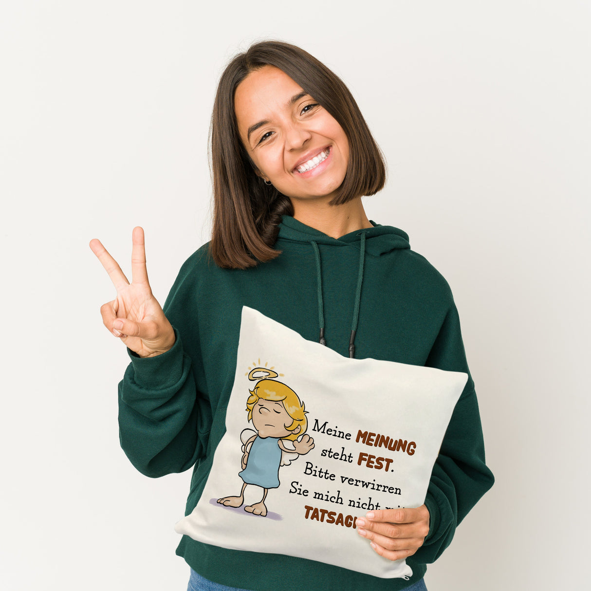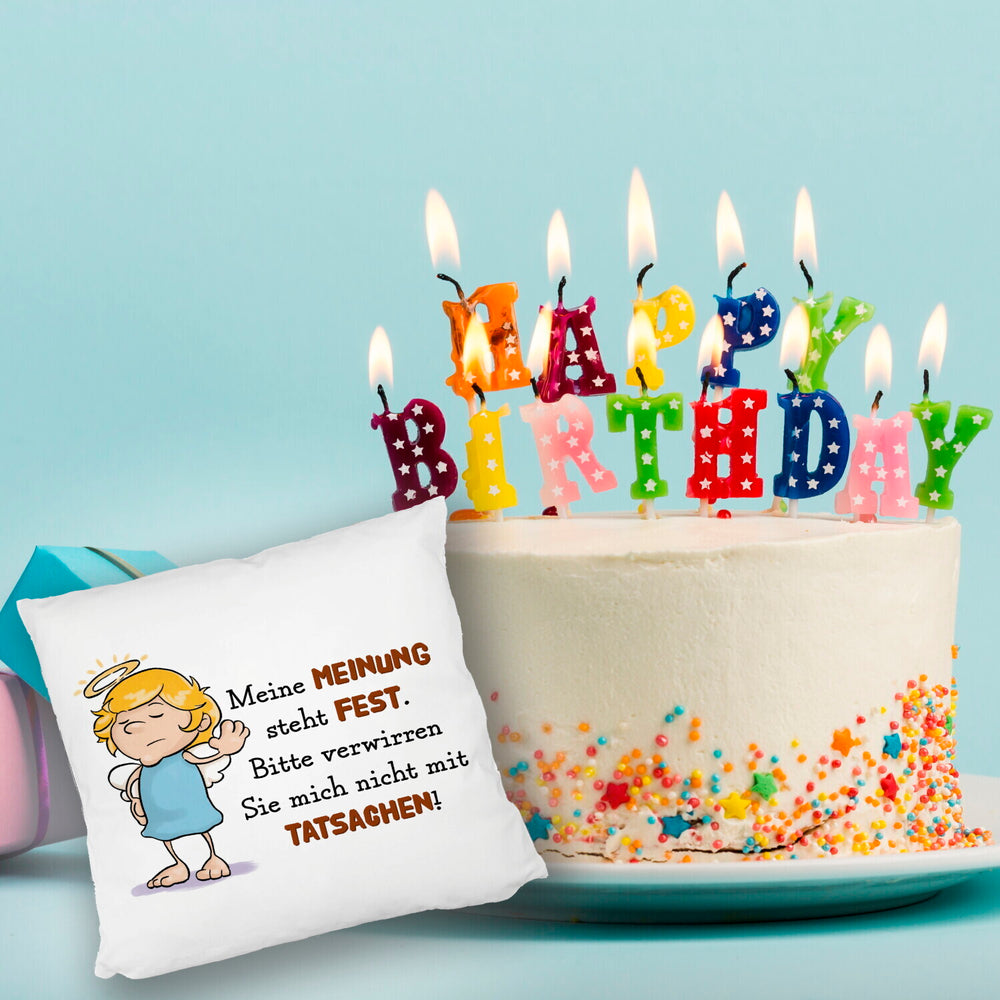 - Dieses neckische Kissen mit Engel Motiv ist eine fantastische Geschenkidee für jeden Scherzkeks zum Geburtstag. Auf dem Artikel steht der witzige und ironische Spruch: Meine Meinung steht fest. Bitte verwirren Sie mich nicht mit Tatsachen!. Darüber hinaus haben Sie ein schönes Dekokissen.